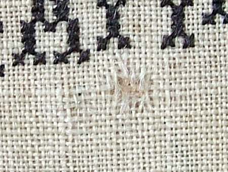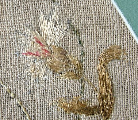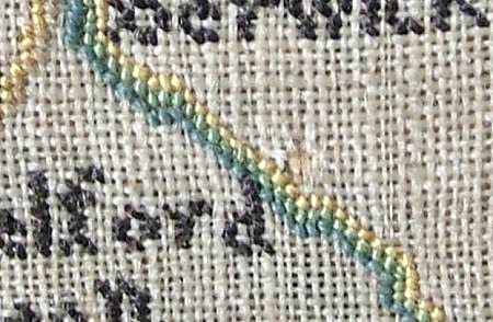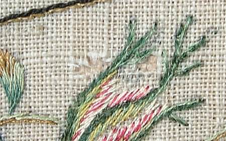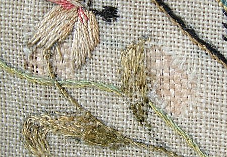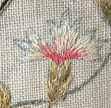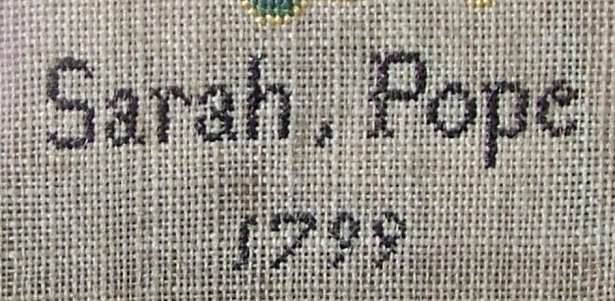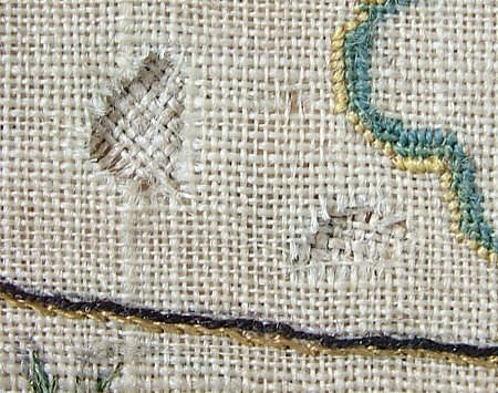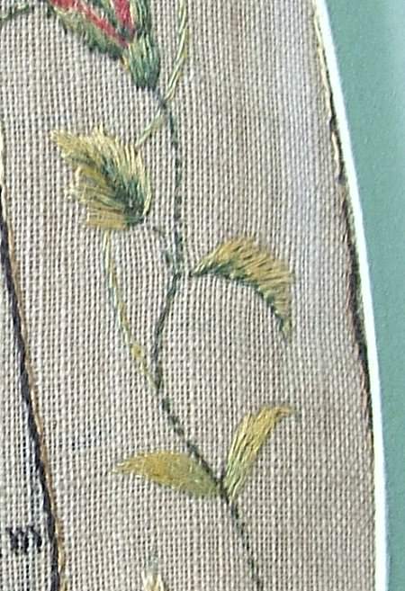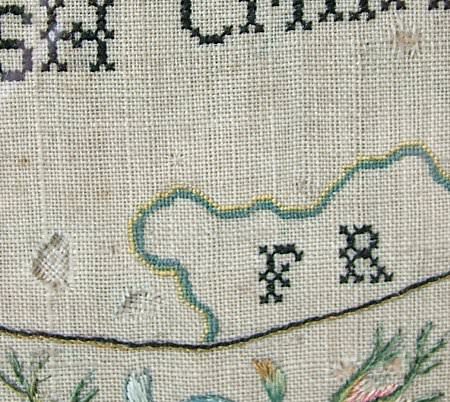 The sampler is worked in fine silk on linen ground, in a variety of stitches. Meandering floral border.