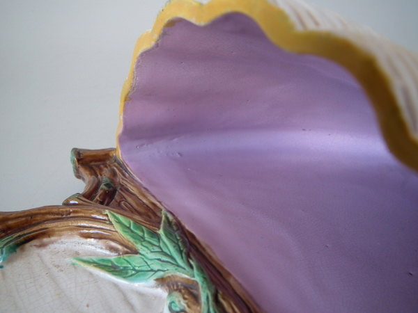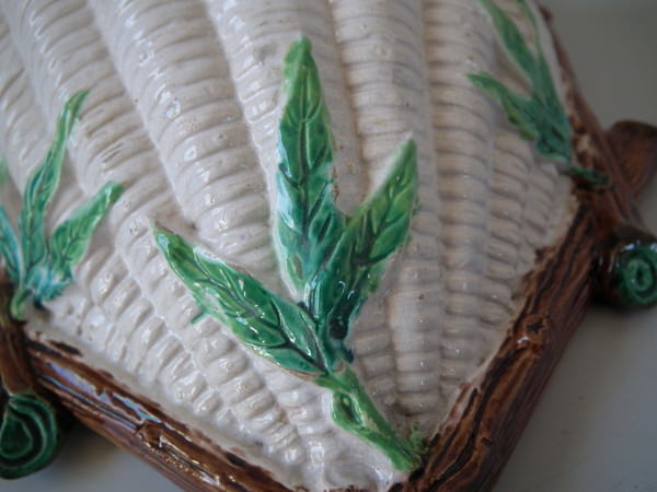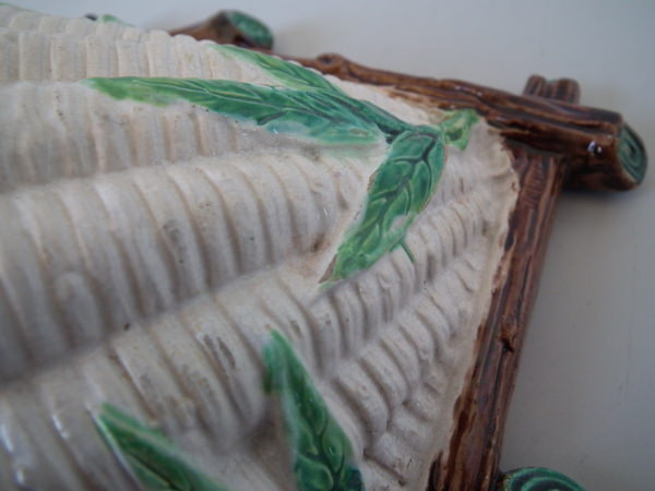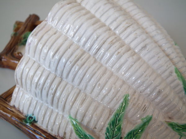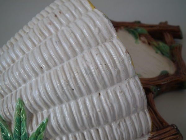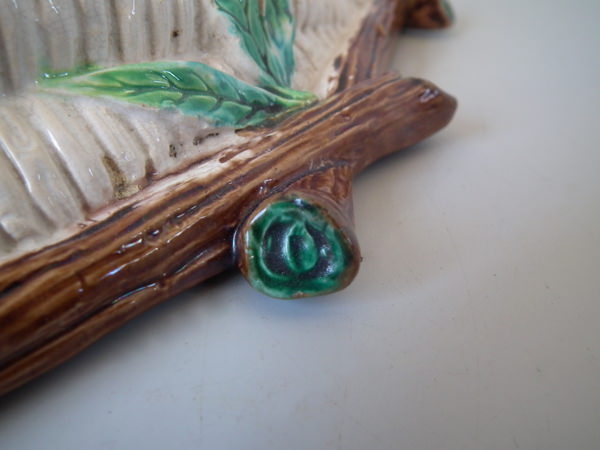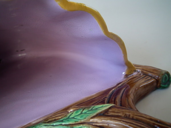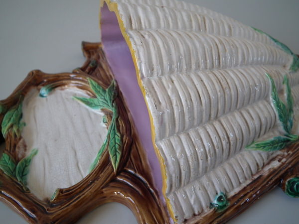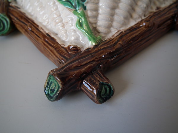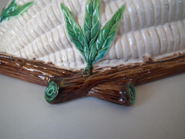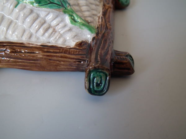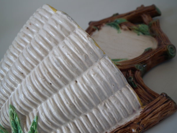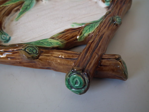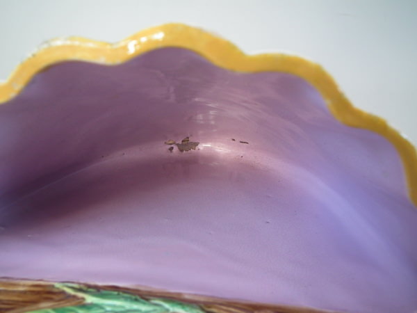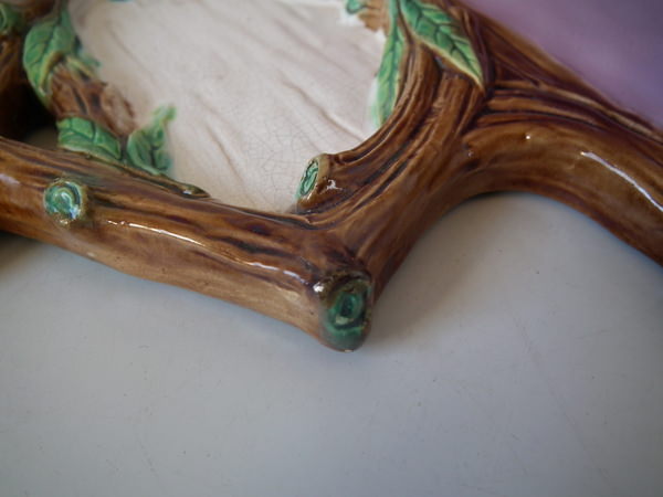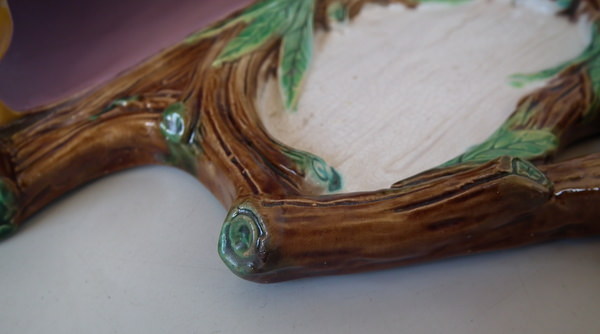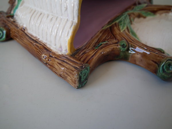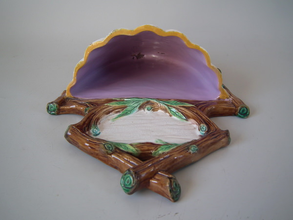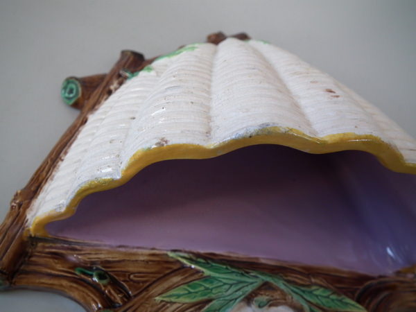 Victorian, circa 1870. 10.8ins high, 7.5ins wide, 3ins depth. George Jones Majolica wall pocket which features a basket with branch surround.
