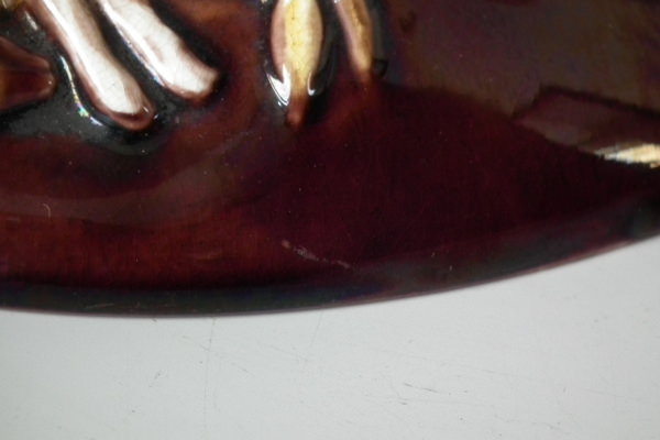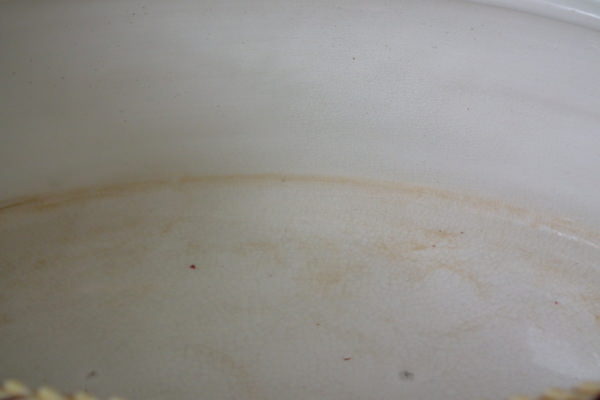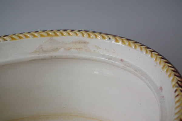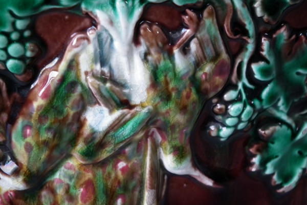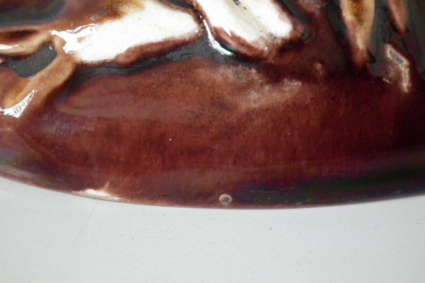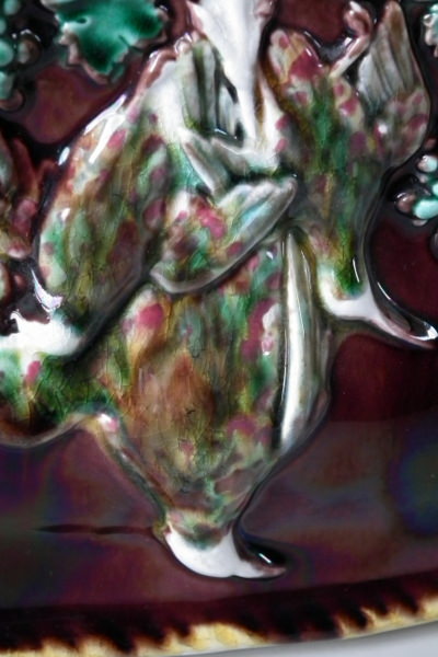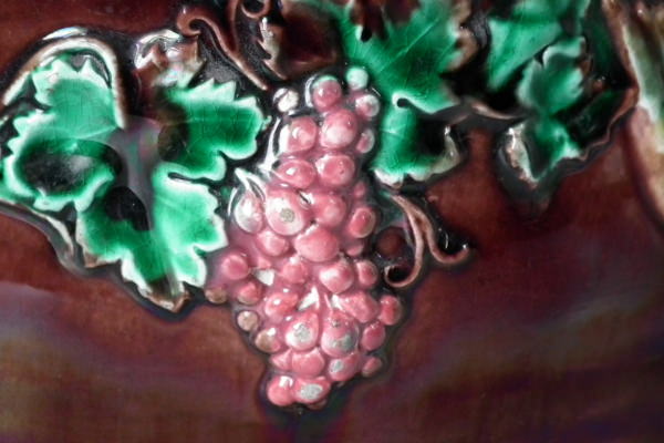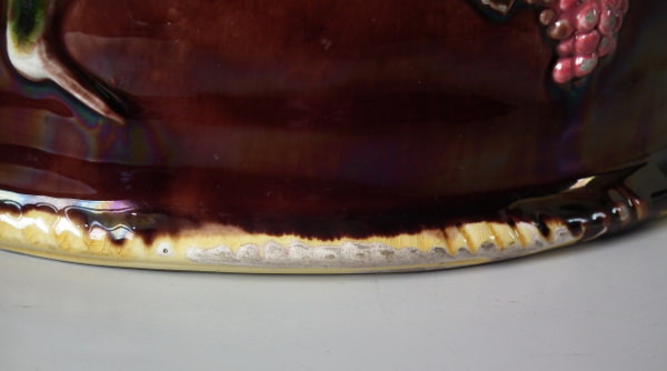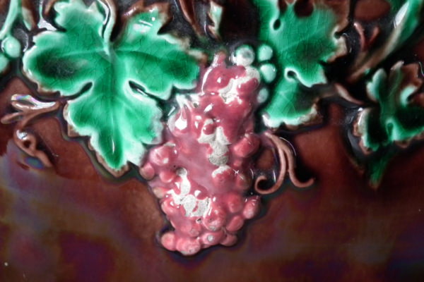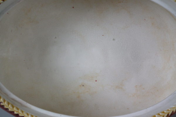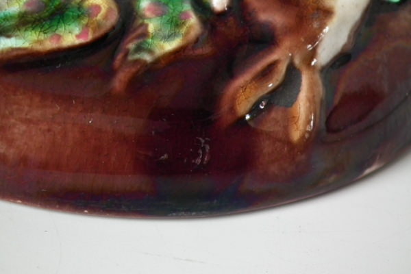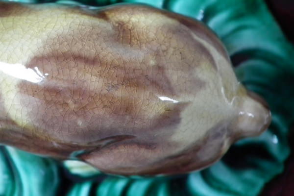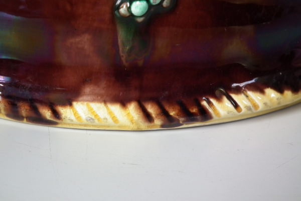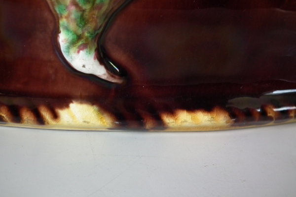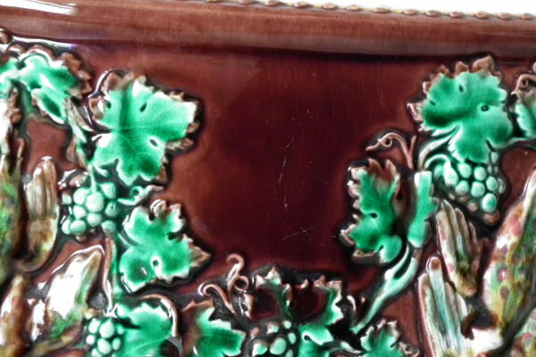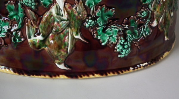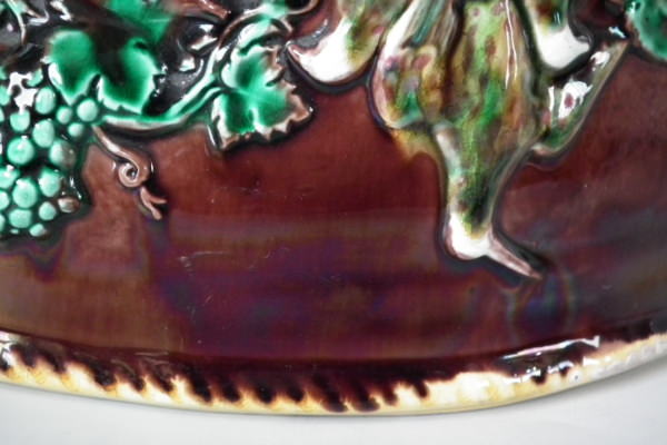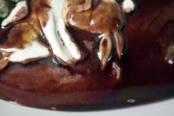 Victorian, circa 1878. 6.9ins high, 12.6ins wide, 9.3ins depth. Wedgwood Majolica game pie dish which features a crouching rabbit handle, trailing grape vine and hanging game around the sides.