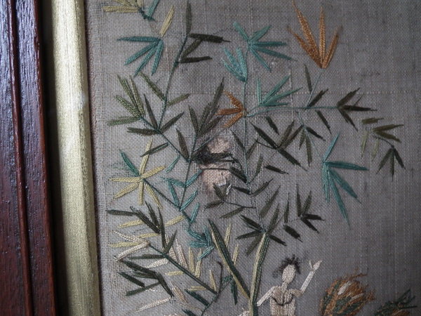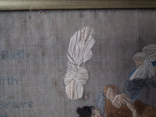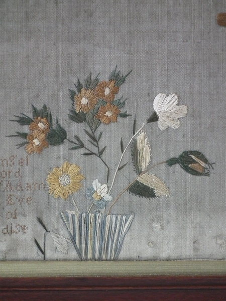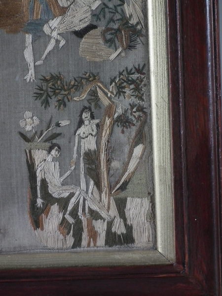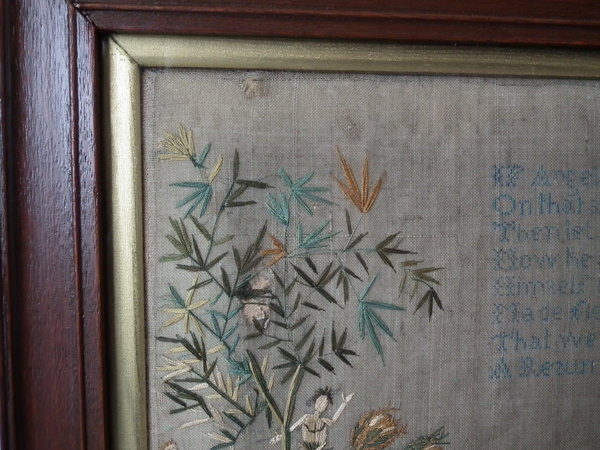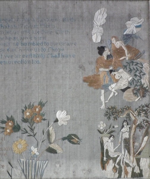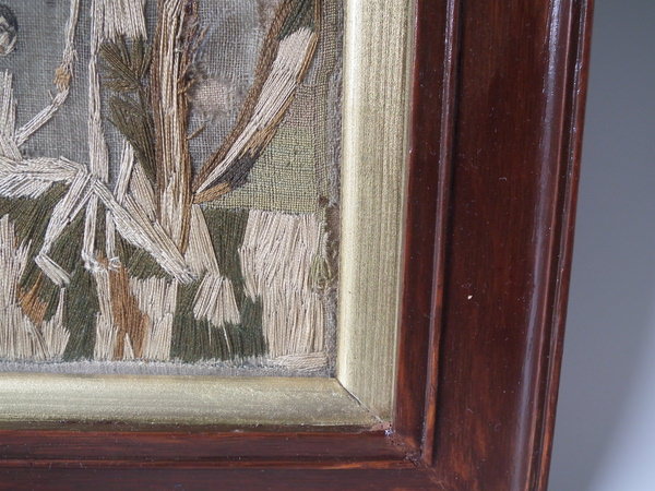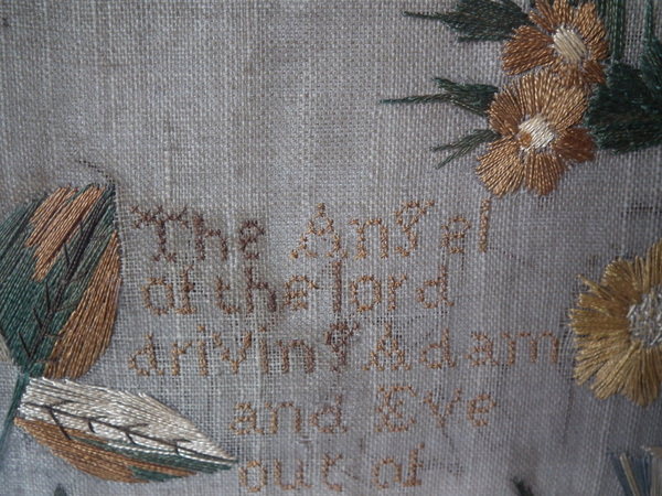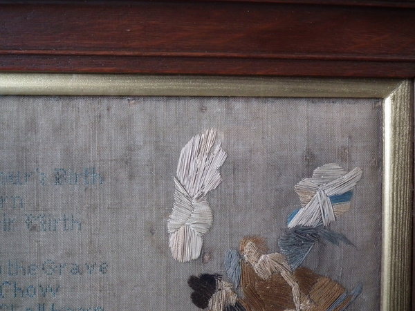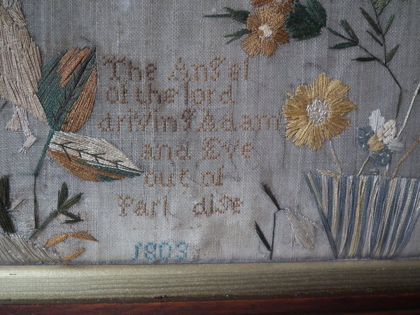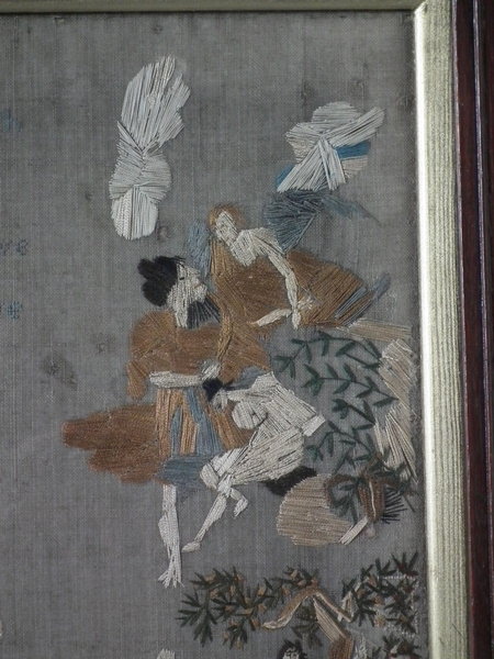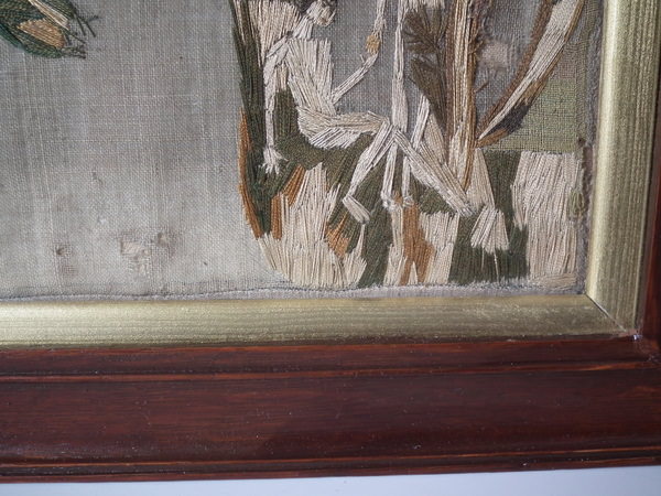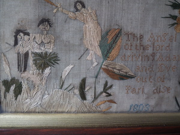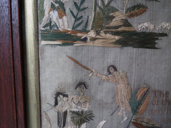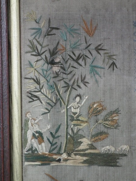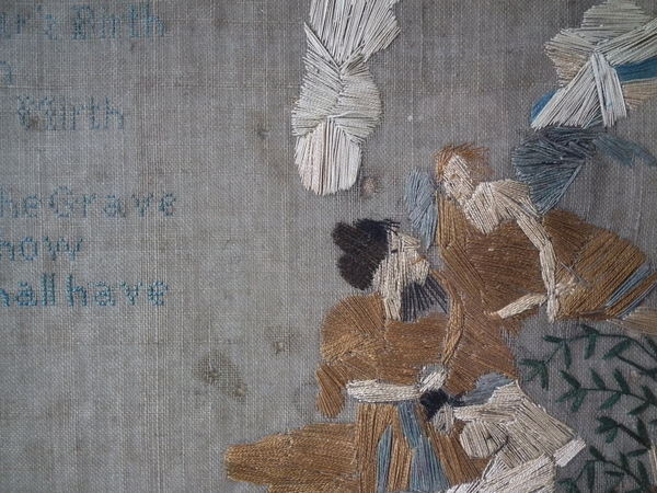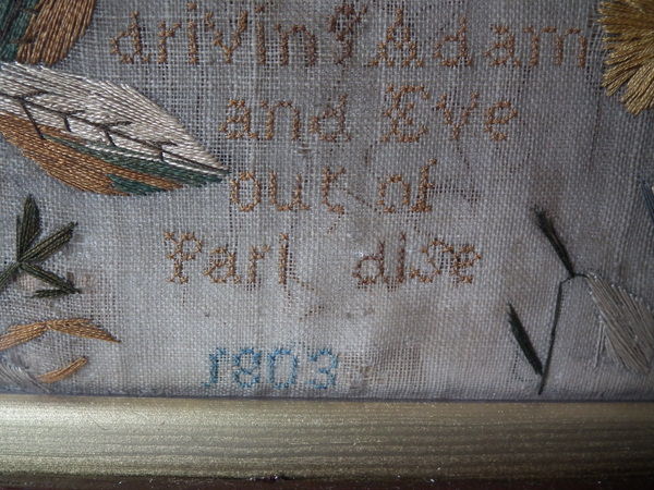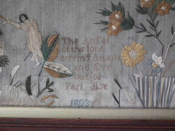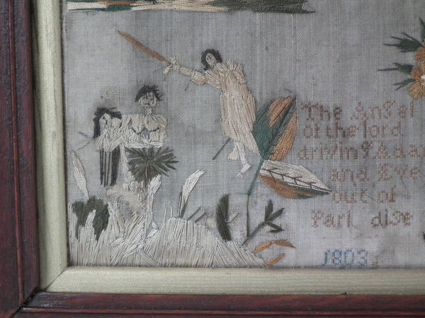 George III, dated 1803. 13ins by 17.25ins wide. 1803 Silkwork sampler with Biblical scenes.