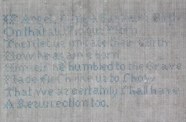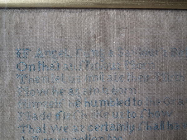 The sampler is worked in silk on linen ground, in a variety of stitches.