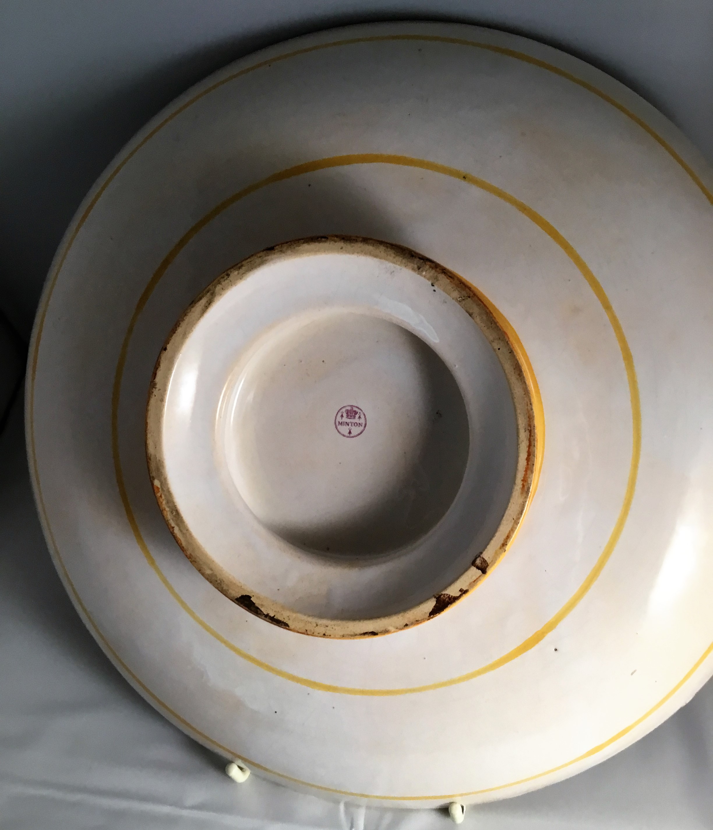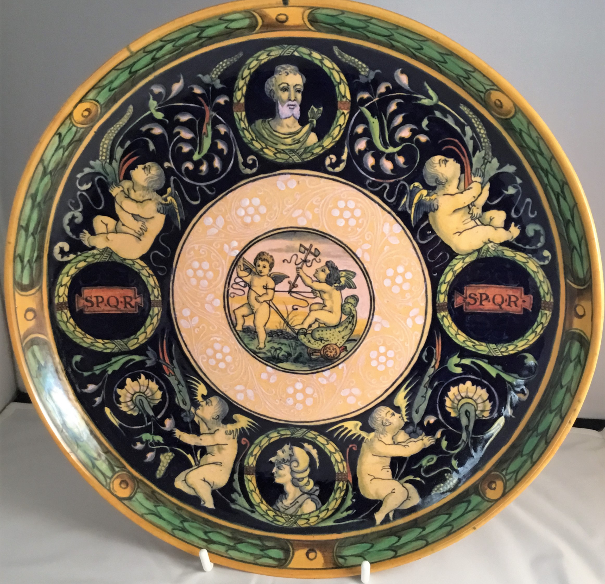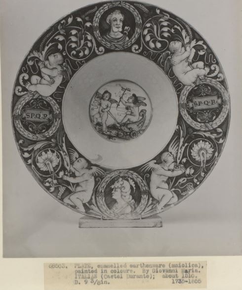 Here is an example of an Italian Renaissance tin-glazed maiolica dish from the South Kensington Museum Collection (today’s Victoria and Albert Museum), copied by Minton. The copy is exact, even to the misaligned SPQR medallions. Minton added a border increasing the diameter of the plate from 9 3/4ins to 10.4ins. The museum called it a PLATE. Others call it a dish, a bowl, or a tondino.