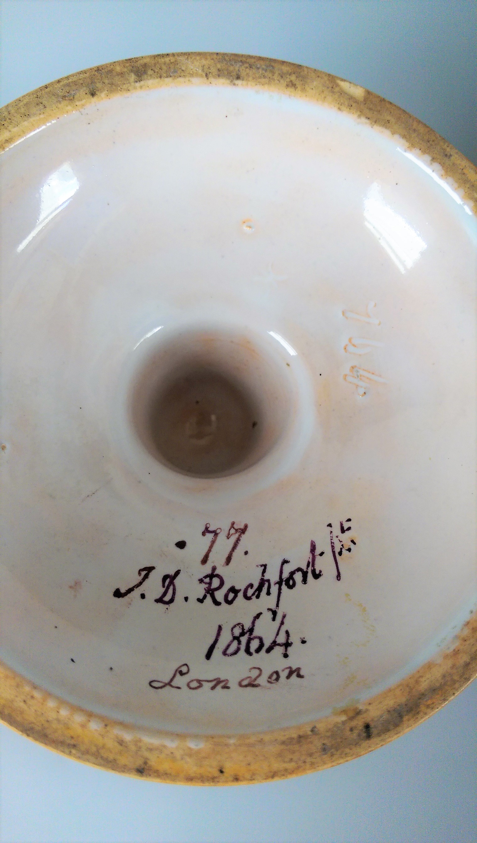 Lessore’s employment with Minton & Co. was, we suspect, uneasy. Lessore appears to have insisted on signing his pieces, sometimes choosing a blank with minimal Minton marks. He painted his signature or initials often with the E reversed, in this case following the L.