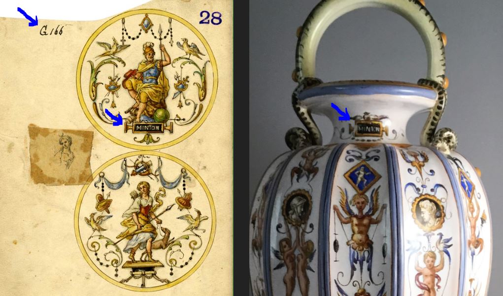 In the case of the snake handle vase below, while lacking all marks to the base, ‘MINTON’ painted prominently to the neck, and design G166 in the Minton Archive, leaves no doubt as to the maker.