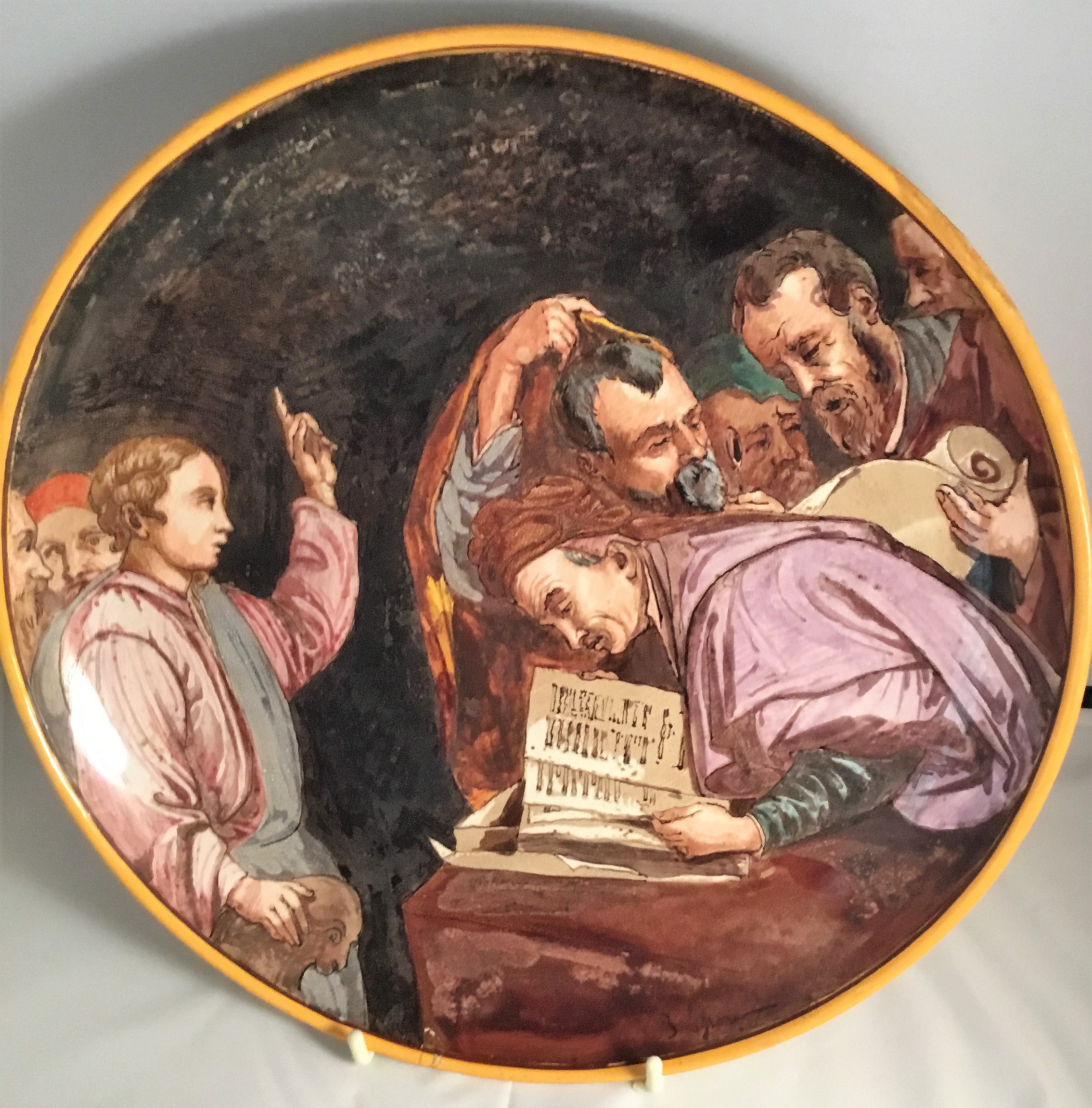 The tondino is decorated with brush-painted enamels on opaque whitish glaze, istoriato style.