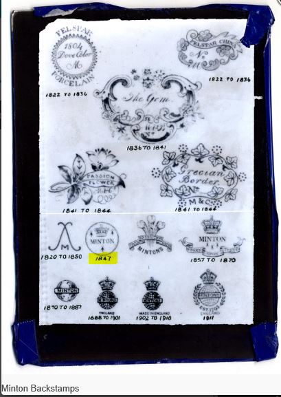 The printed factory date mark for 1847 indicates Lessore was at this time working for Minton and Co. This relationship is known to have foundered soon after. Maybe Minton did not appreciate Lessore’s name on everything he painted for the company.