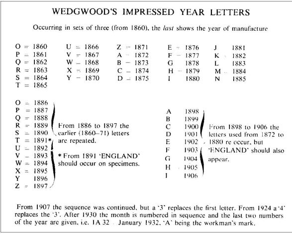 Wedgwood were also reasonably consistent. Most pieces were marked with an impressed makers mark. Many had the three letter date code in addition.