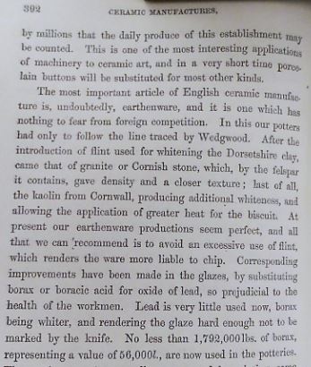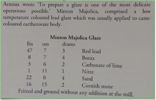 He did, however, state, “Lead is very little used now”, intimating that borax had significantly replaced lead in the industry. Judging by the proportion of Red Lead to Borax in Arnoux’s formula, above, approximately 6:1, this would appear to be a slight exaggeration.