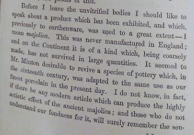 On page 395 he speaks of Minton’s desire to revive 16th century majolica [meaning tin-glaze Renaissance maiolica]: