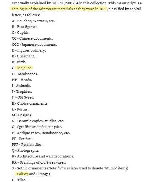 Texts referencing Minton Palissy ware and Minton Majolica as different products