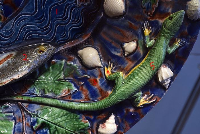 Five colors, Palissy ‘follower’ [imitator], circa 1600AD. The two additional colors are blue from cobalt oxide, and grey from blended oxides.