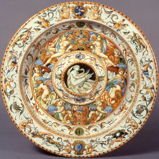 Italian Renaissance tin-glazed maiolica (dip, dry, paint, fire), circa 1600AD, painted with enamels in the grotesque style.