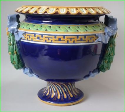 The public however came to call this ‘majolica’ also. Now (1855) we have two distinct products being called by the same name. Minton’s ‘Palissy ware’ is today known as ‘Victorian majolica pottery’. Lead-glazed molded earthenware objects for the growing merchant classes, both useful and decorative, in styles both classical and later more naturalistic. Made between 1851 and 1900.  Characterised by rich vibrant colors, elegant, richly sculpted sometimes whimsical even humorous designs from conservatory tables to flower holders.