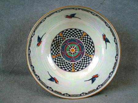 Mother of pearl interior with a checker rosette center, surrounded by magpies in flight.