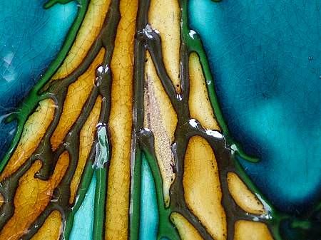 Circa 1910. 12.5ins high. Pair Minton Secessionist No.1 vases of stretched barrel like form. Blue ground with ochre and white slip-trailed decoration. Black and green tube lined outlines. Highly decorative with striking colors.