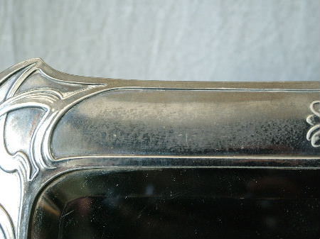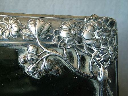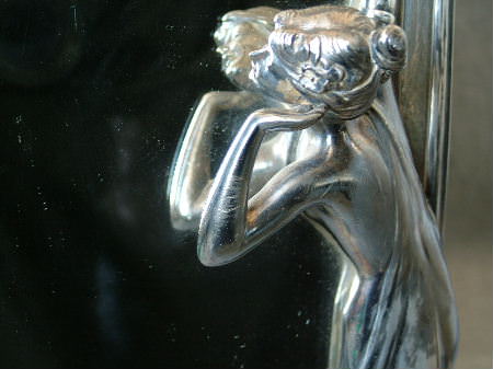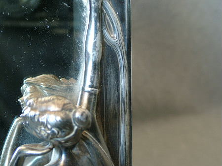 Circa 1910. 11ins wide, 14.5ins high. WMF 'Echo' toilet easel mirror, officially titled ‘The First Cuckoo’. Frame has a maiden on the right hand side, dressed in a flowing robe, leaning in front of the mirror, with her left hand to her ear. Her face reflects in the mirror. Flowers decorate the top right and bottom left corners.