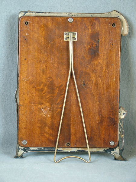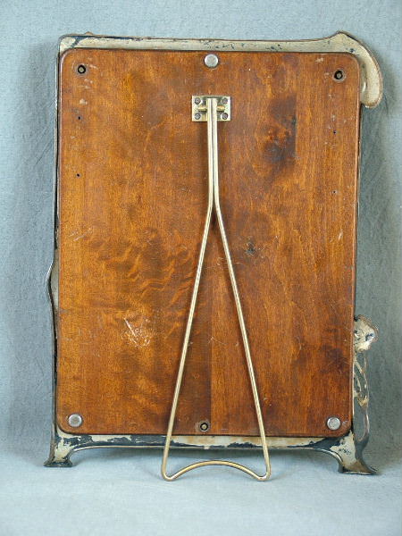 The frame holds the original mirror and has the original wooden backing. An arm is attached to the wooden backing to form a support.