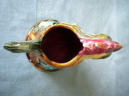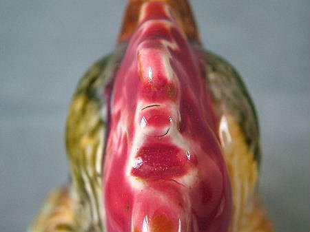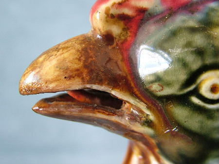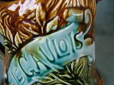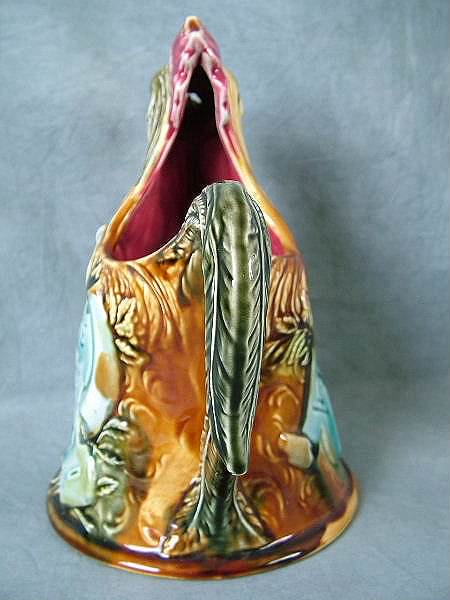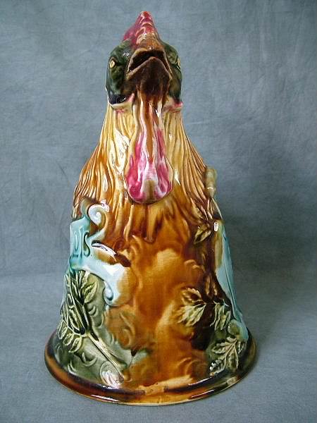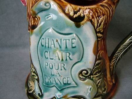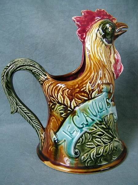 Circa 1900. 8.5ins high. Onnaing Majolica novelty figural pitcher modeled as a cockerel. On its left side is a shield inscribed 'CHANTE CLAIR POUR LA FRANCE'