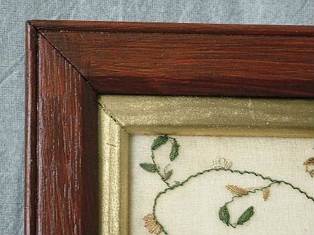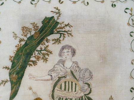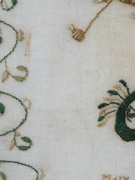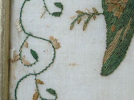 The sampler is worked in silk on fine linen ground.
