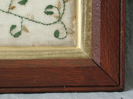 George III, dated 1816. 17.25ins by 12.5ins wide. 1816 Silkwork Sampler by Mary Atkinson. Framed in an old wood frame with gilt slip and glass.