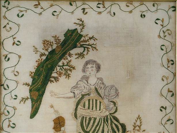 Finely embroidered motif of Britannia (upper torso and head is drawn on the canvas, not stitched) standing at the shore below a tree, sailing ship in the background.