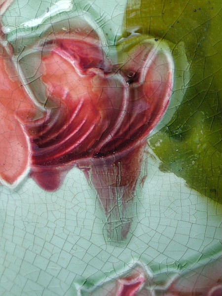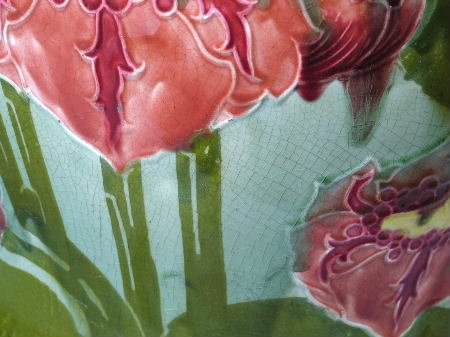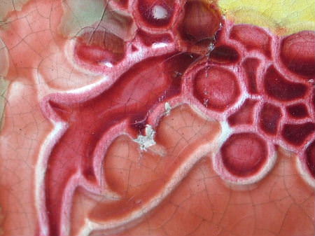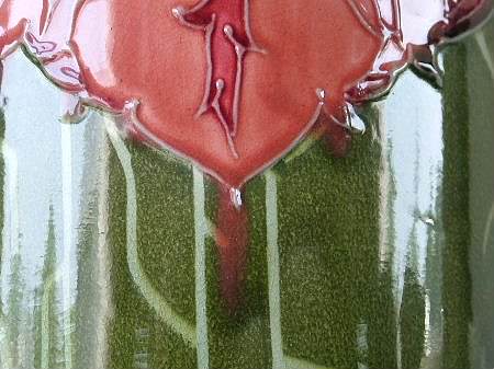 Decorated with tube lined stylized pink flowers with yellow centers.