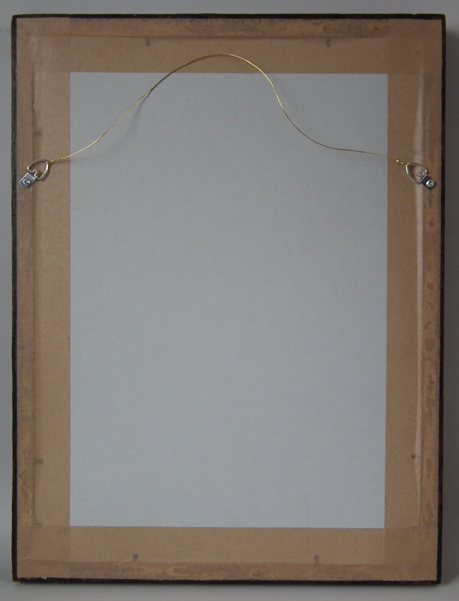 Mounted (Couch-stitched) onto calico over acid-free mountboard. Sealed with acid-free backboard and tape.