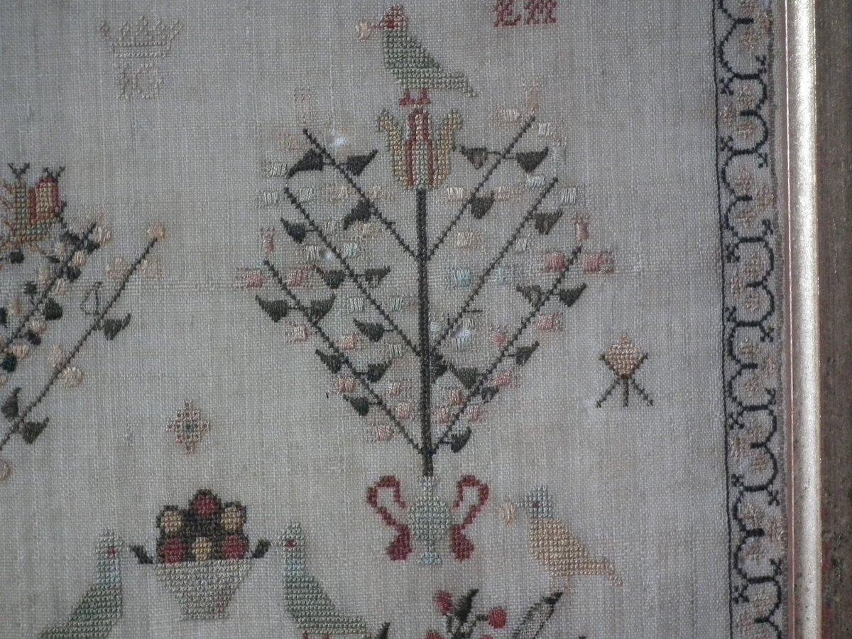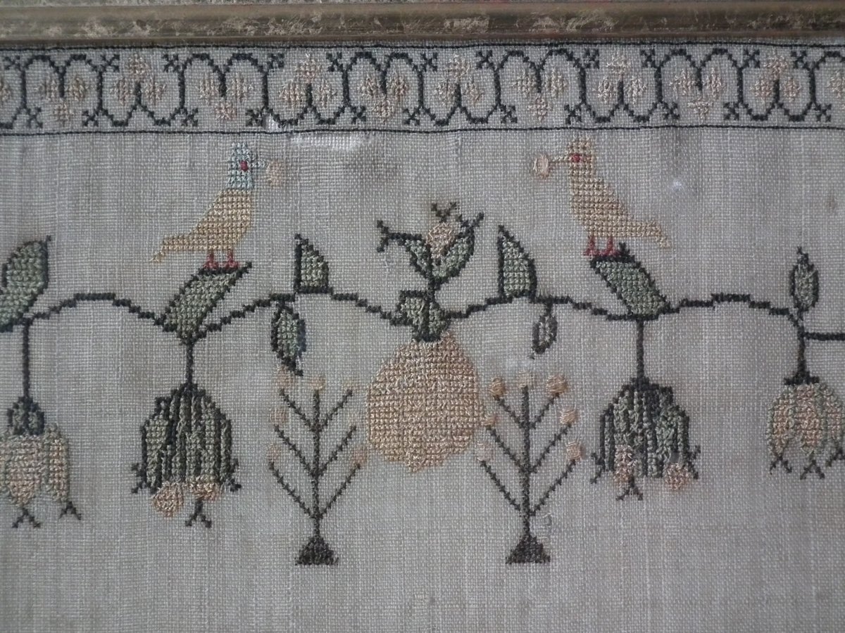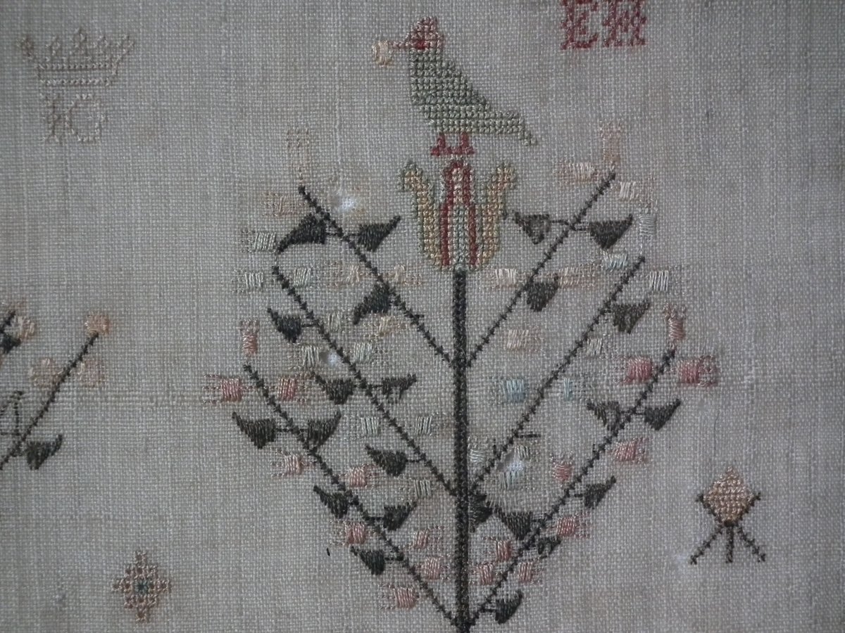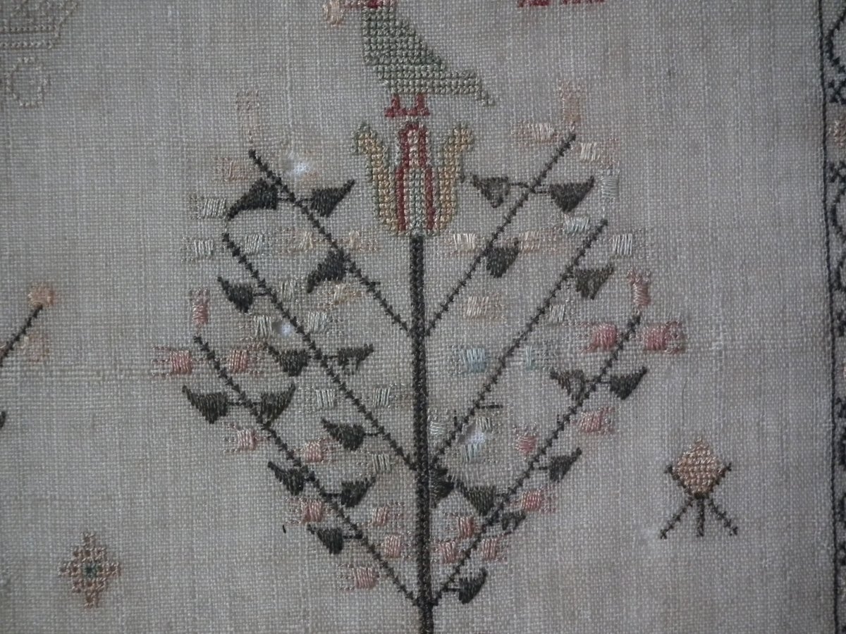 The sampler is worked in silk on a very fine ground, in a variety of stitches.
