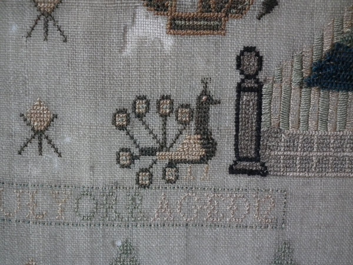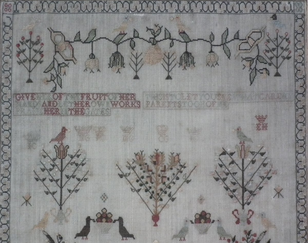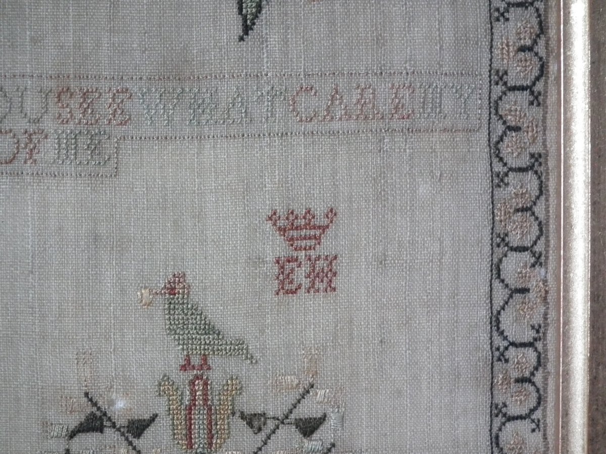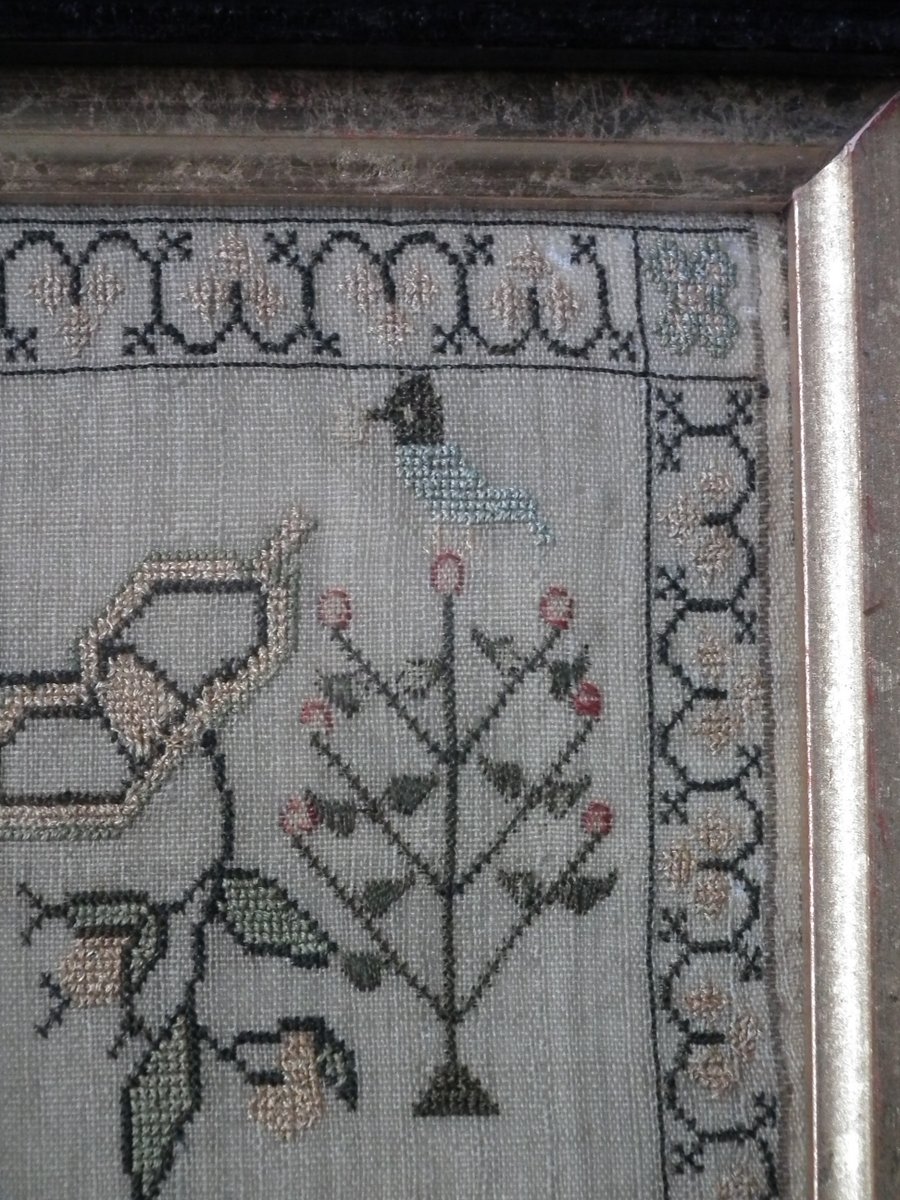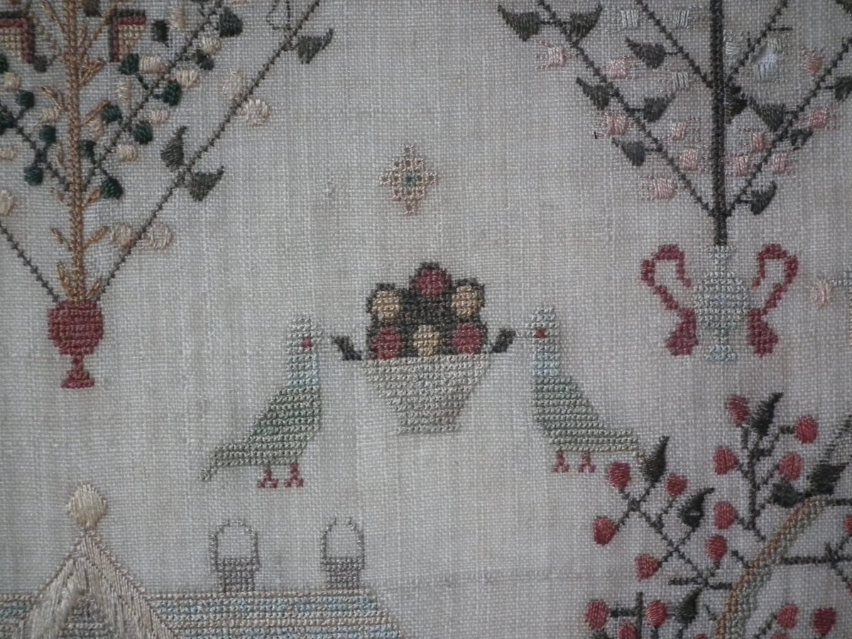 The sampler is worked in silk on a very fine ground, in a variety of stitches.
