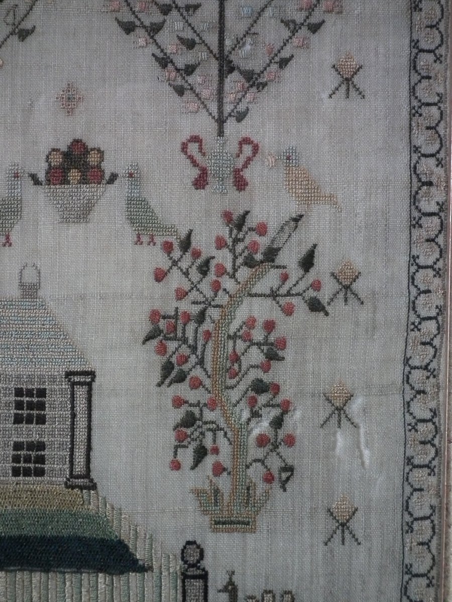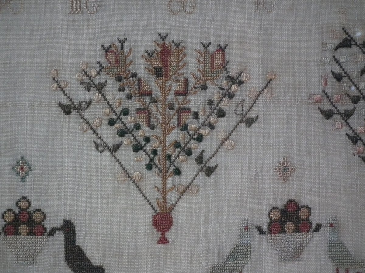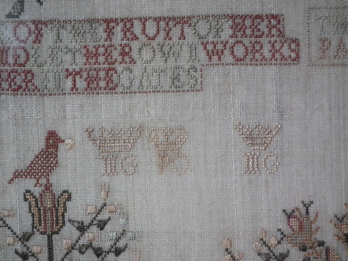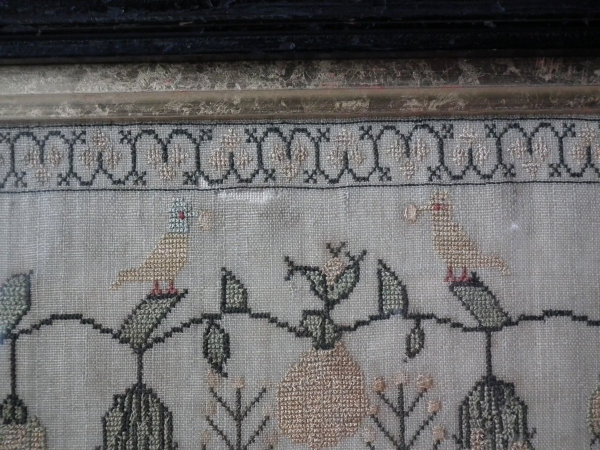 The sampler is worked in silk on a very fine ground, in a variety of stitches.