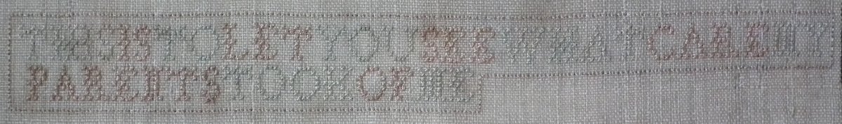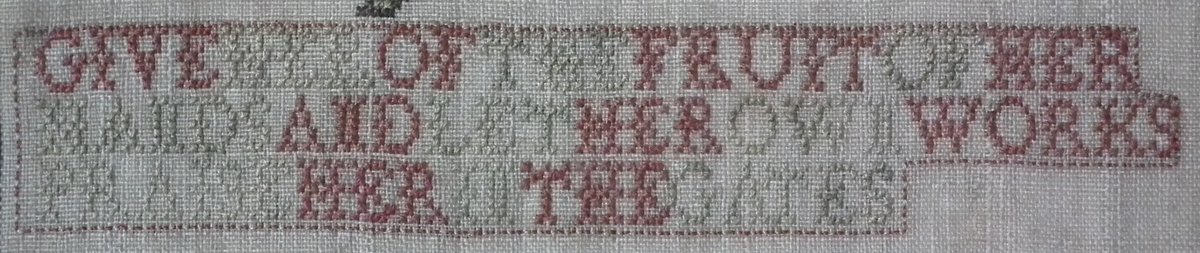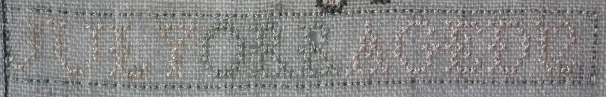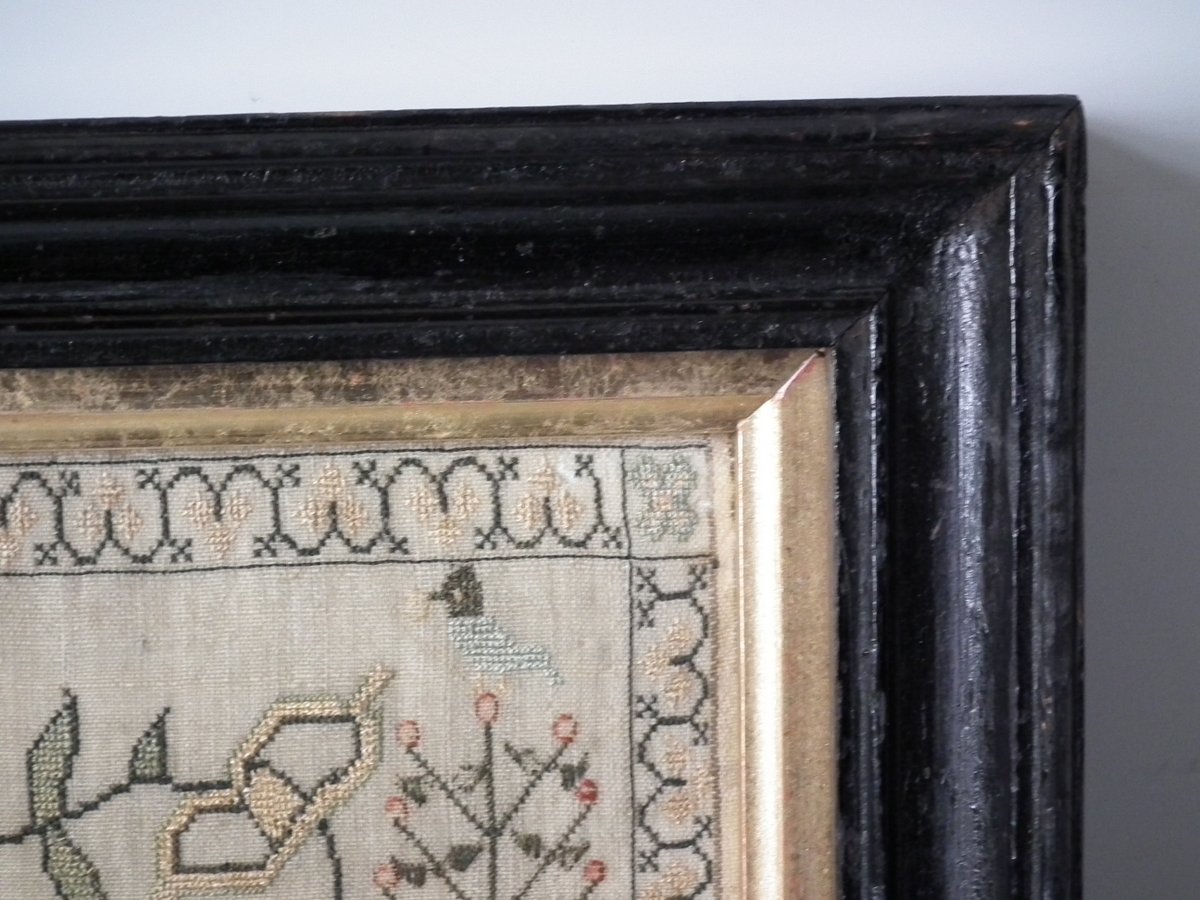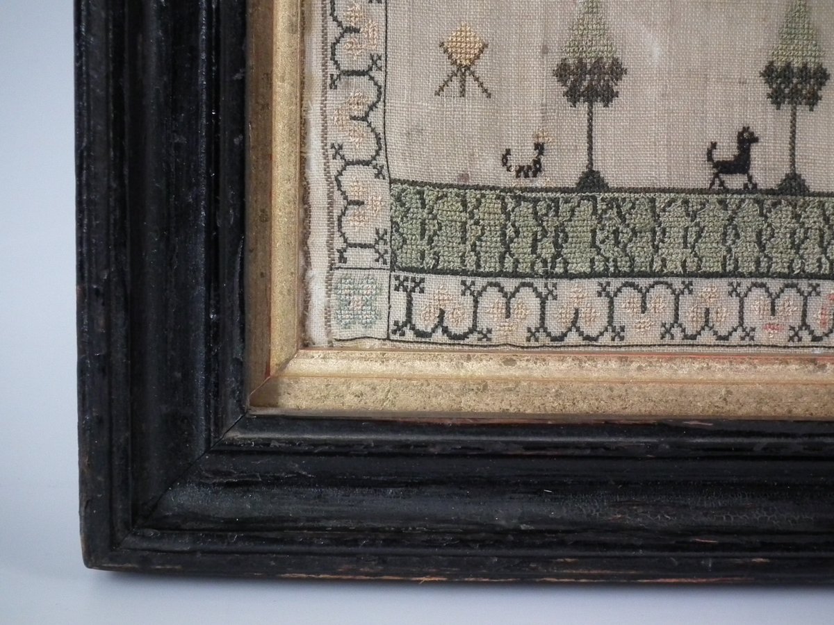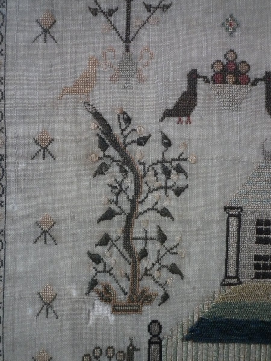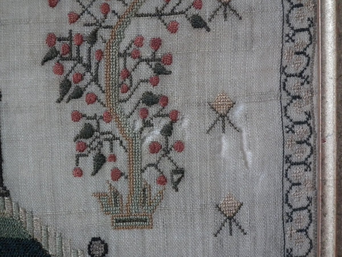The sampler is worked in silk on a very fine ground, in a variety of stitches.