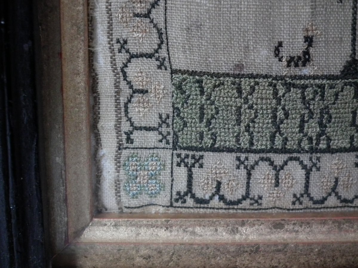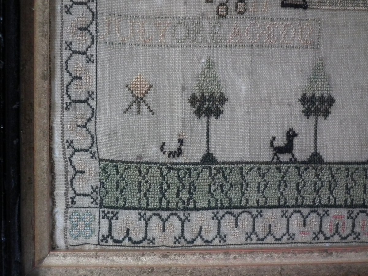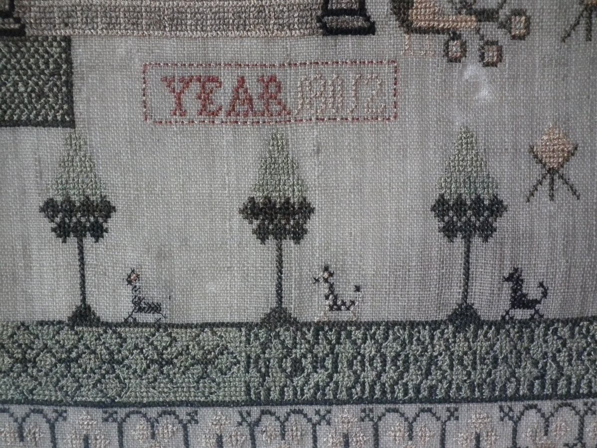 George III, dated 1812?. 18ins. By13.25ins wide. Antique 1812 House Sampler by July Orr. 1812 Scottish House Sampler by July Orr. Framed in an old, possibly original, mahogany frame with gilt slip and glass.