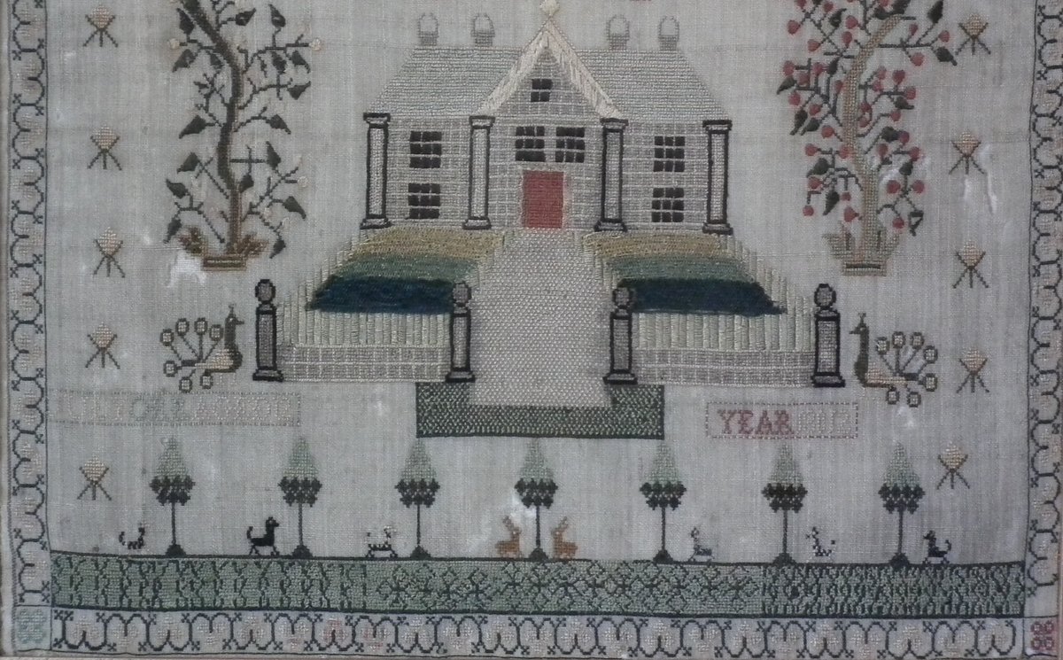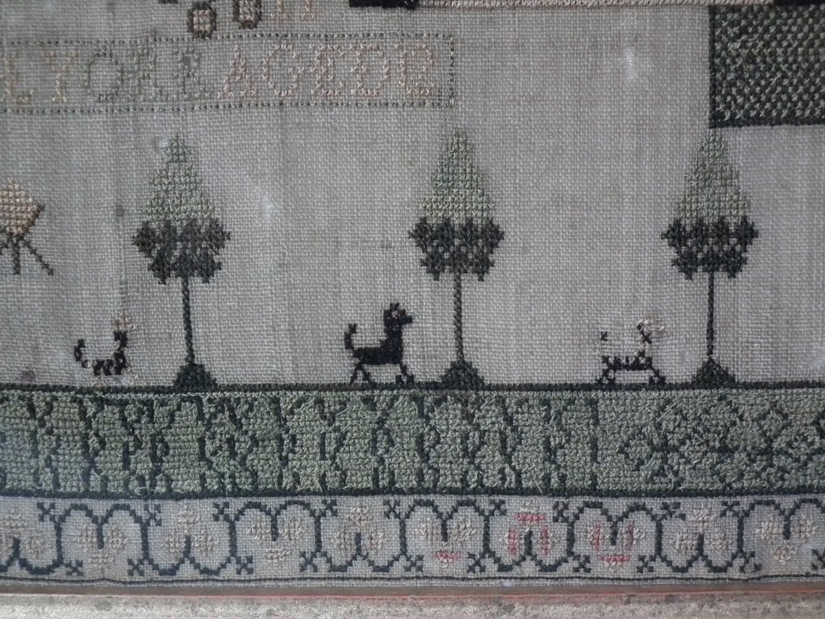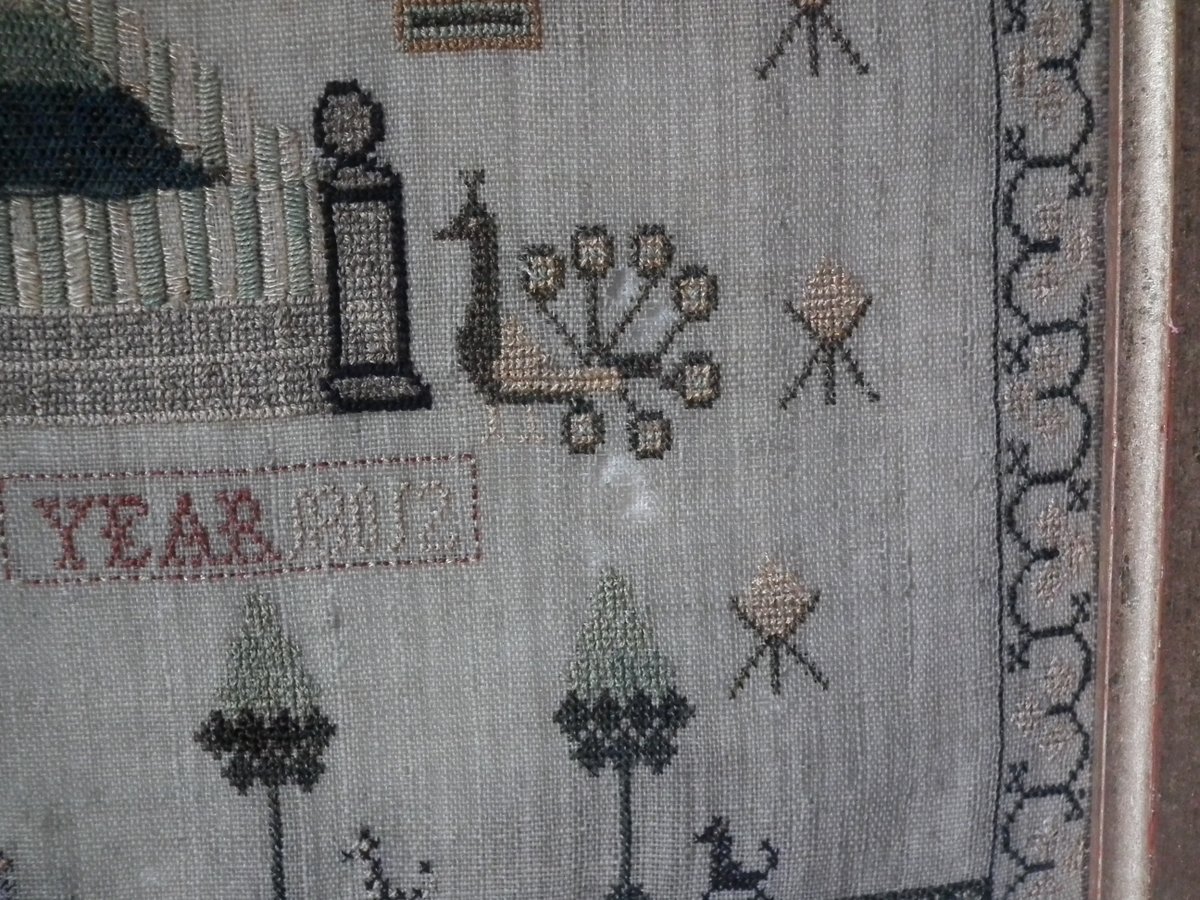 George III, dated 1812?. 18ins. By13.25ins wide. Antique 1812 House Sampler by July Orr. 1812 Scottish House Sampler by July Orr. Framed in an old, possibly original, mahogany frame with gilt slip and glass.