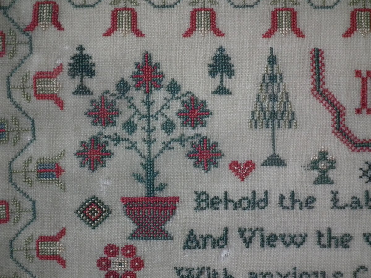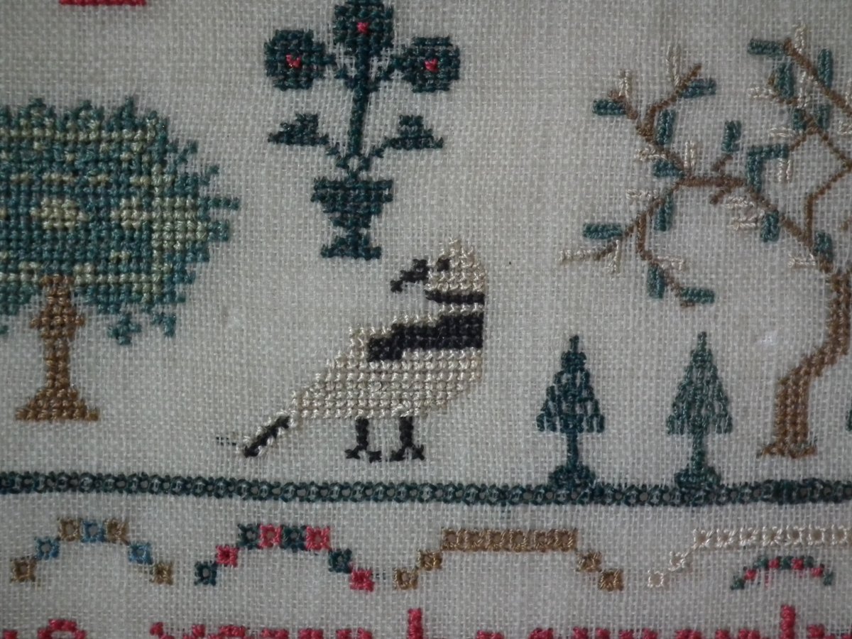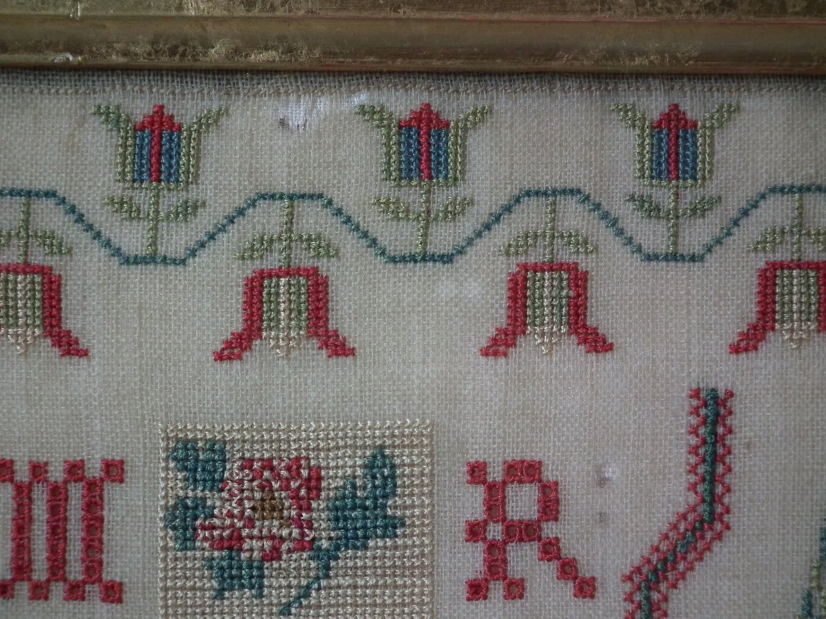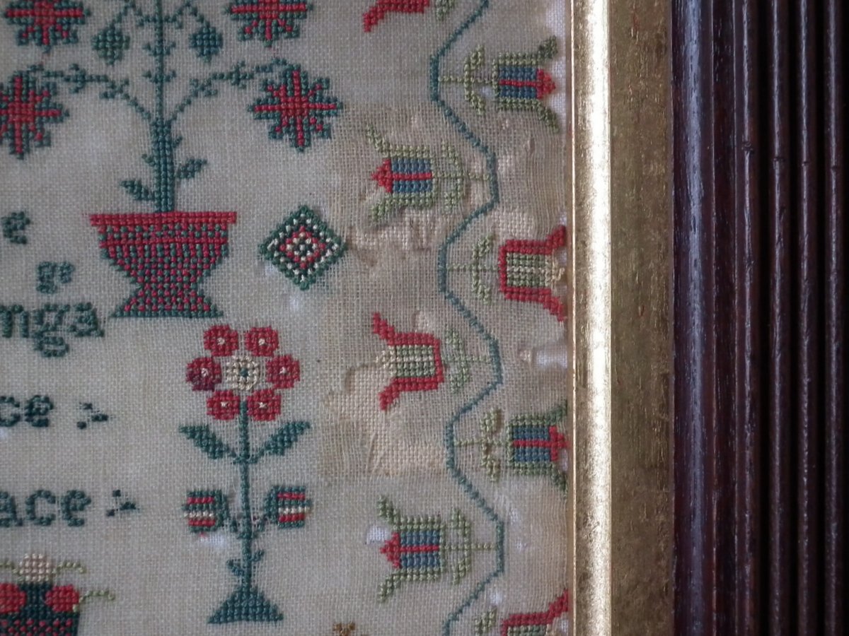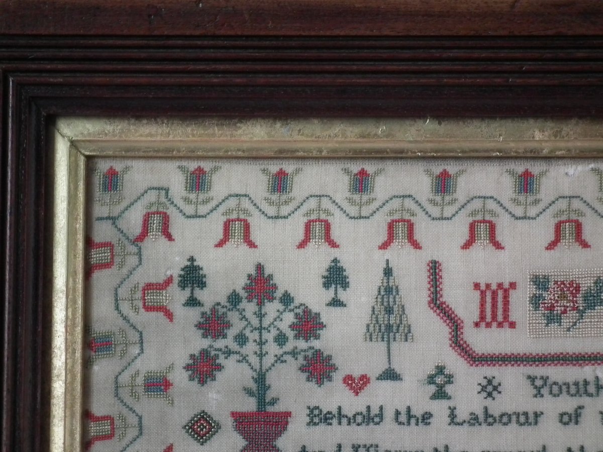 The sampler is worked in silk on linen ground, in cross stitch throughout.