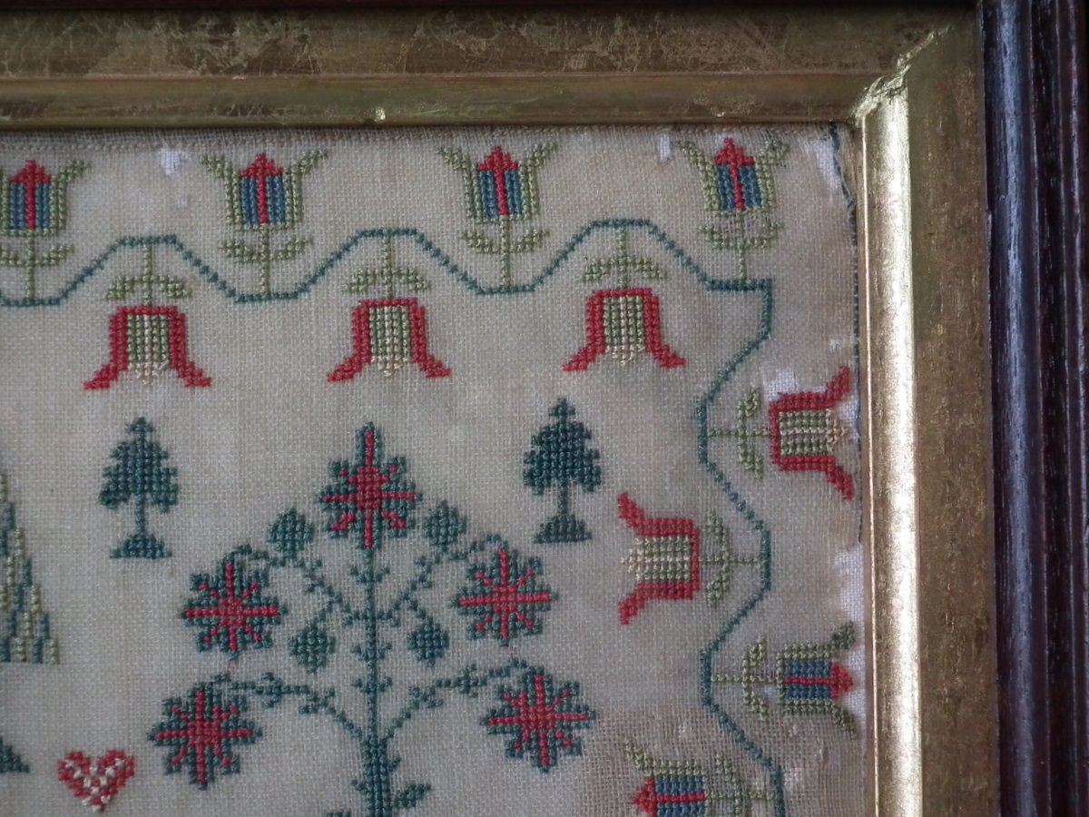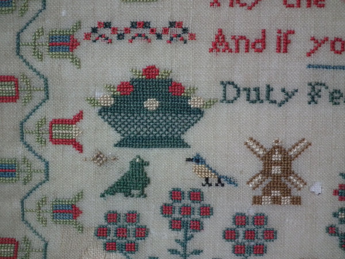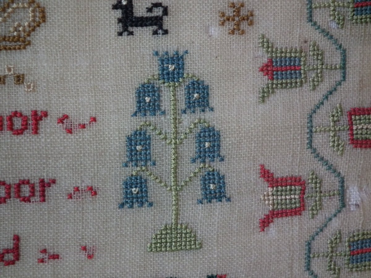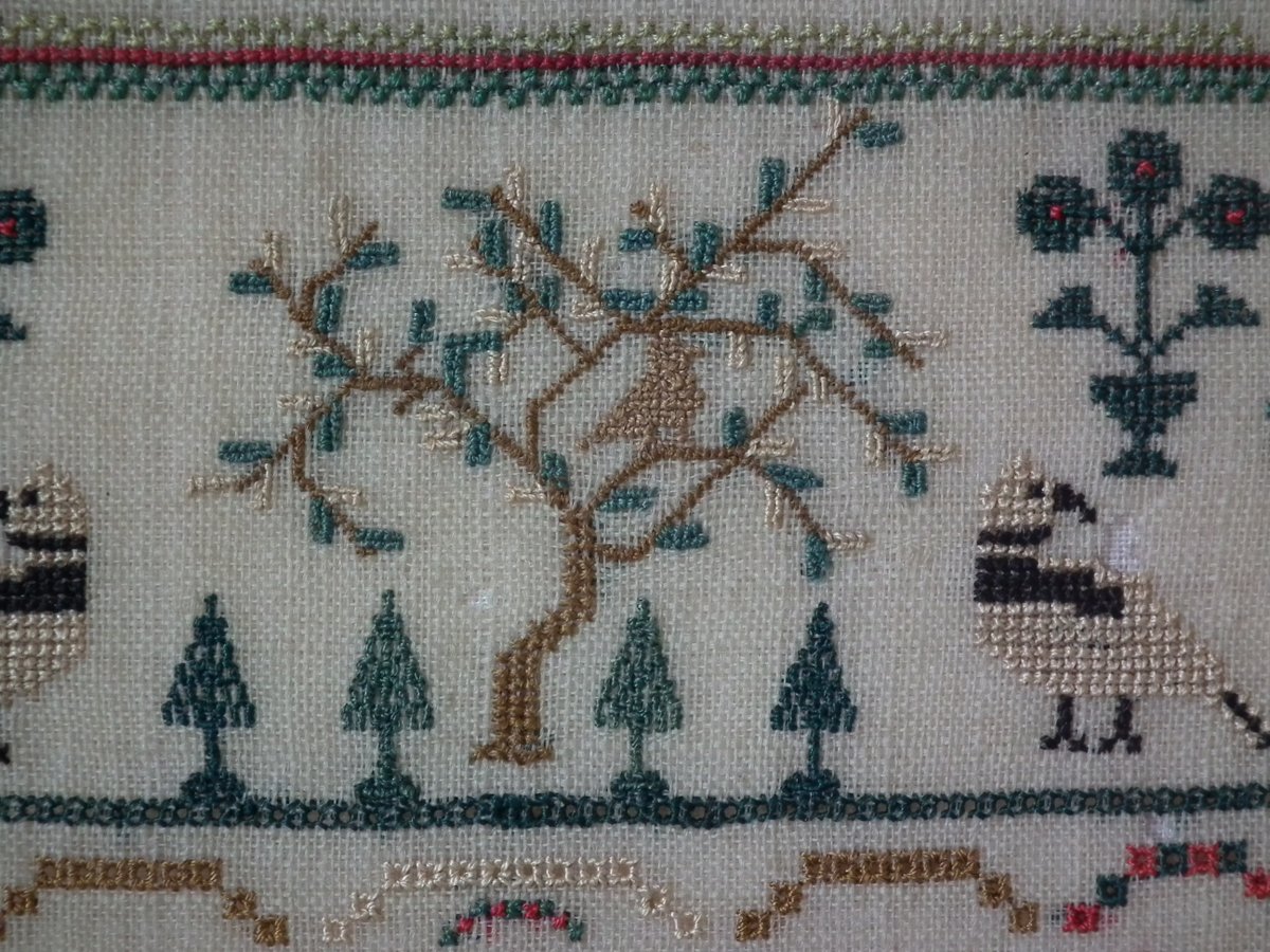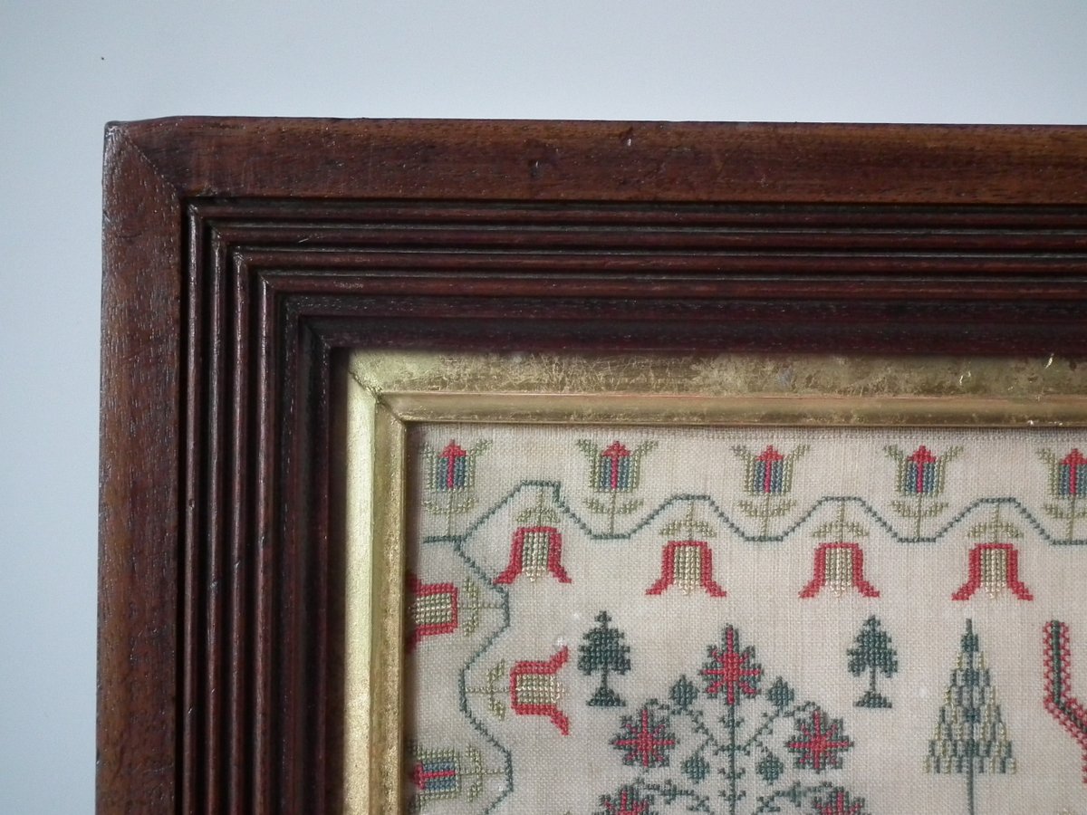 The sampler is worked in silk on linen ground, in cross stitch throughout.