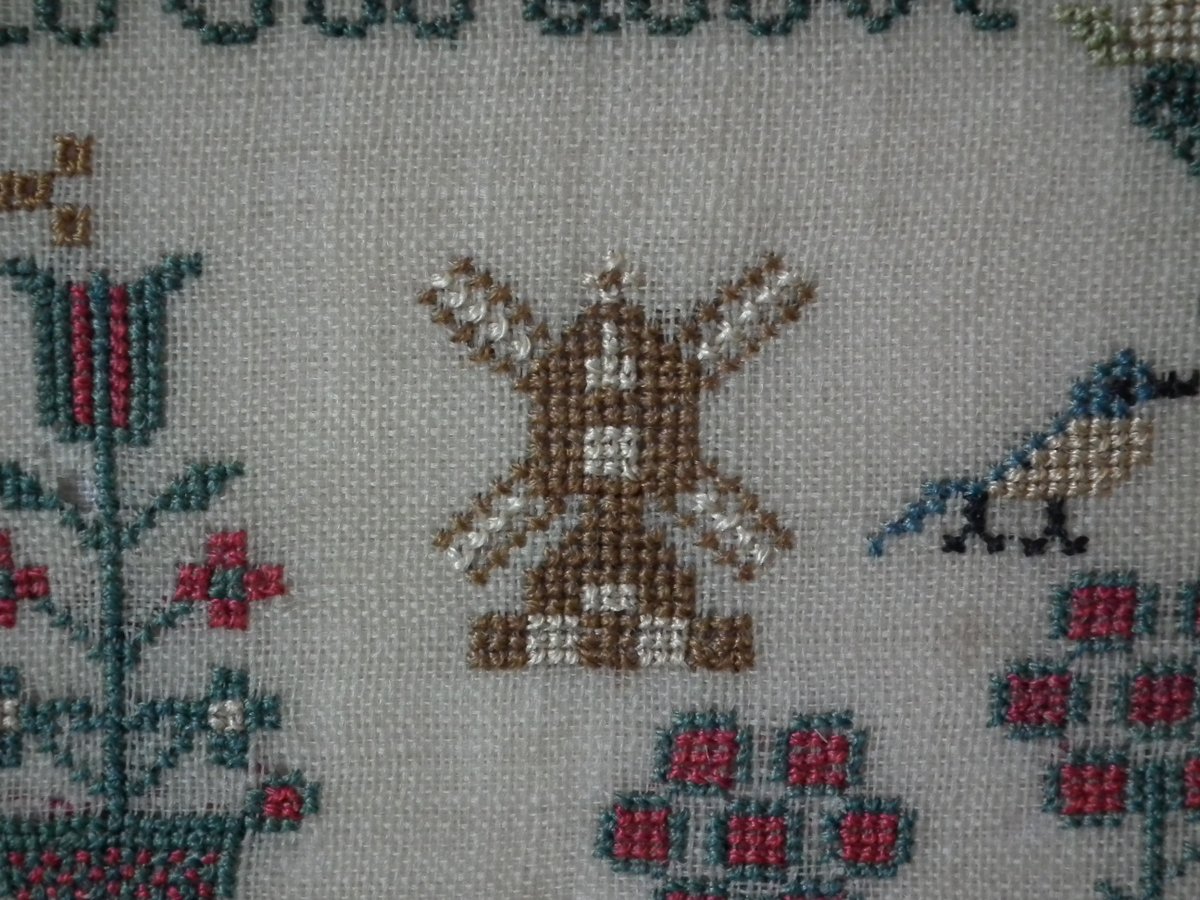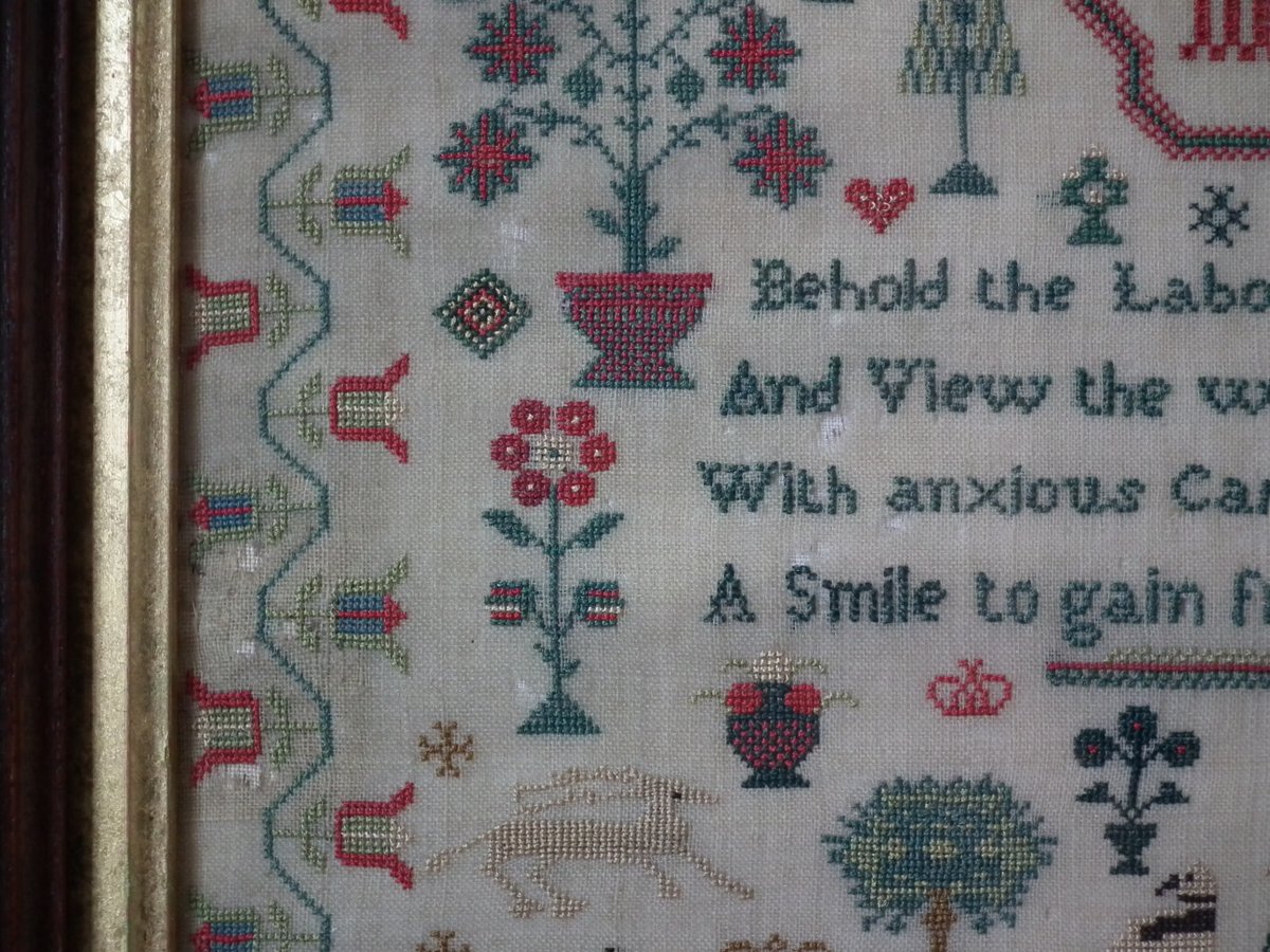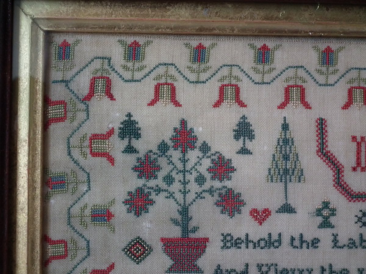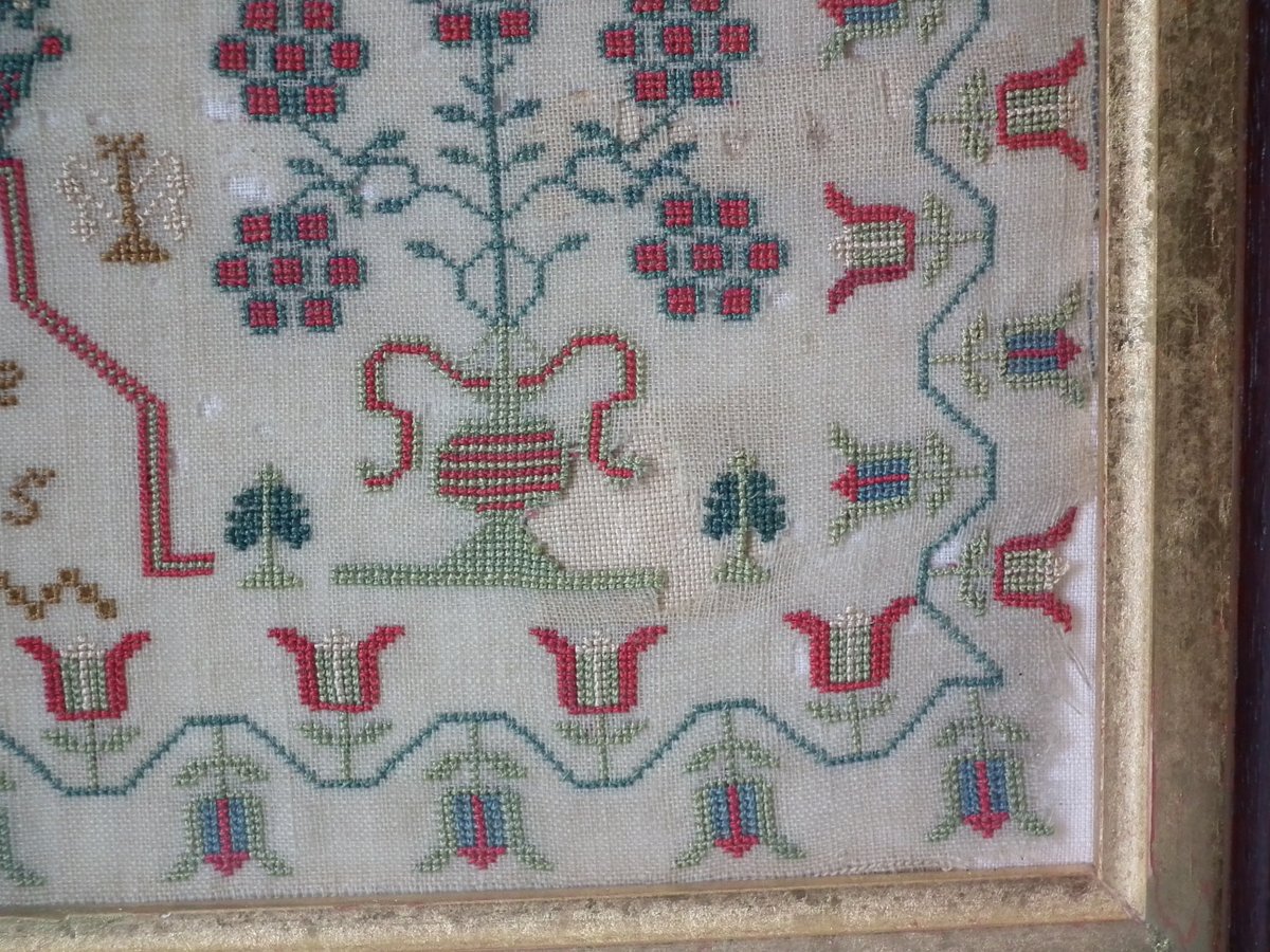 The sampler is worked in silk on linen ground, in cross stitch throughout.