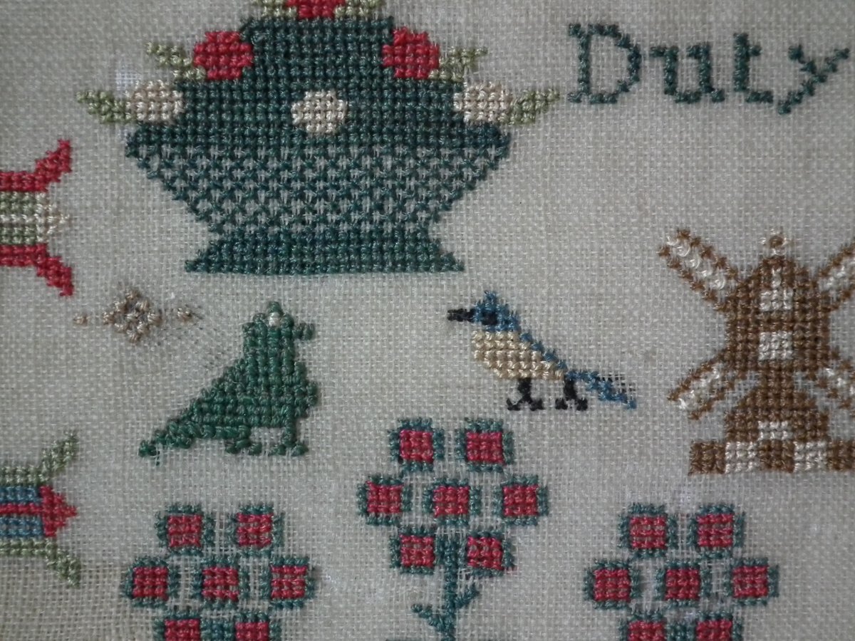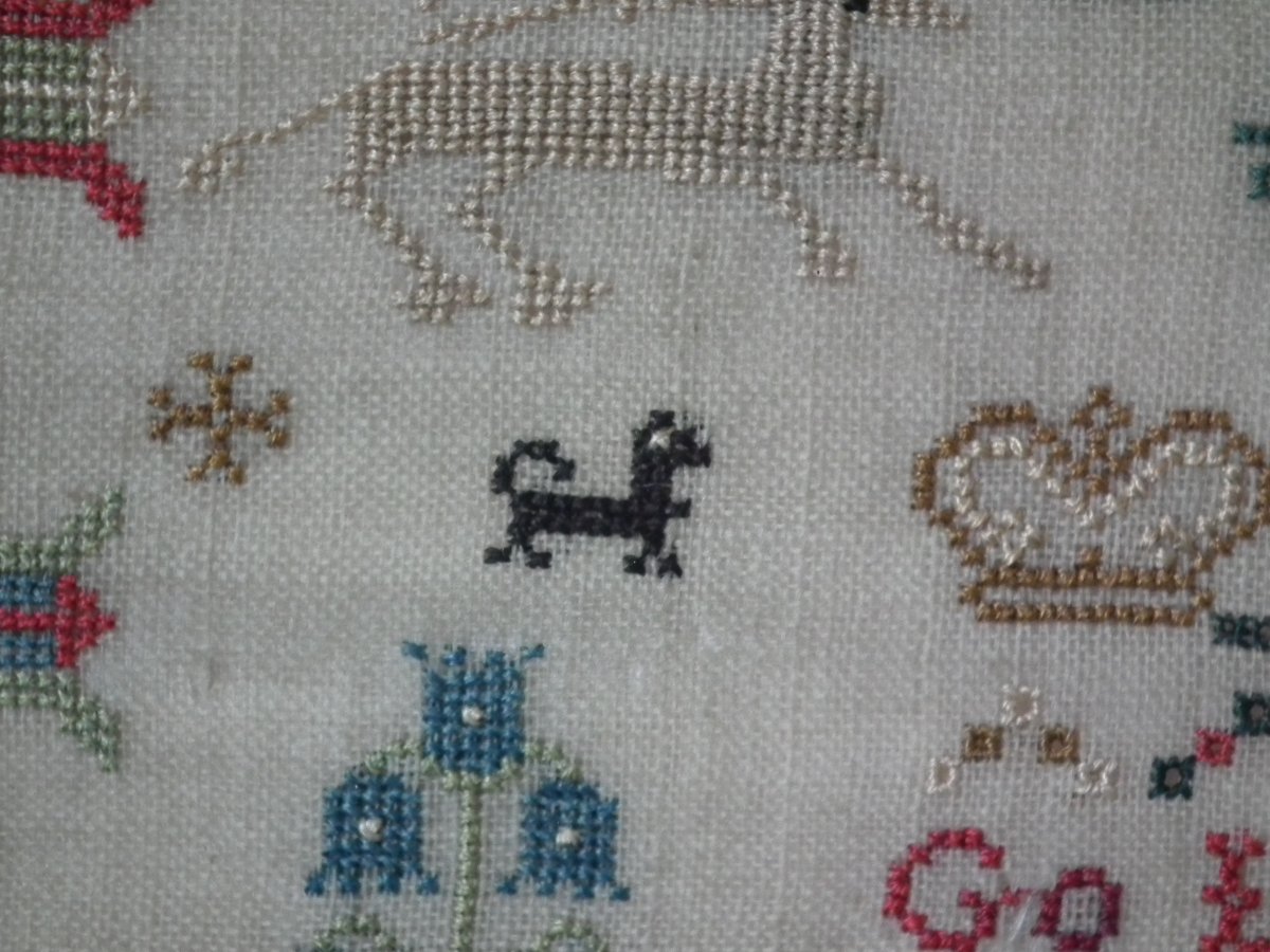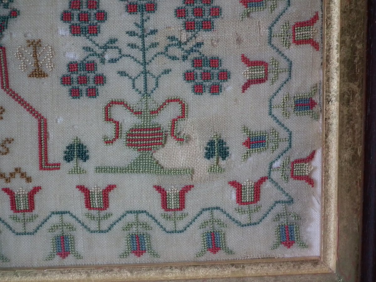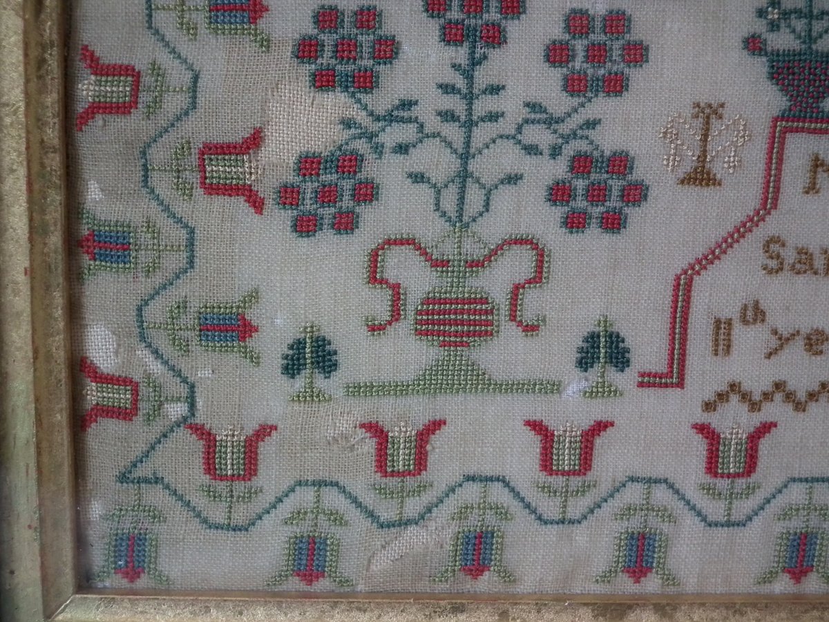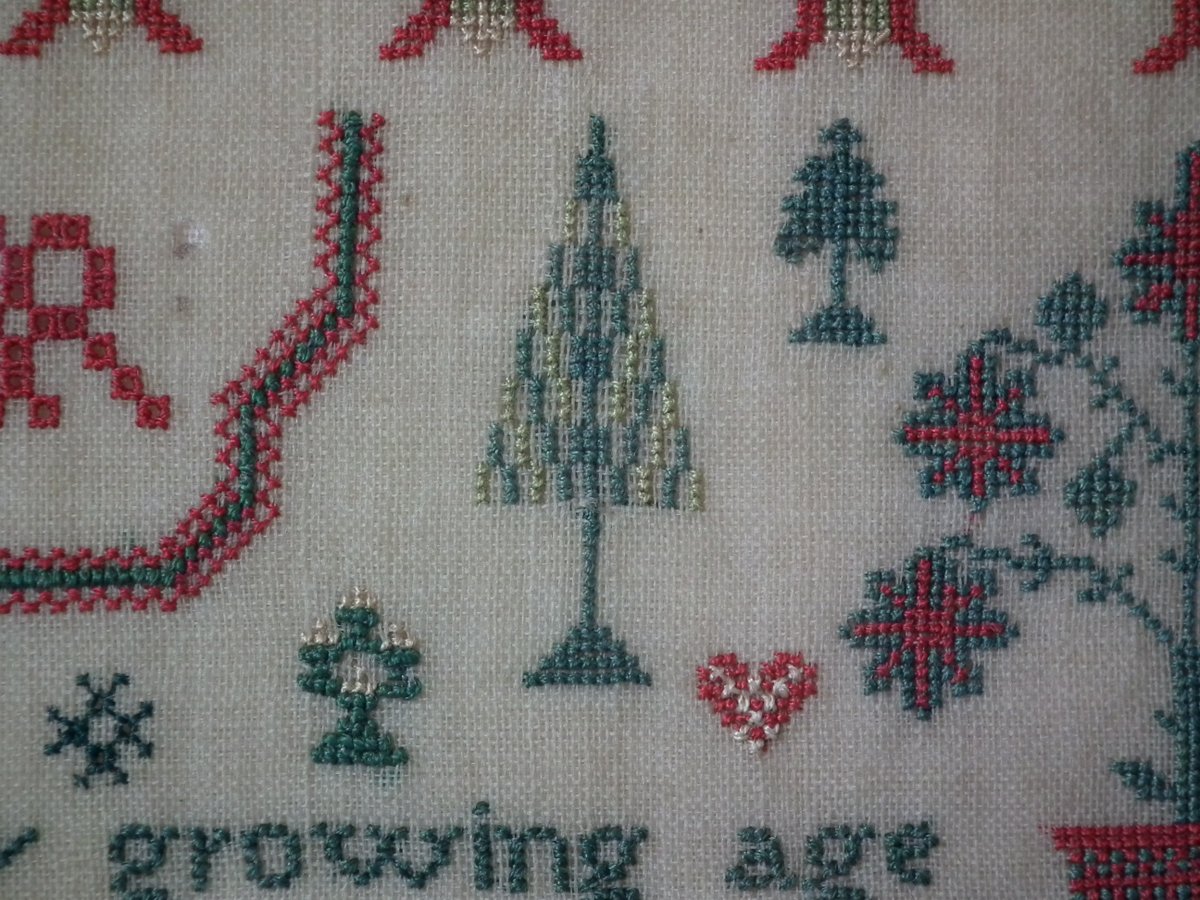 The sampler is worked in silk on linen ground, in cross stitch throughout.