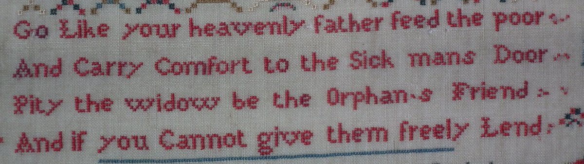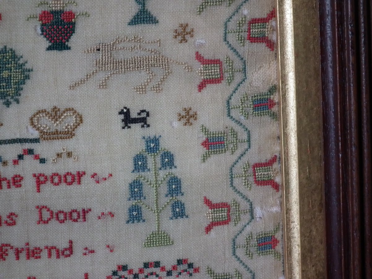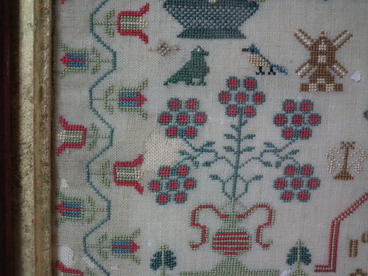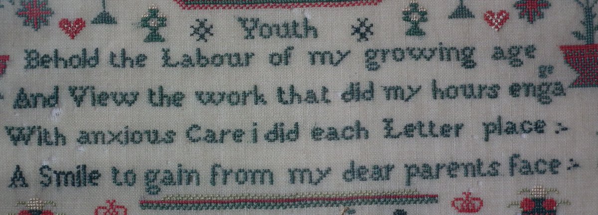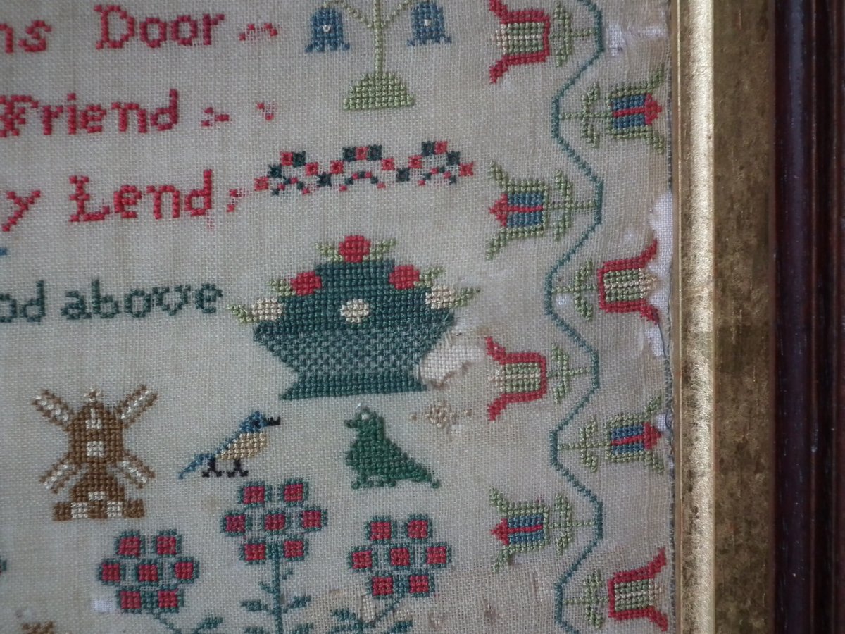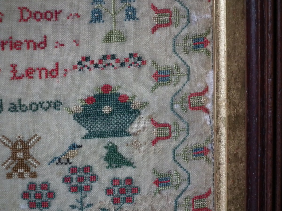 The sampler is worked in silk on linen ground, in cross stitch throughout.