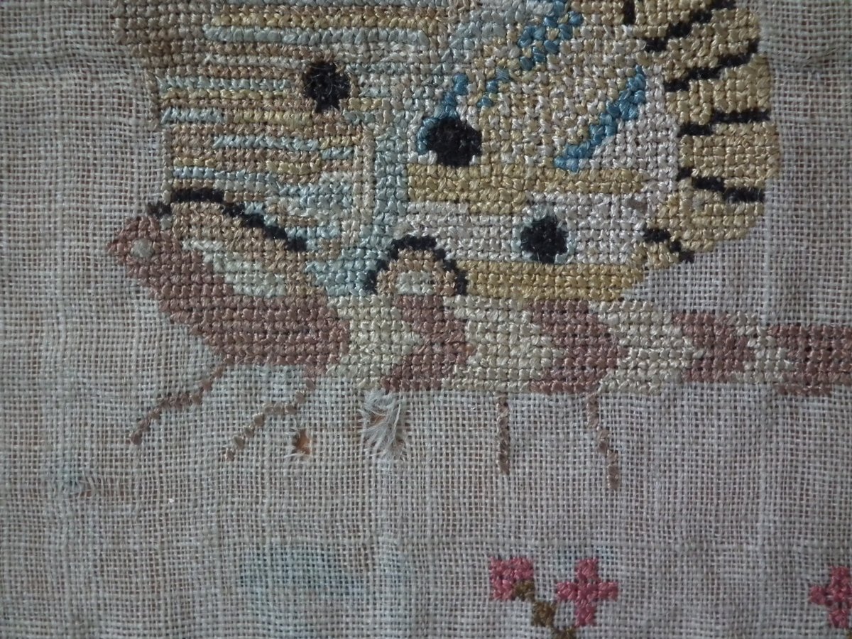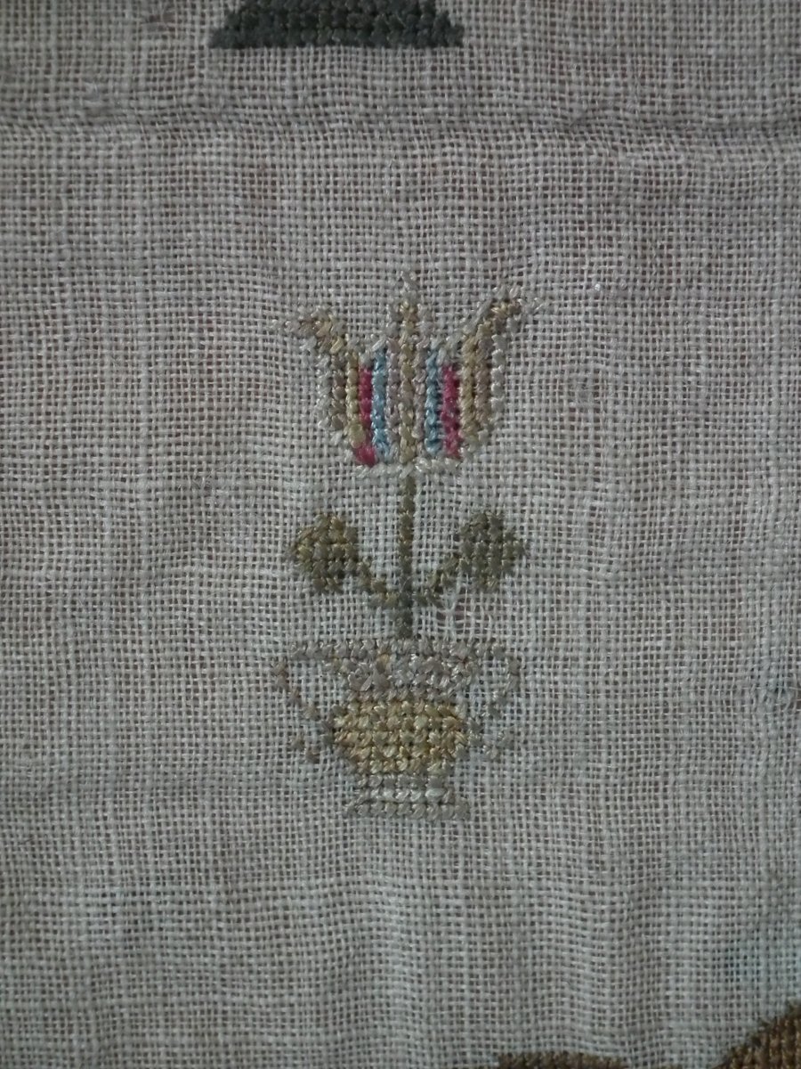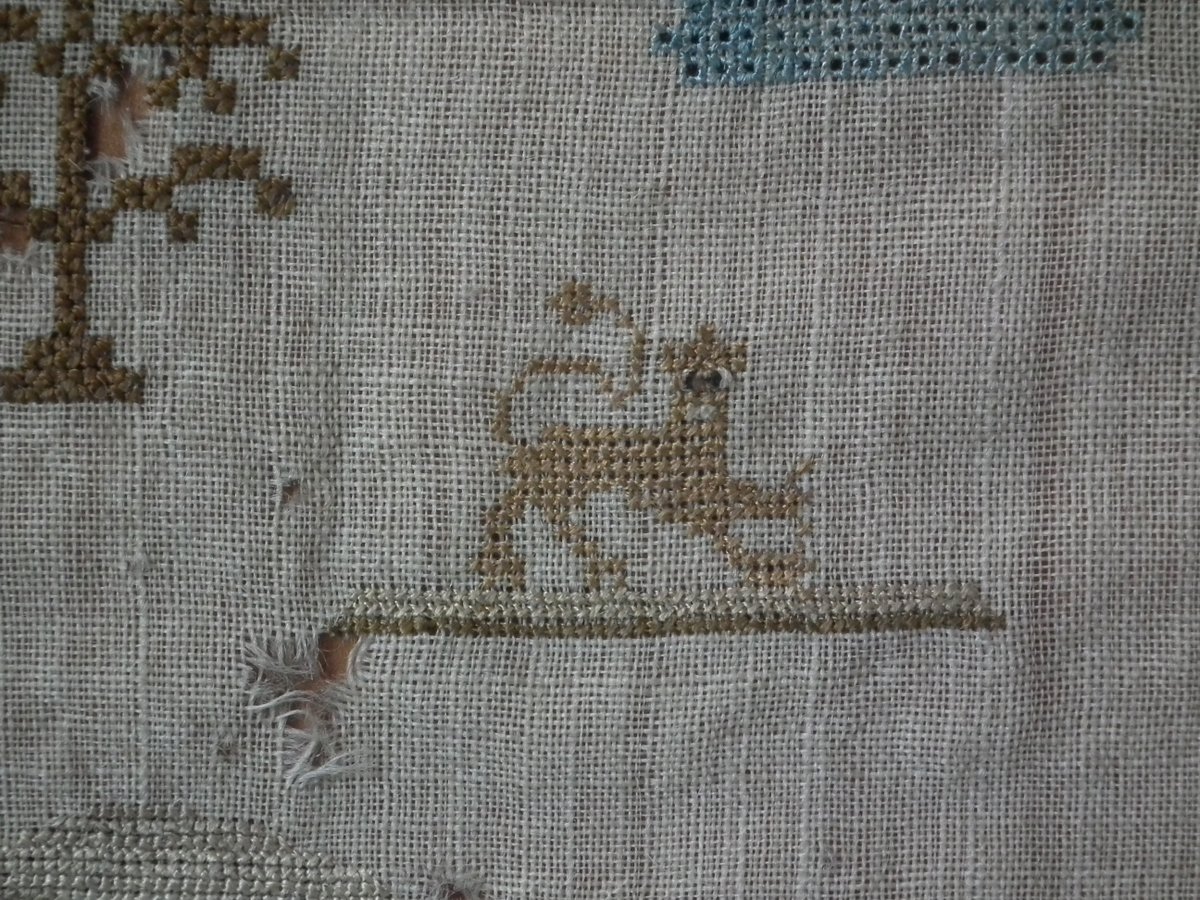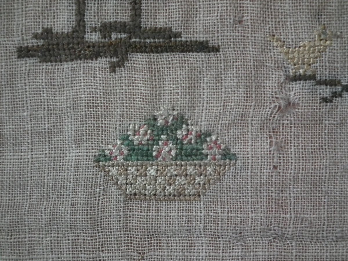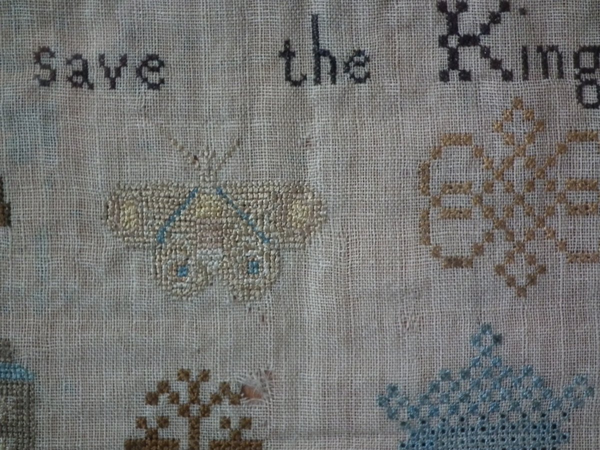 The sampler is worked in silk on linen ground, in a variety of stitches including Algerian eye.