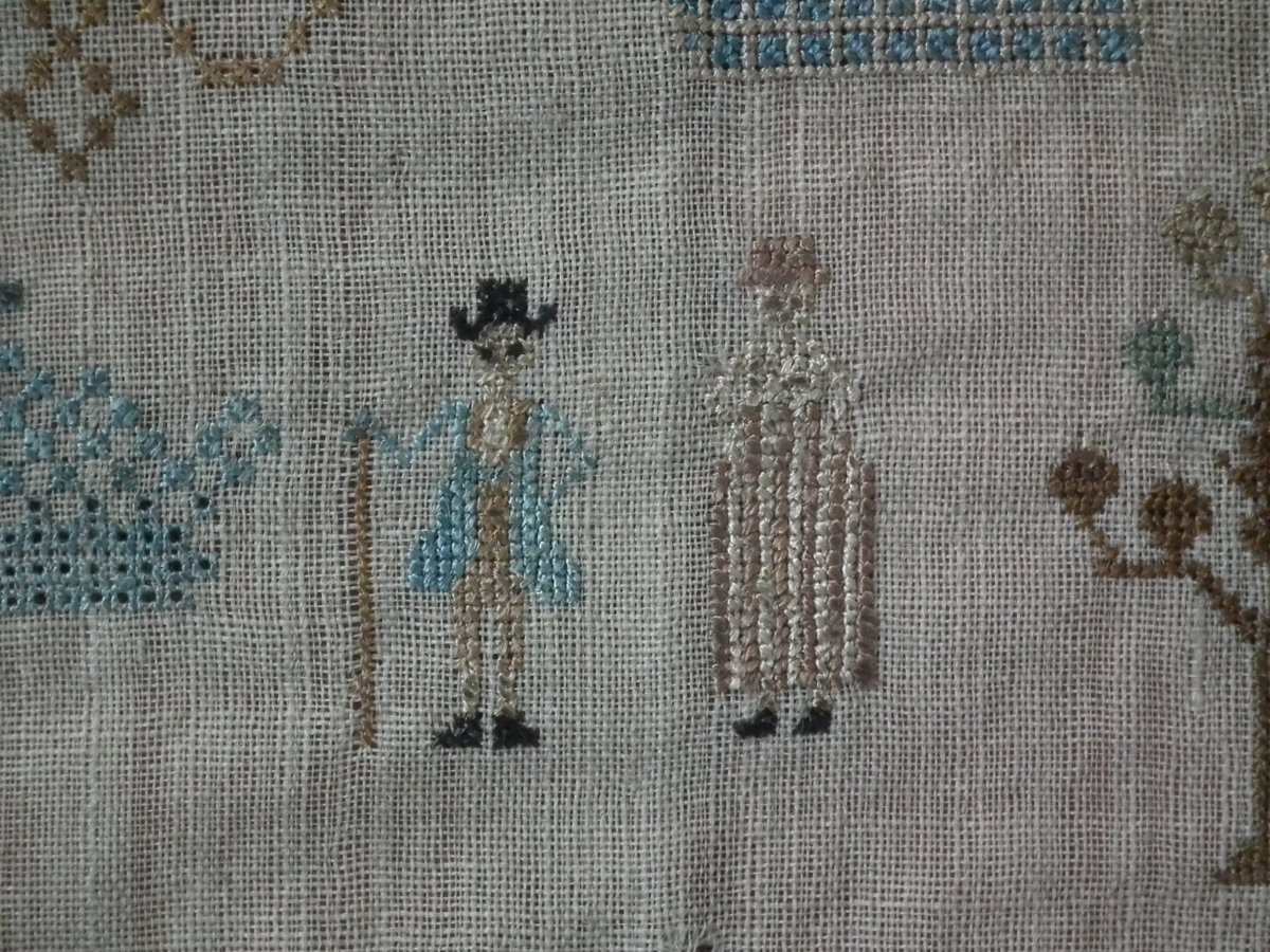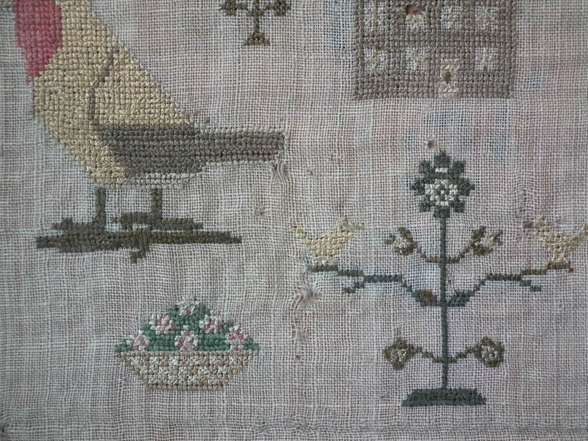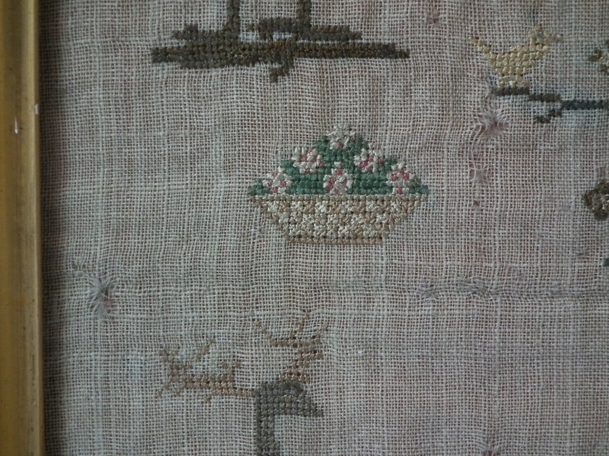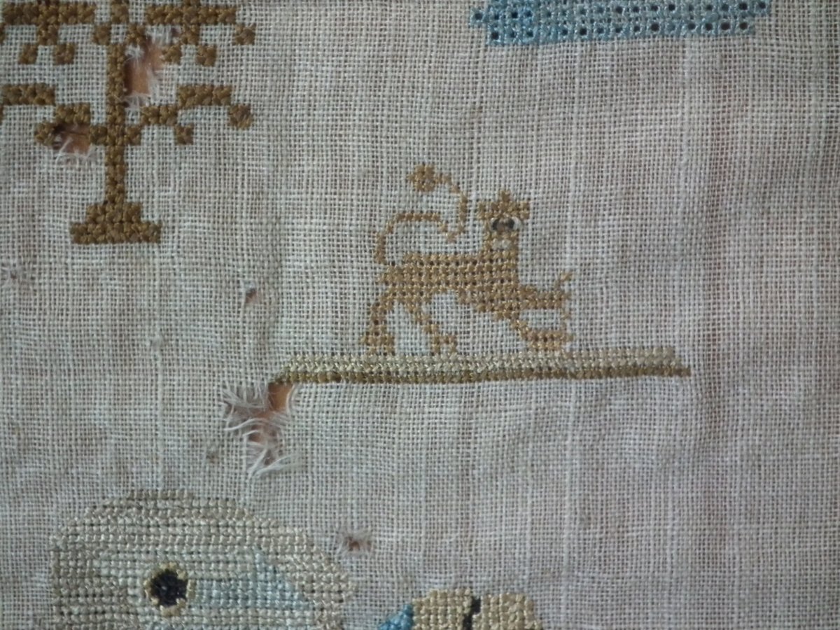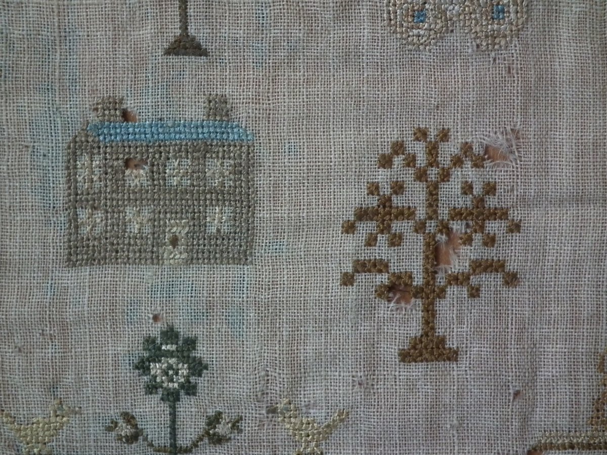 The sampler is worked in silk on linen ground, in a variety of stitches including Algerian eye.