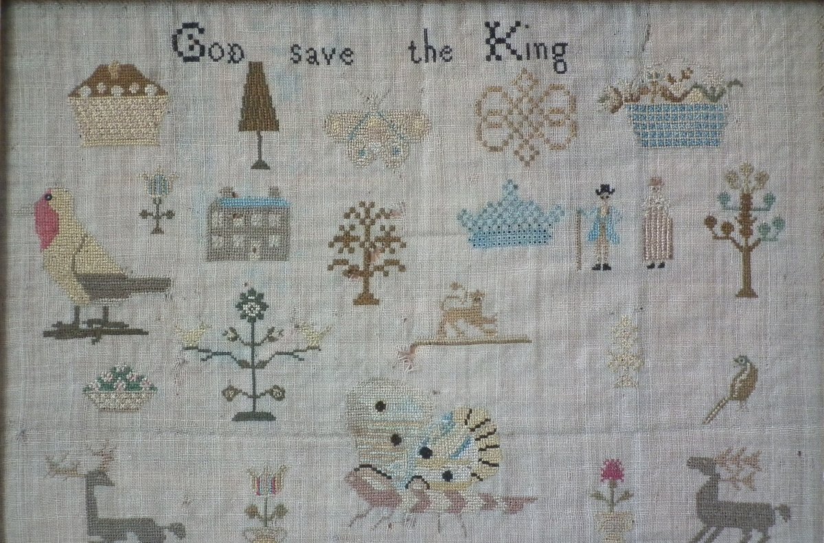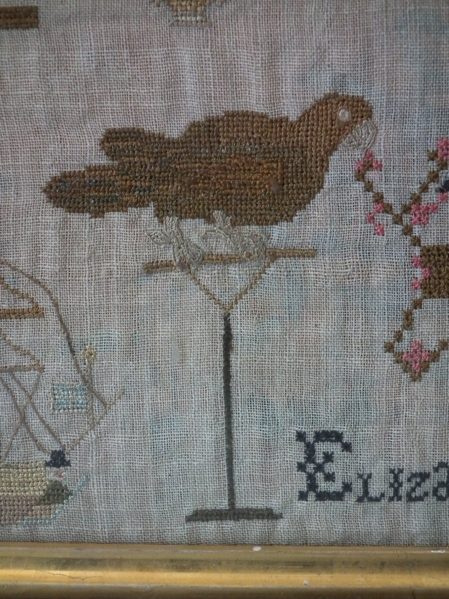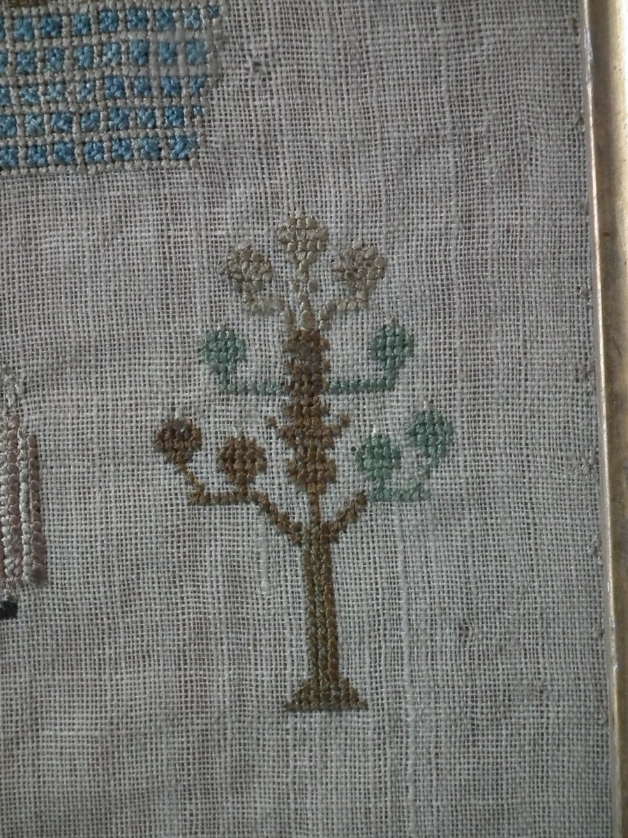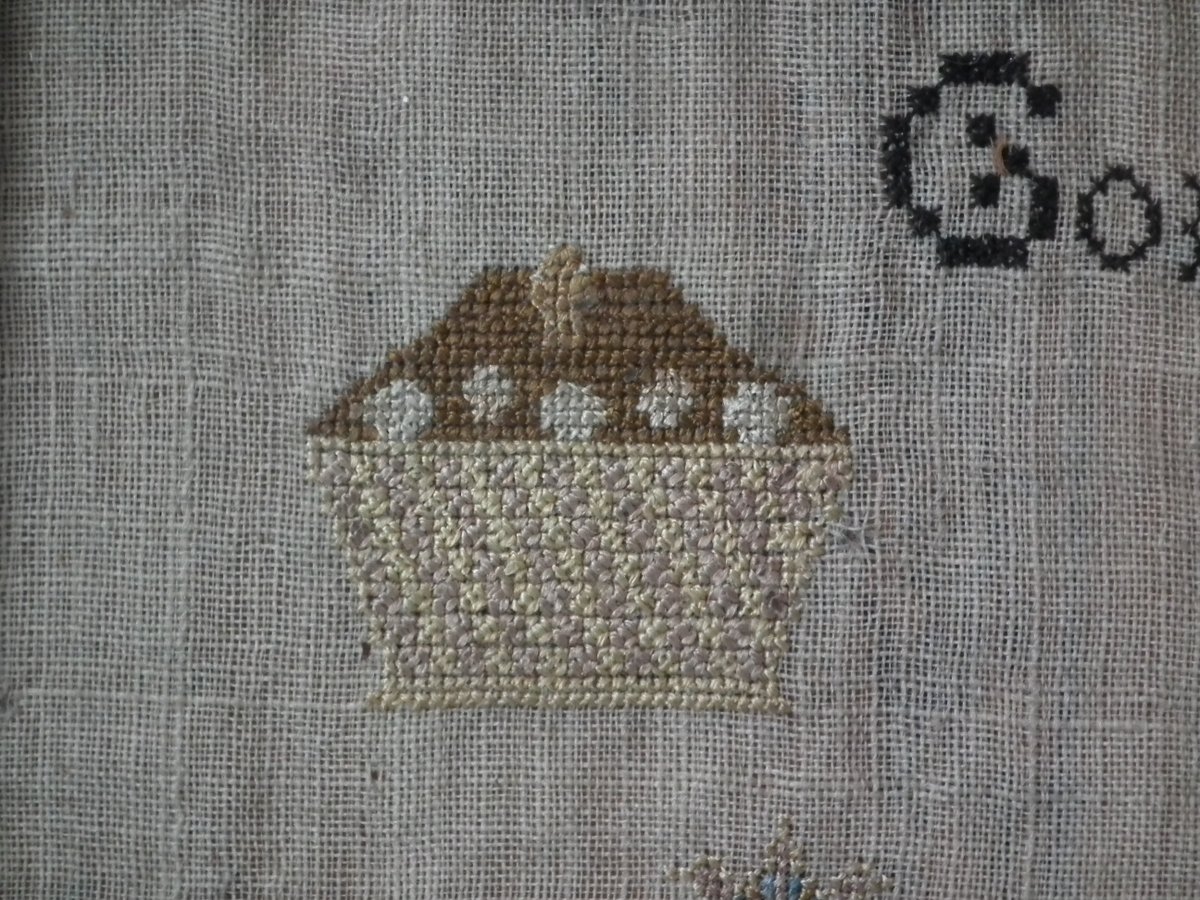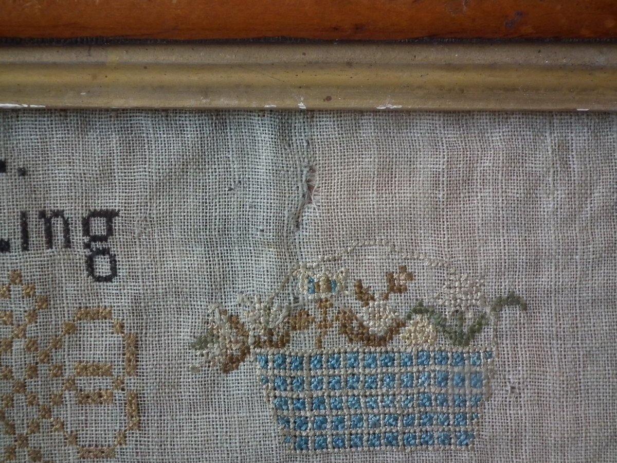 The sampler is worked in silk on linen ground, in a variety of stitches including Algerian eye.