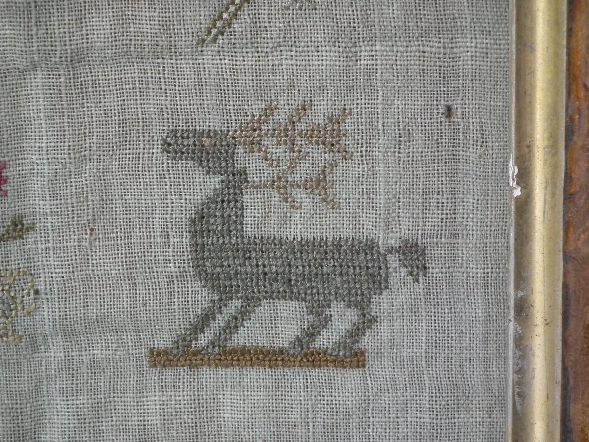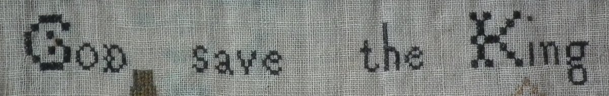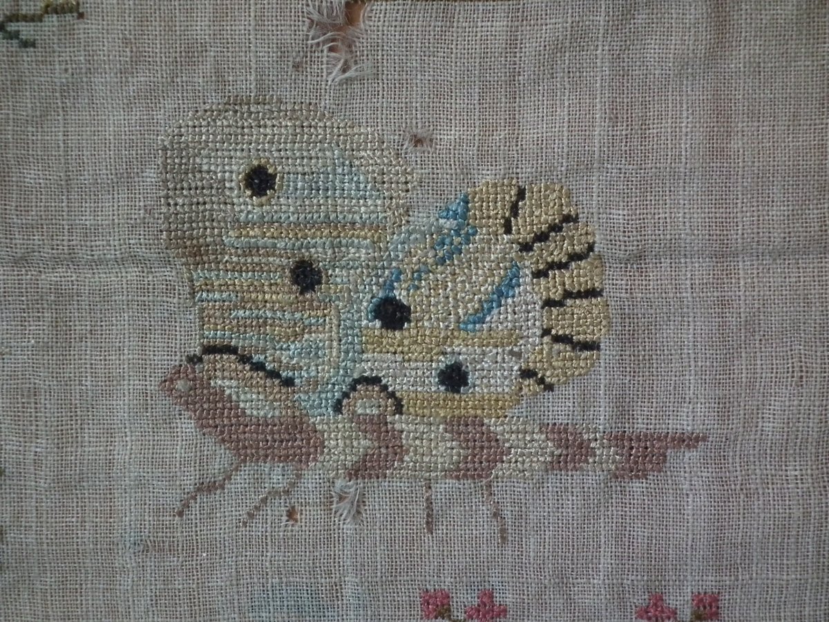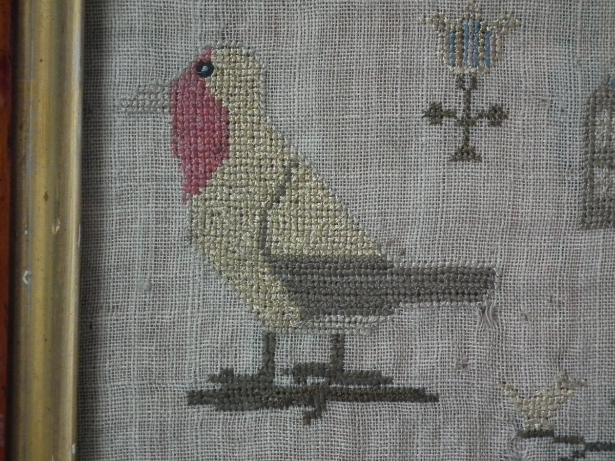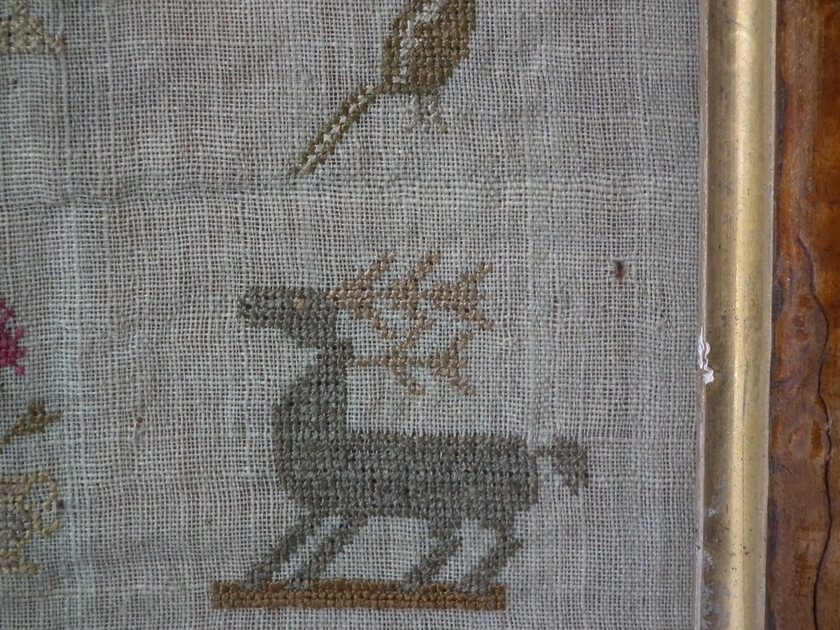 The sampler is worked in silk on linen ground, in a variety of stitches including Algerian eye.