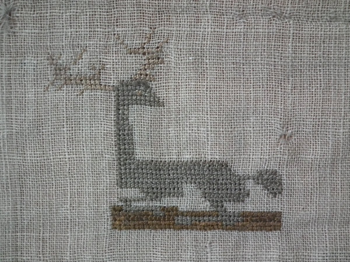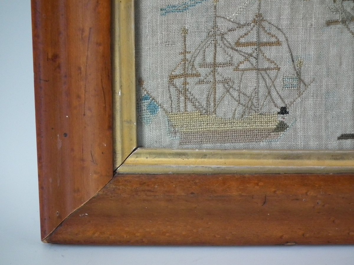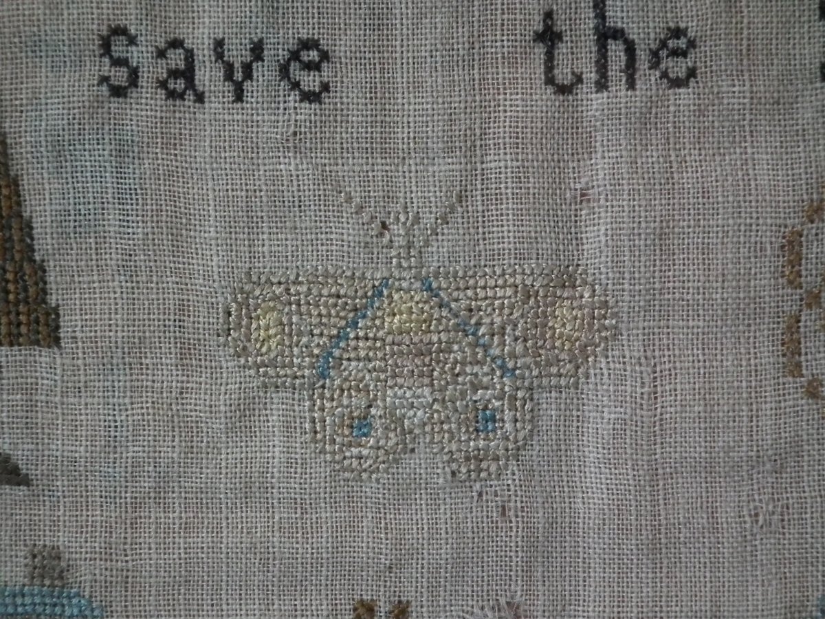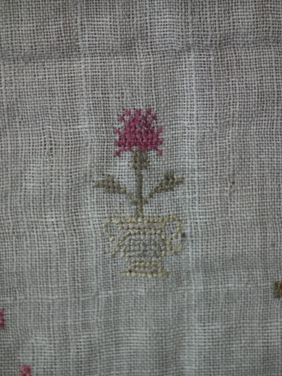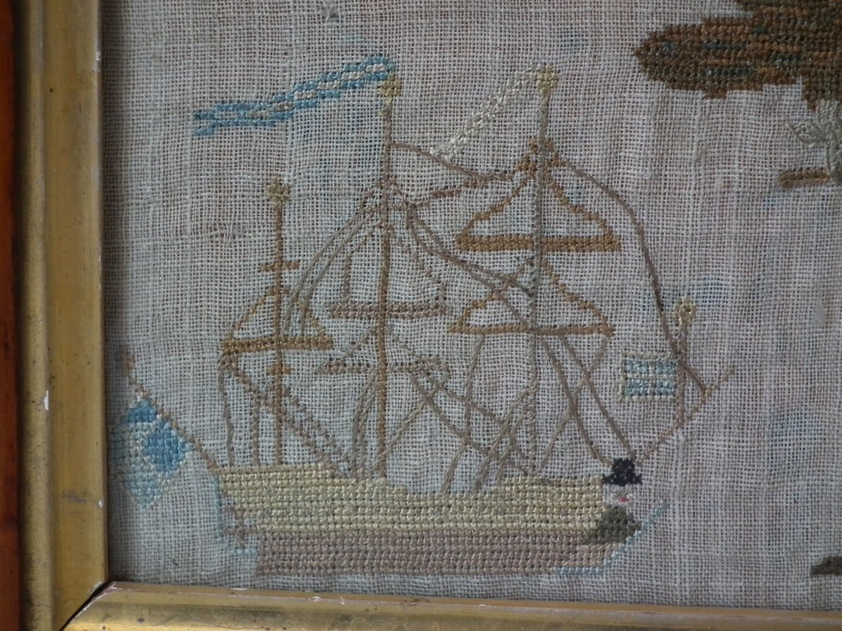 The sampler is worked in silk on linen ground, in a variety of stitches including Algerian eye.