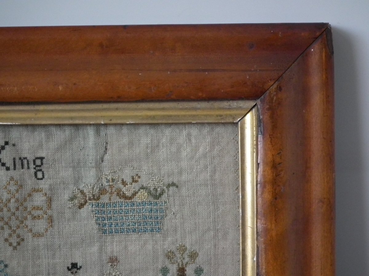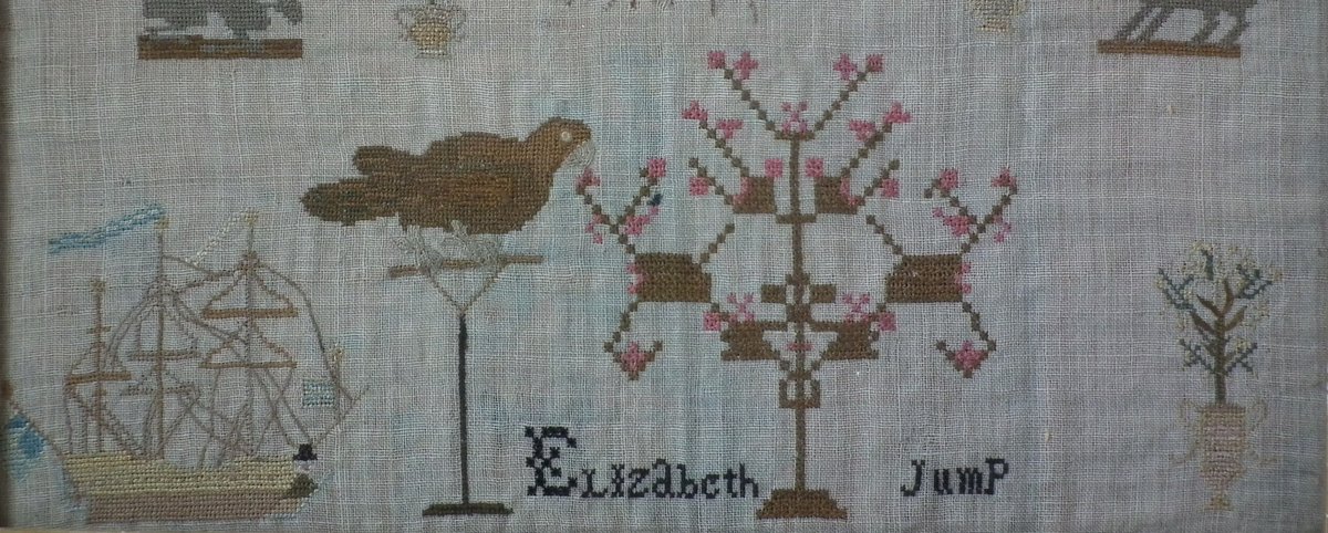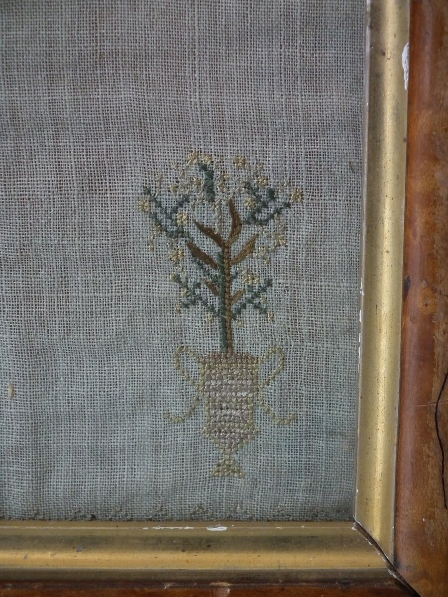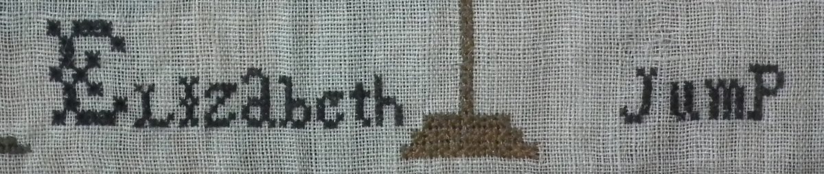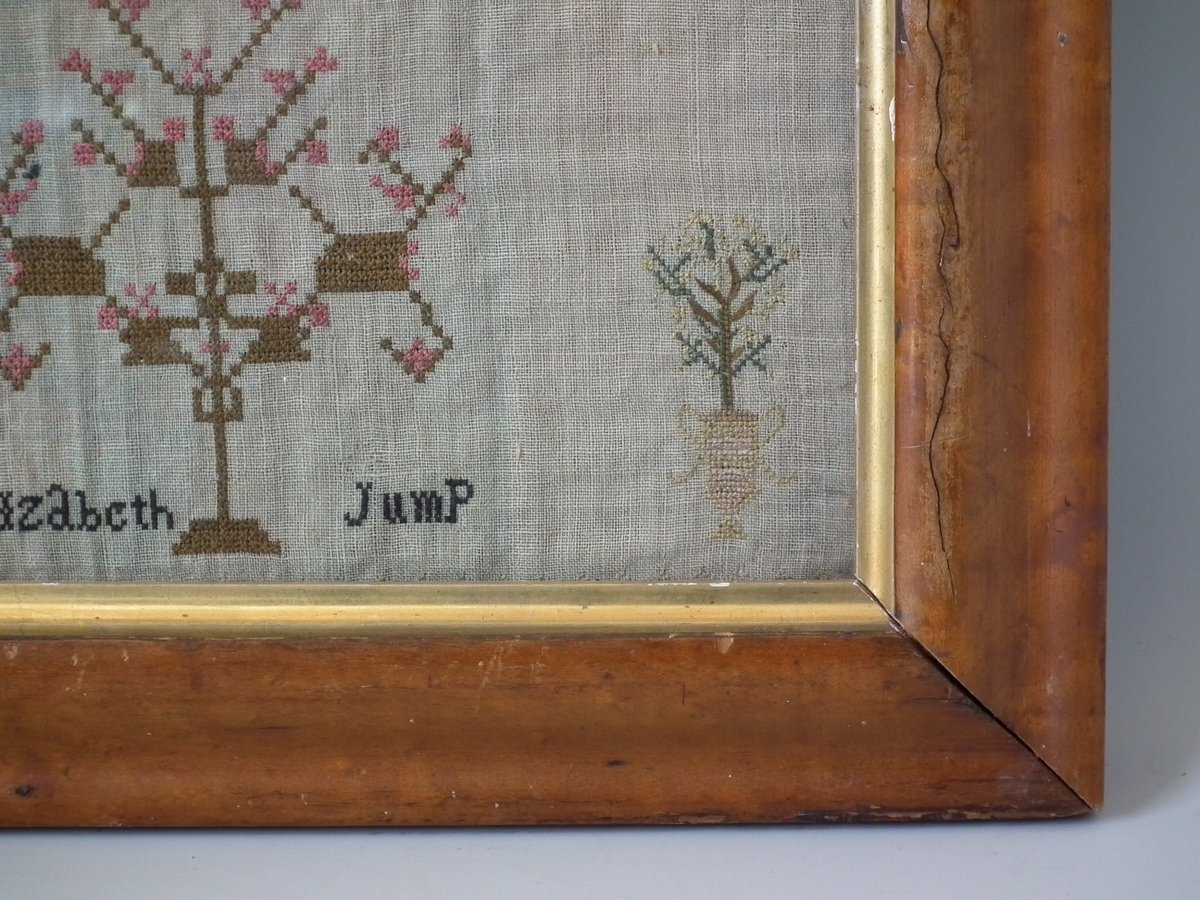 Circa 1810. 12ins high by 11.5ins wide. Elizabeth Jump Sampler. Framed in an old maple frame with rippled, old glass.