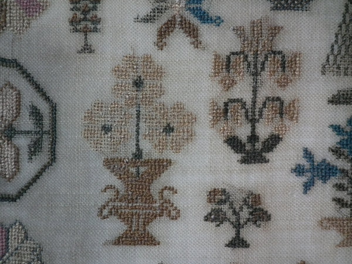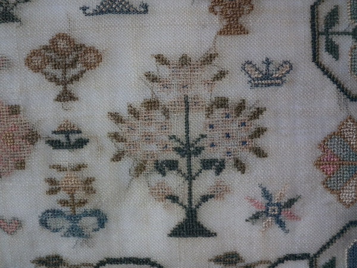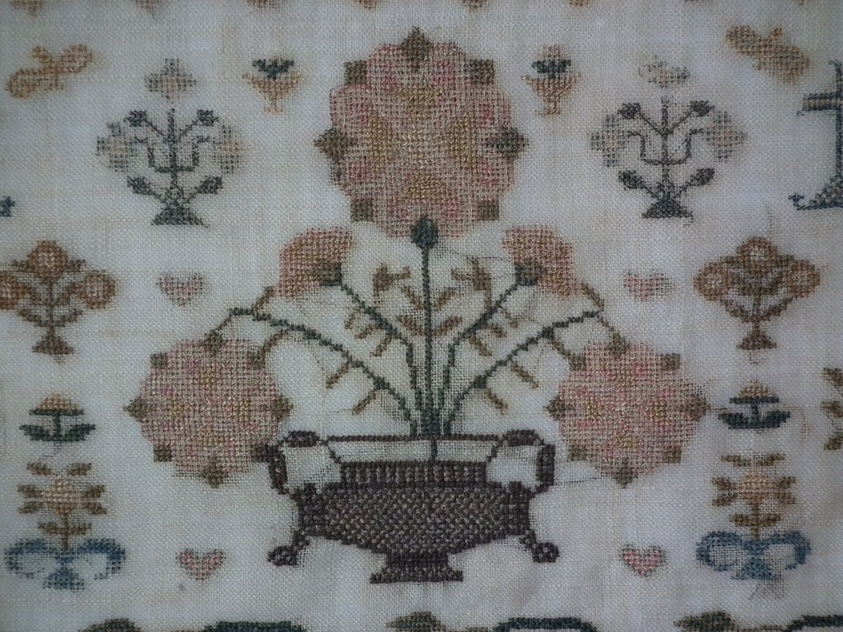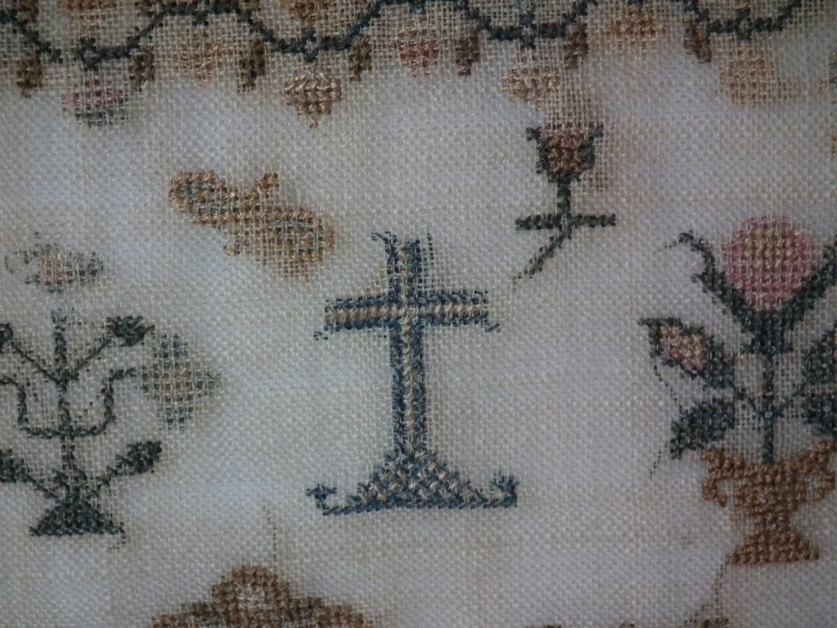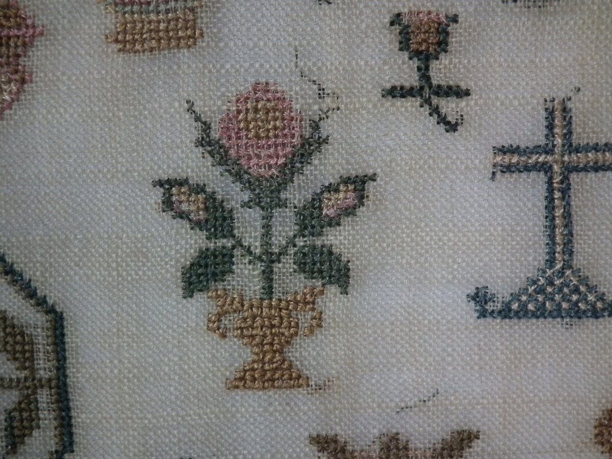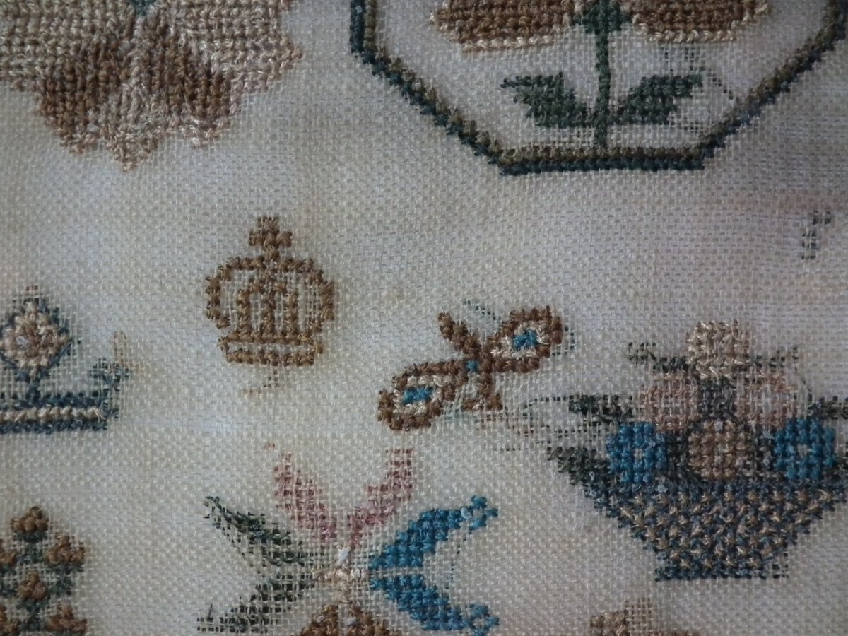 The sampler is worked in silk on linen ground, in cross stitch throughout.
