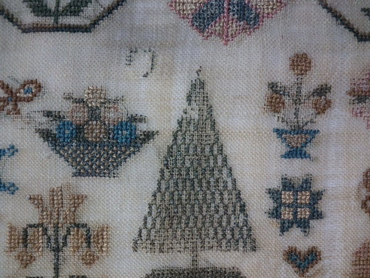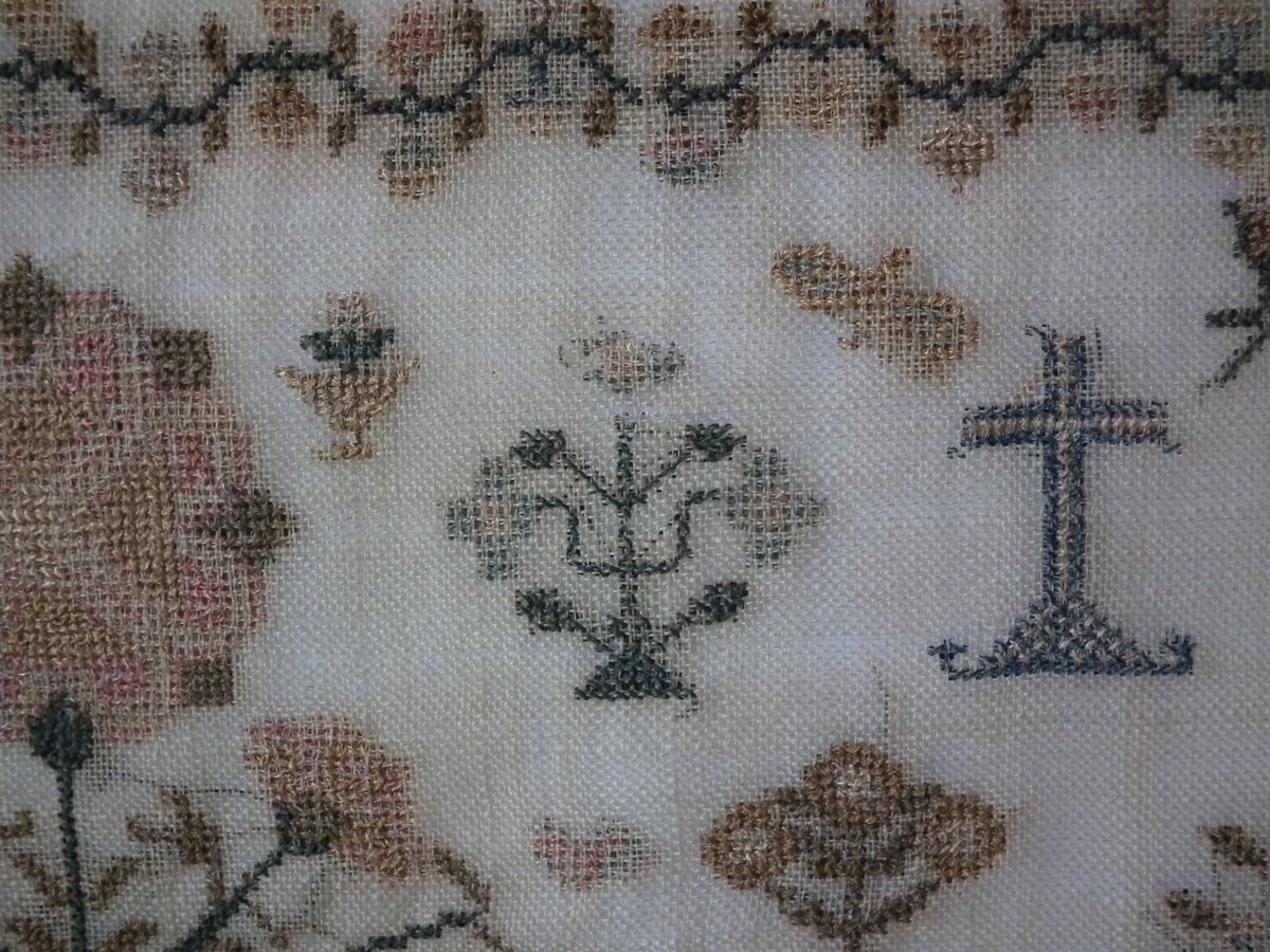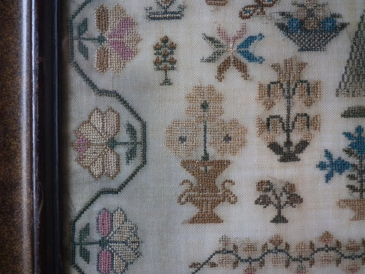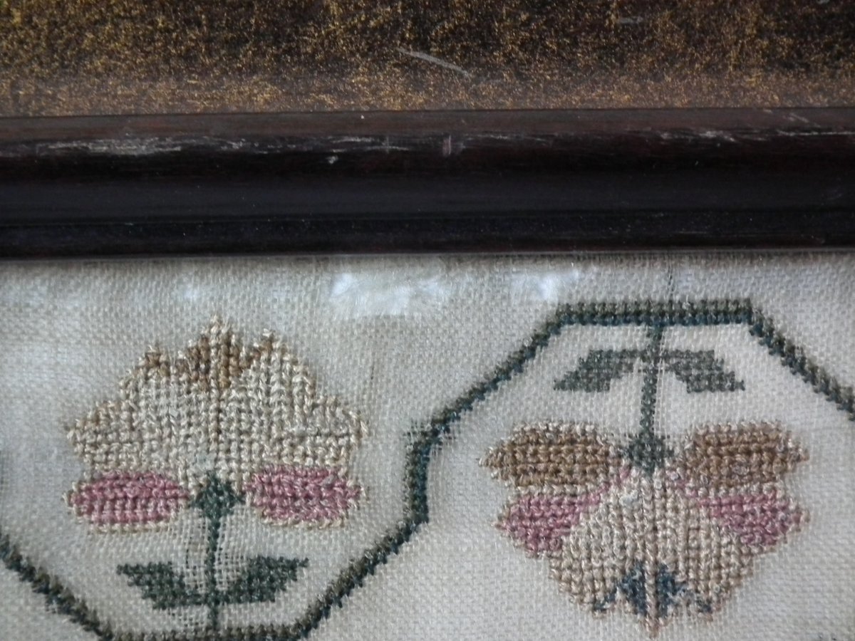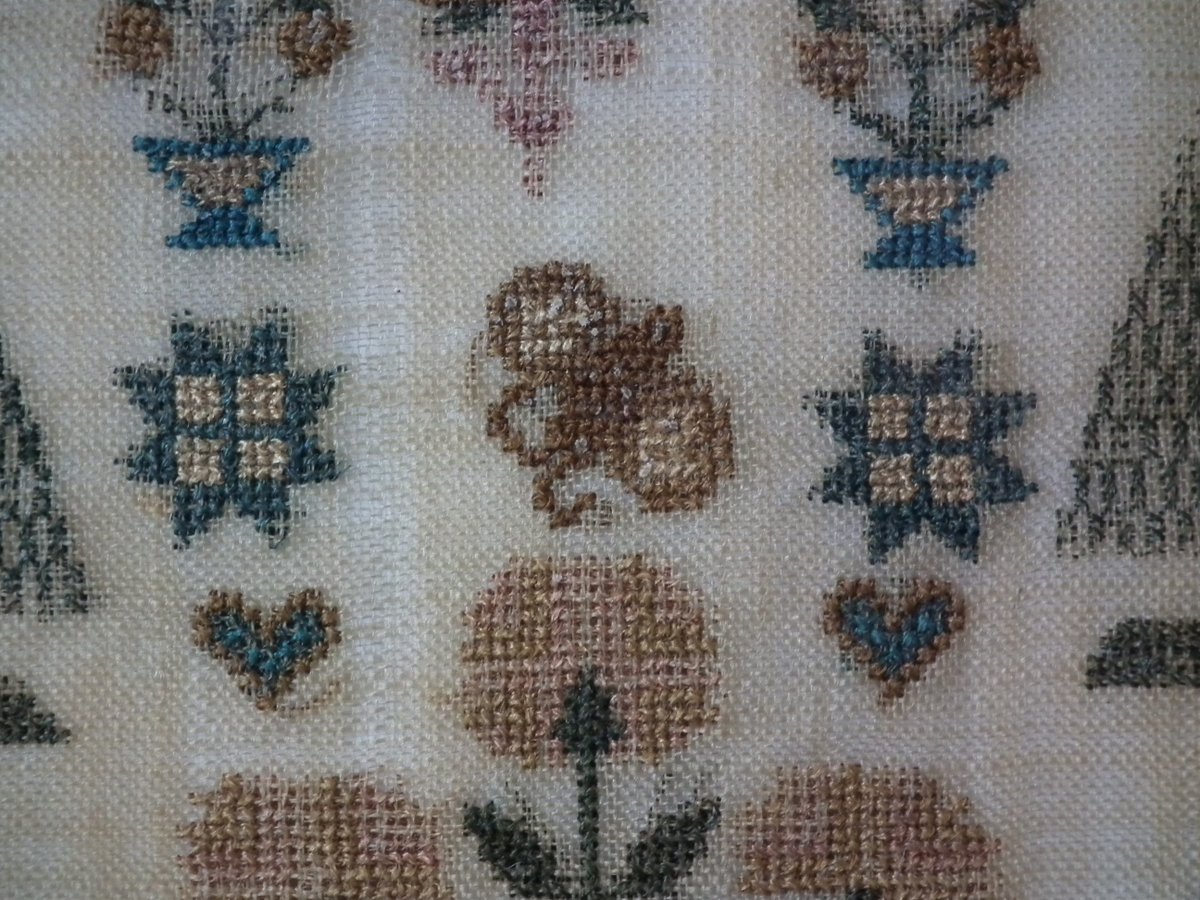 The sampler is worked in silk on linen ground, in cross stitch throughout.