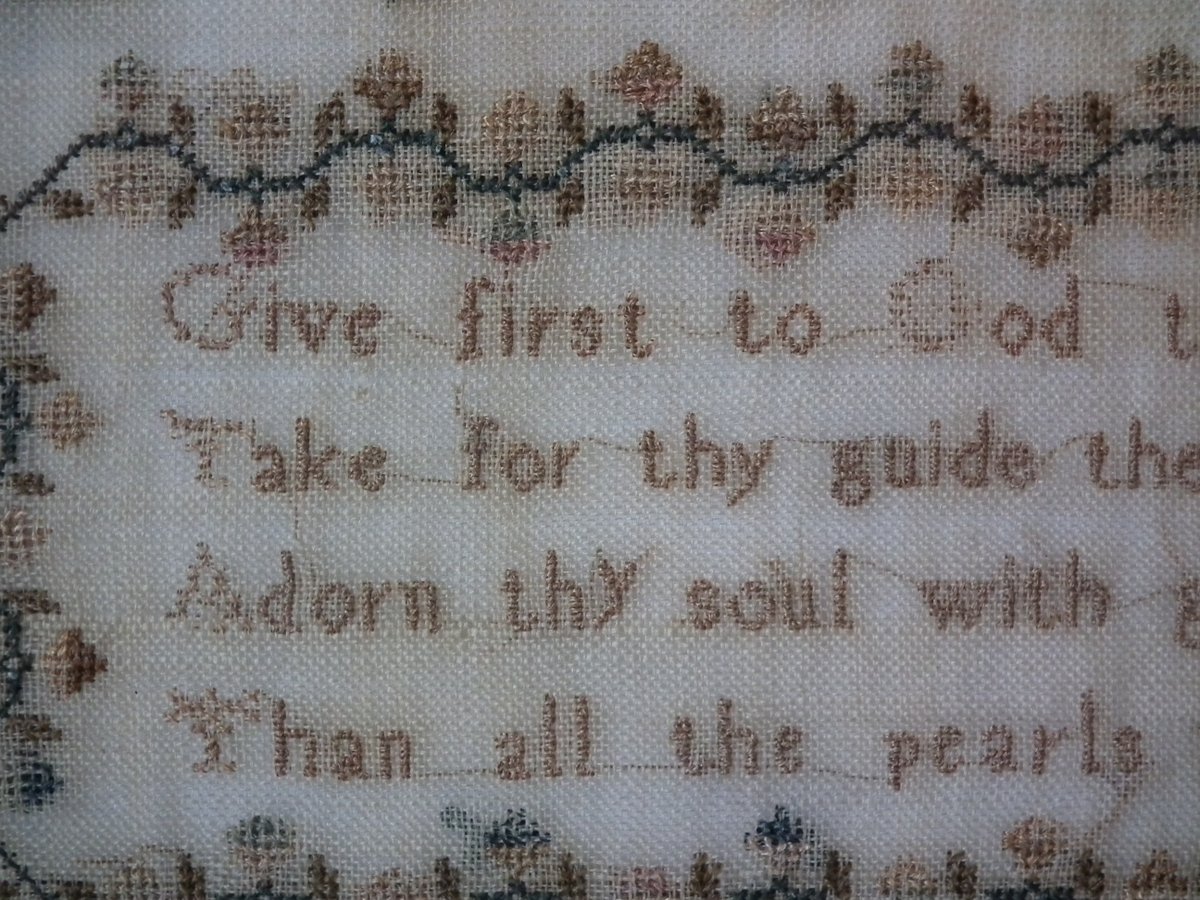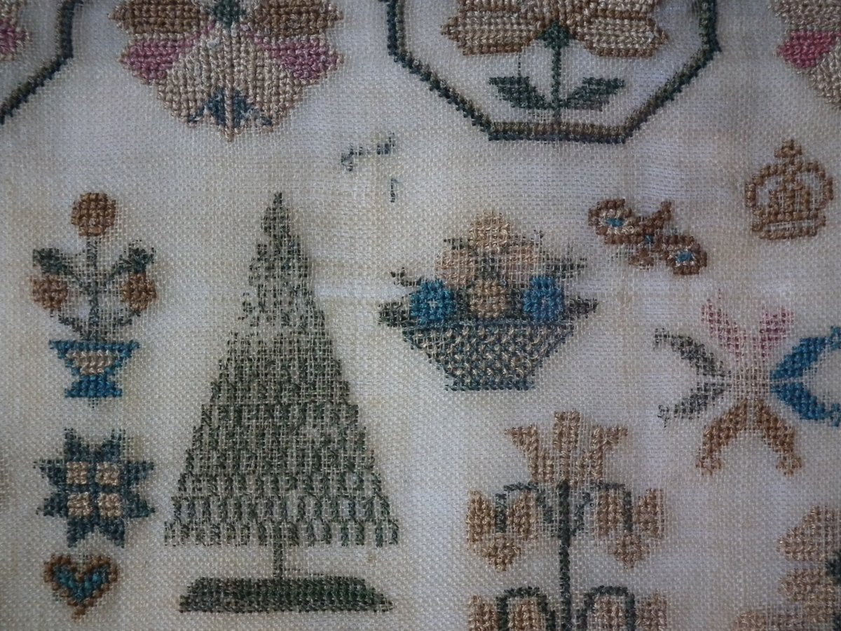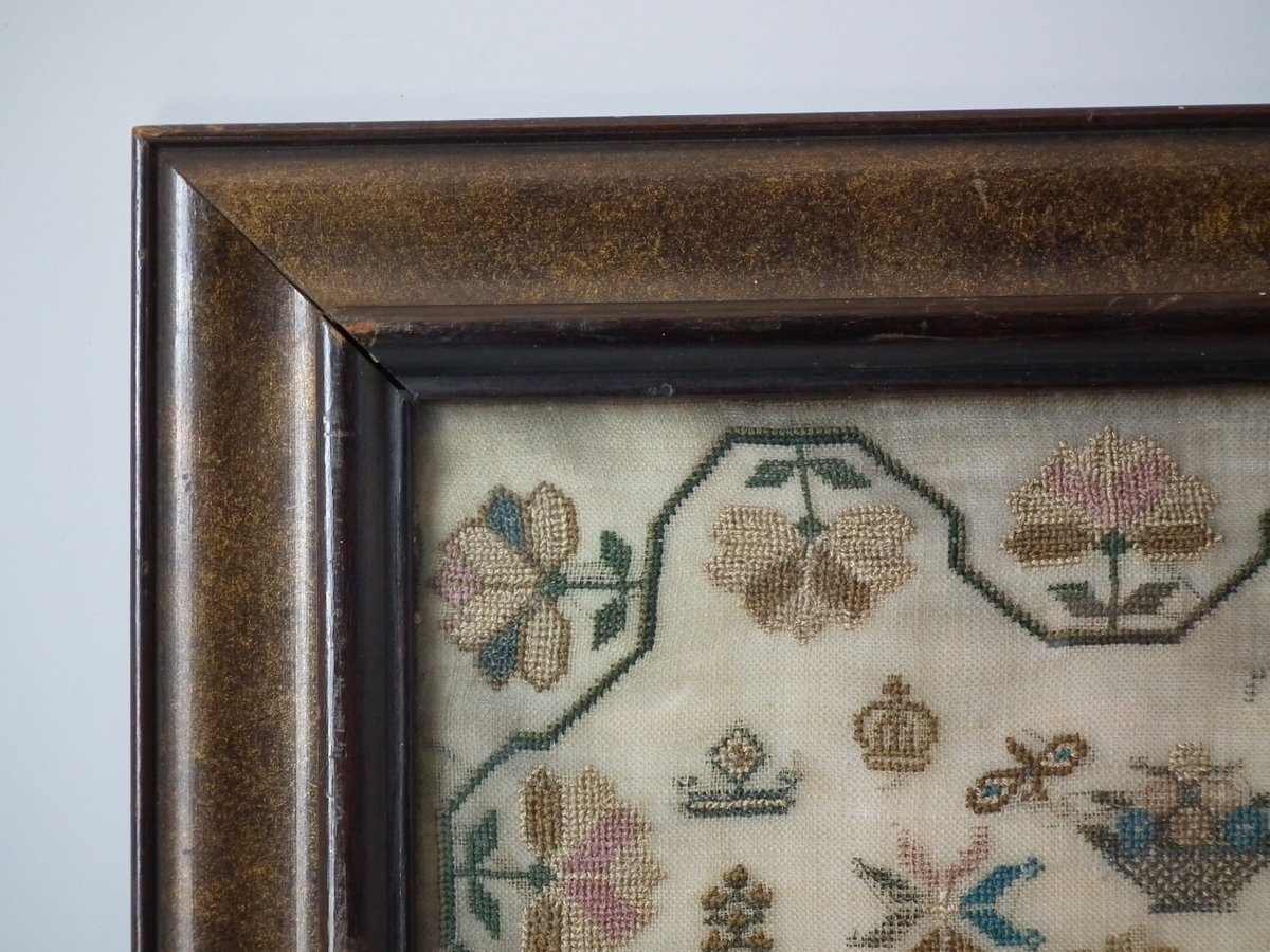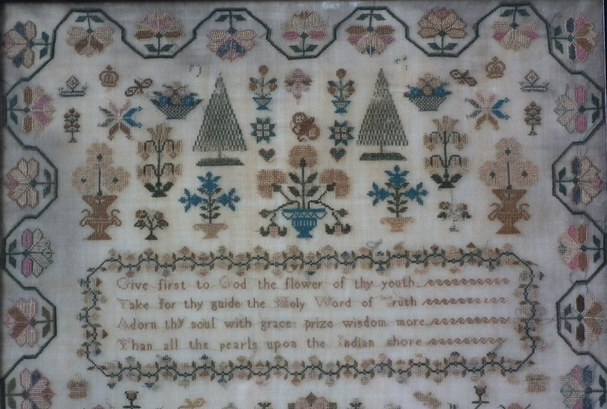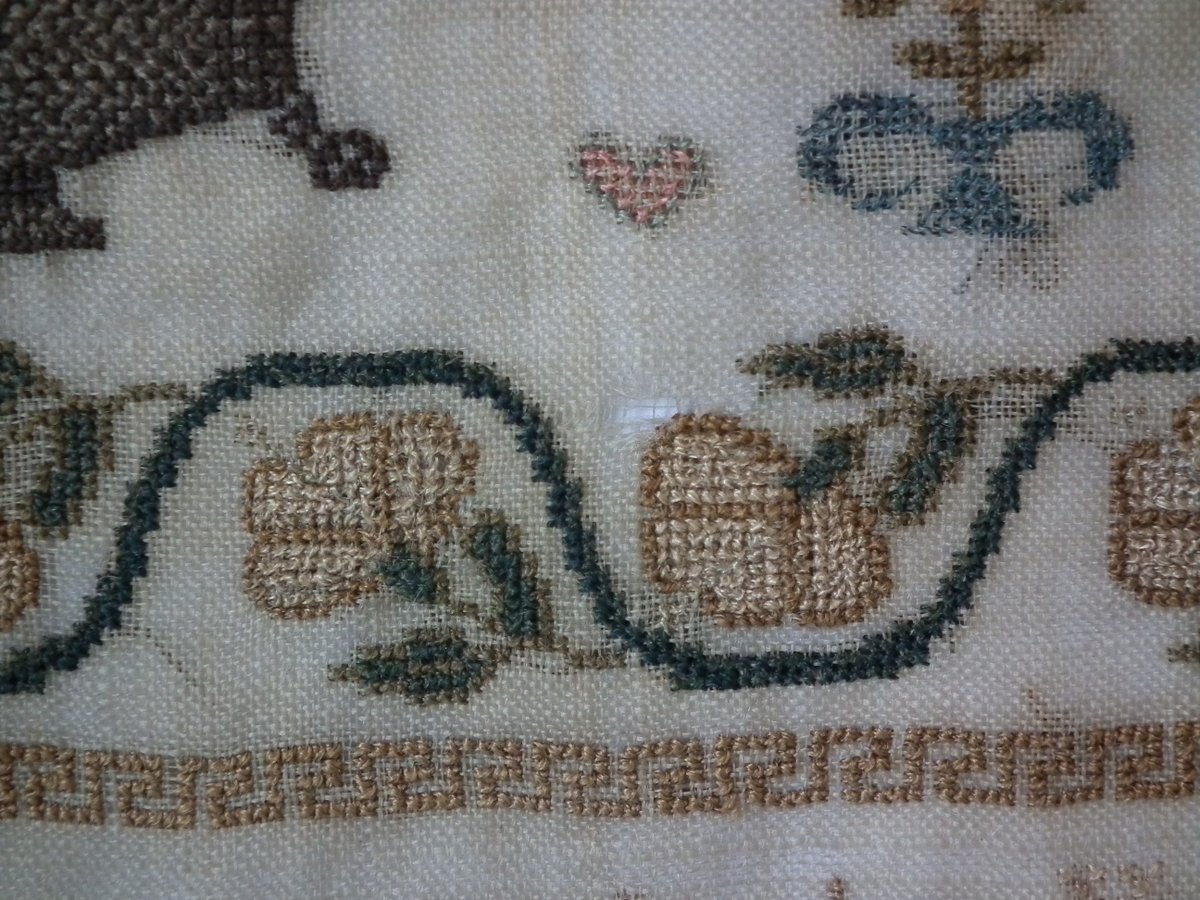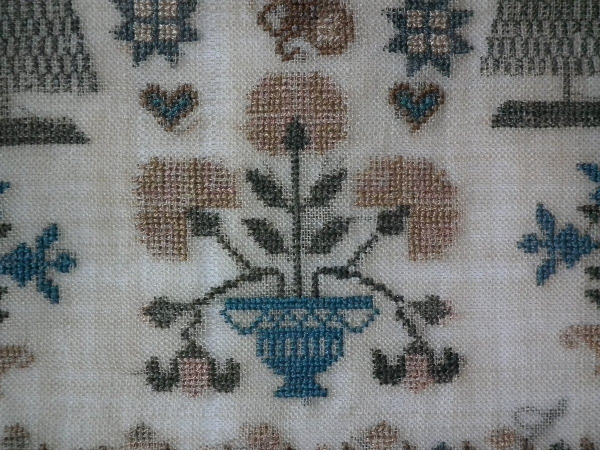The sampler is worked in silk on linen ground, in cross stitch throughout.
