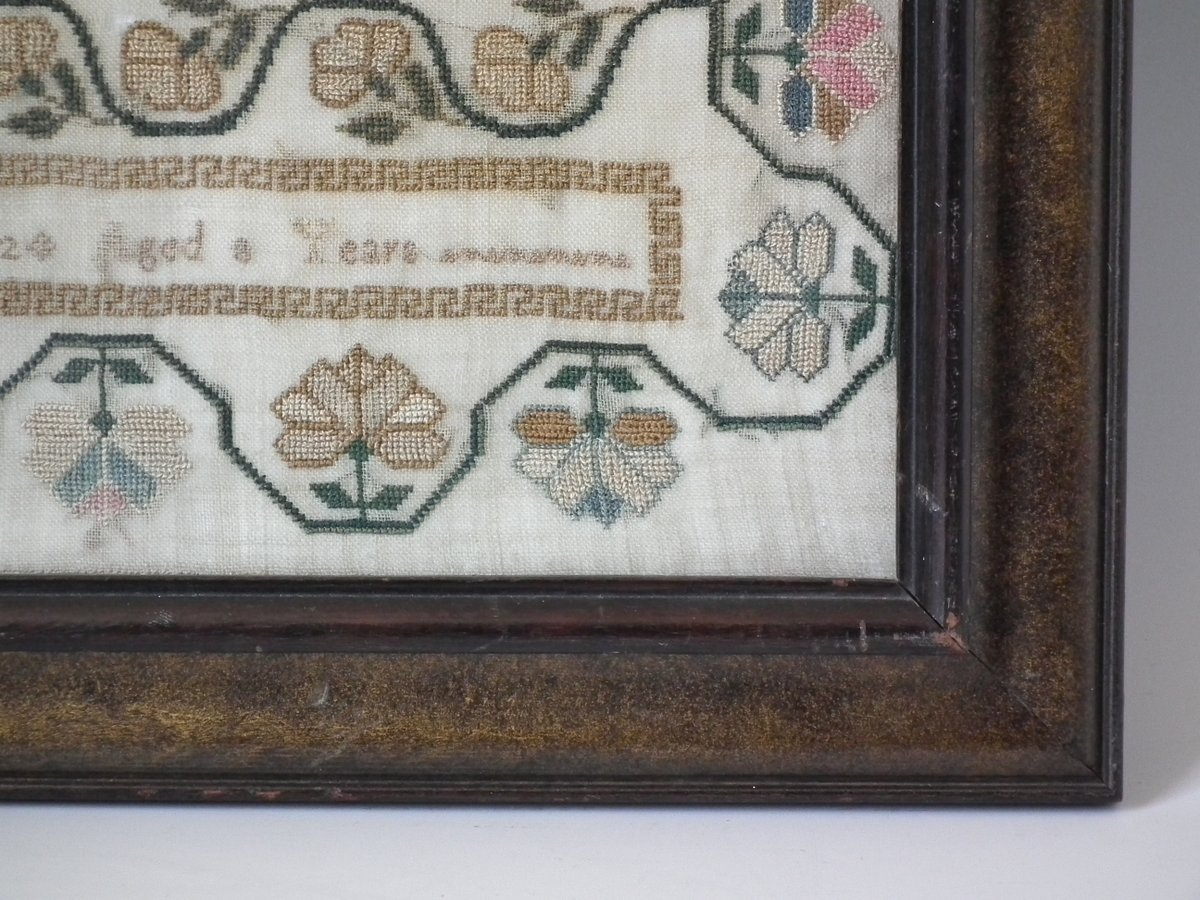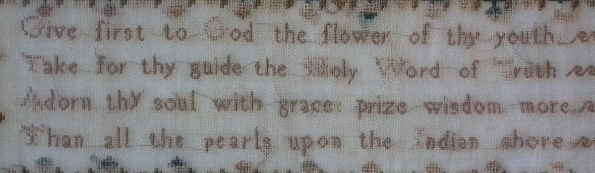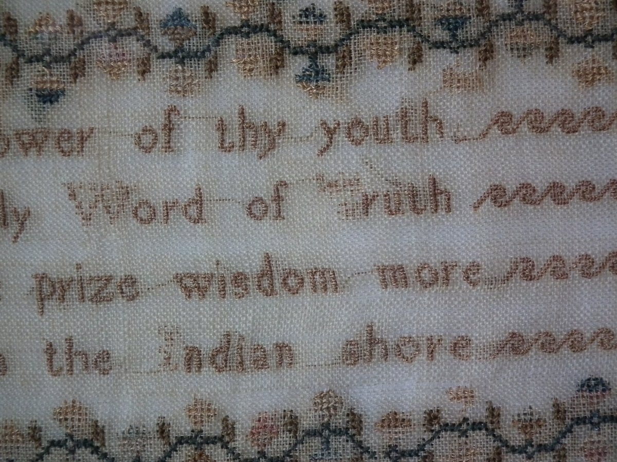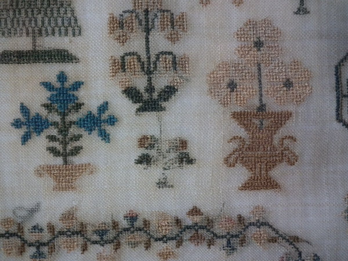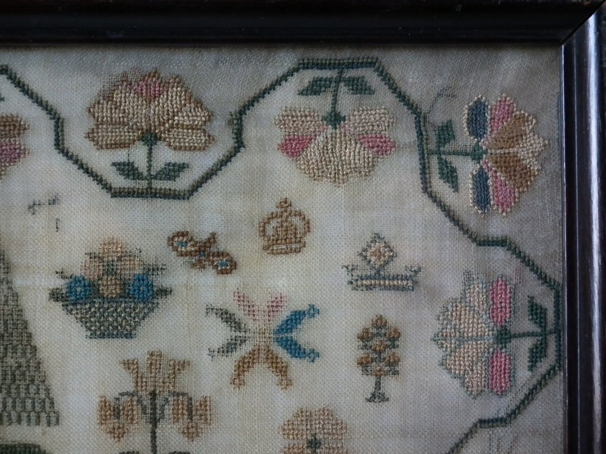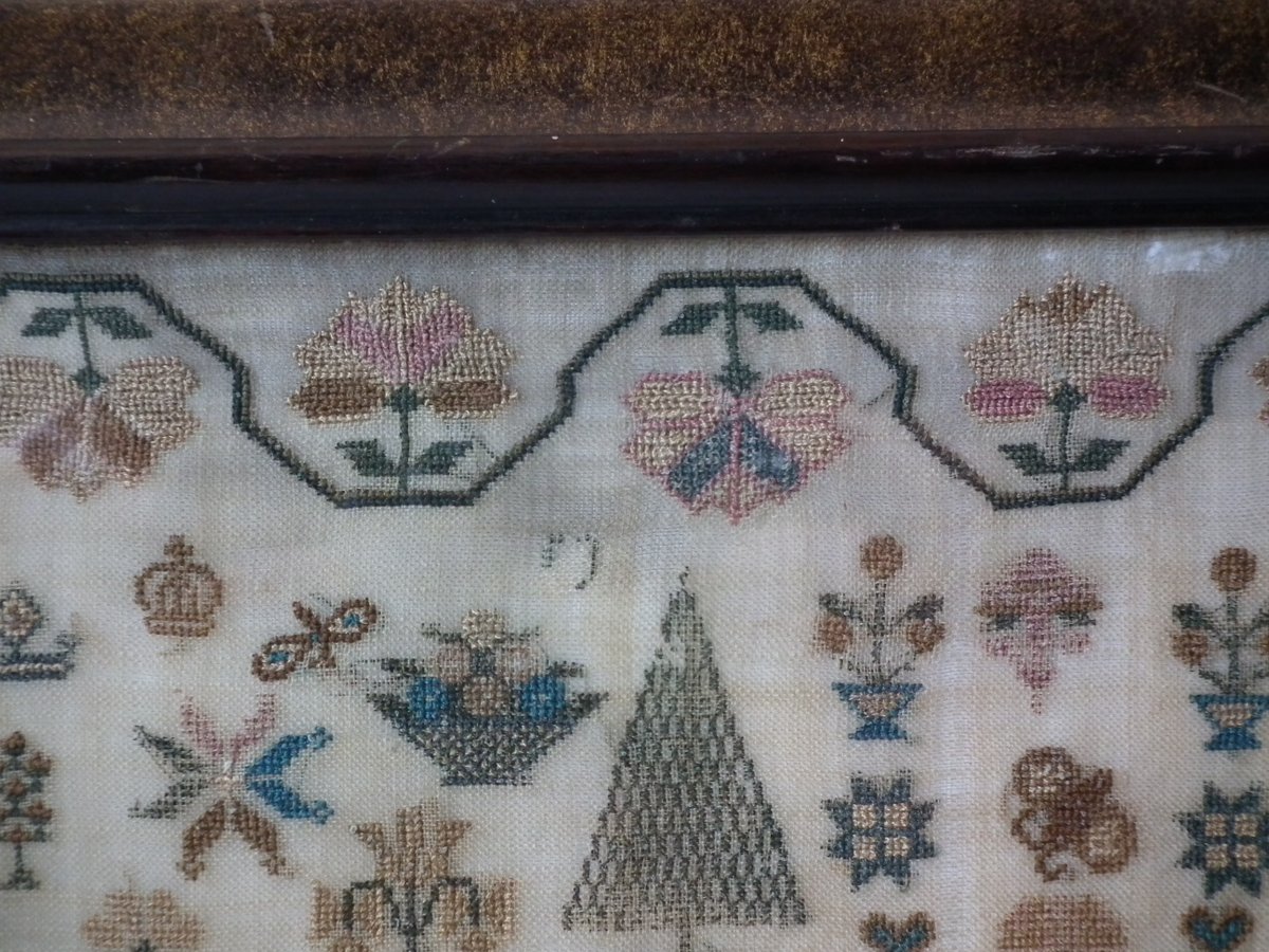 The sampler is worked in silk on linen ground, in cross stitch throughout.