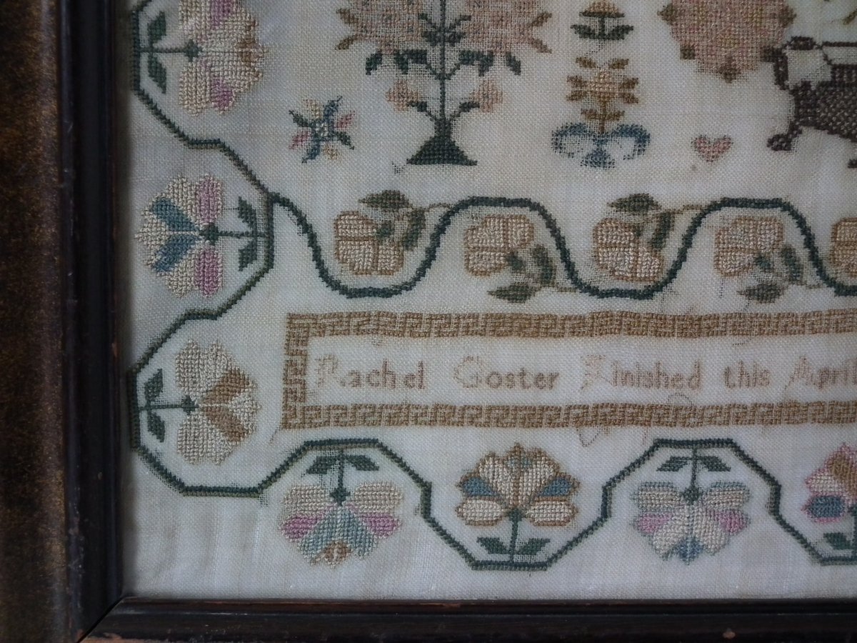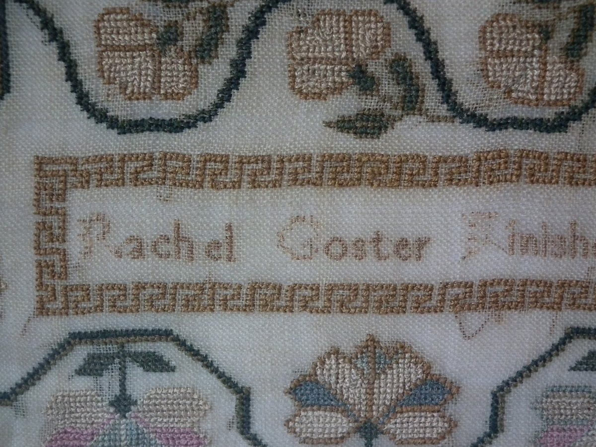 William IV, dated 1832. 15.5ins by 12.5ins wide. 1832 Sampler by Rachel Goster. Framed in an old wood frame with rippled, old glass.