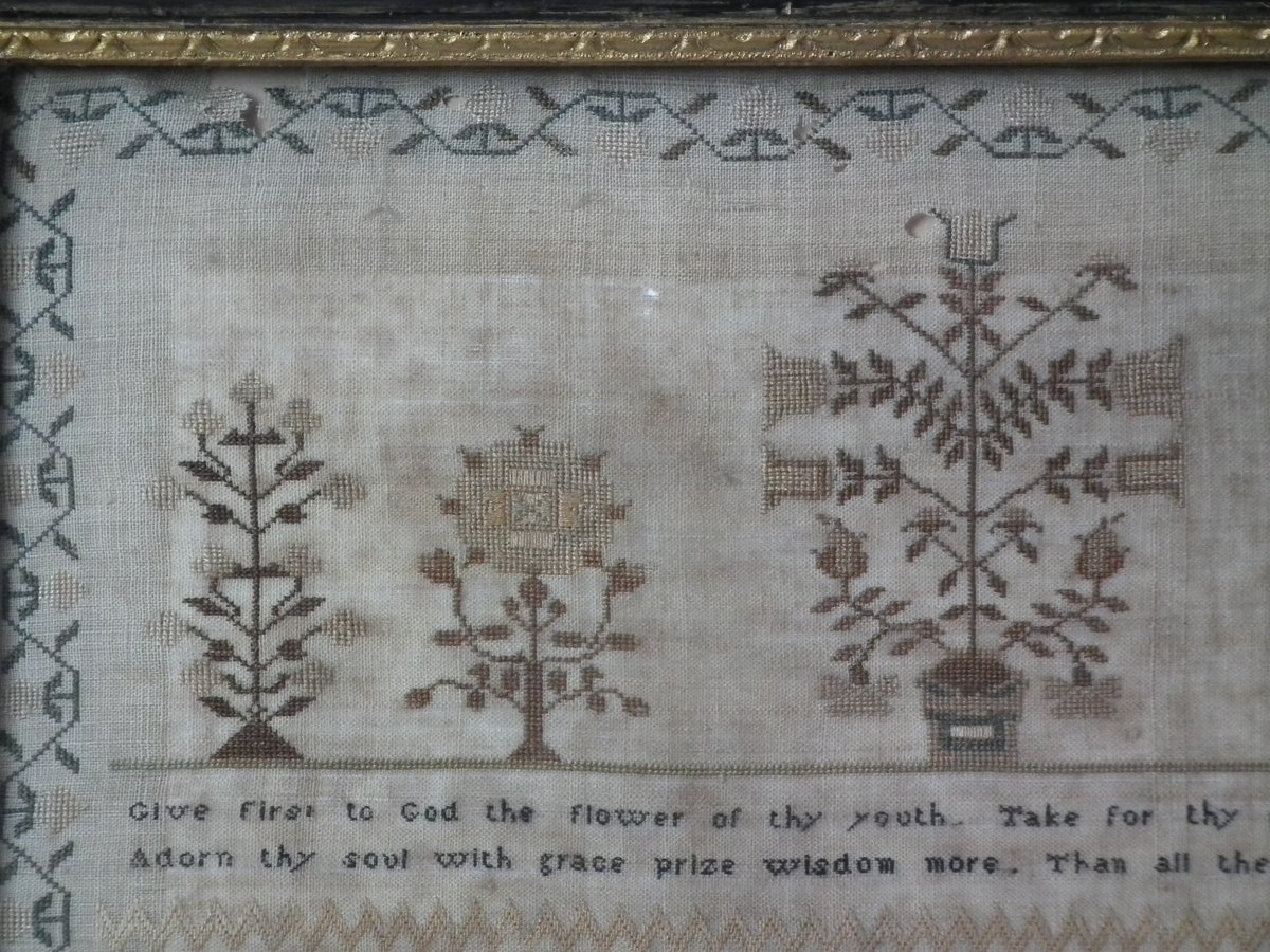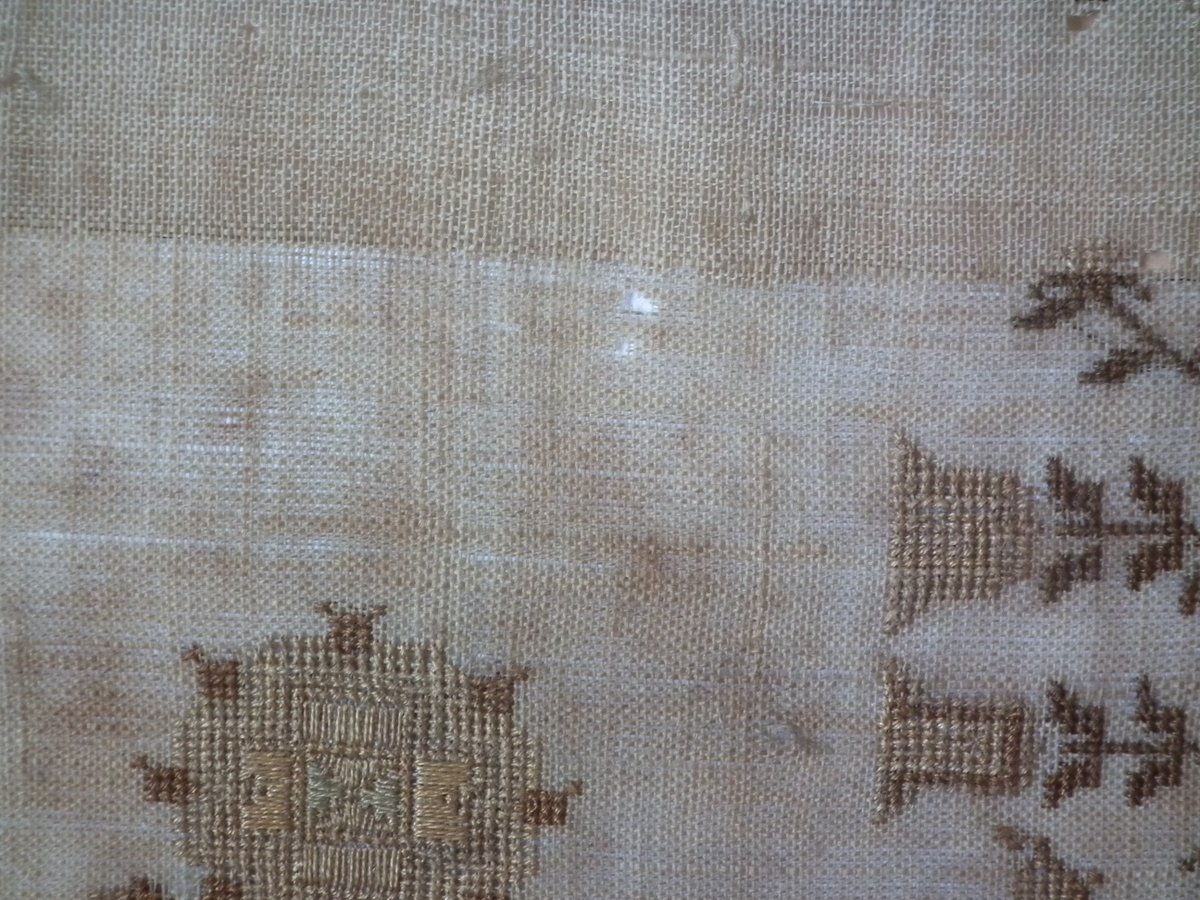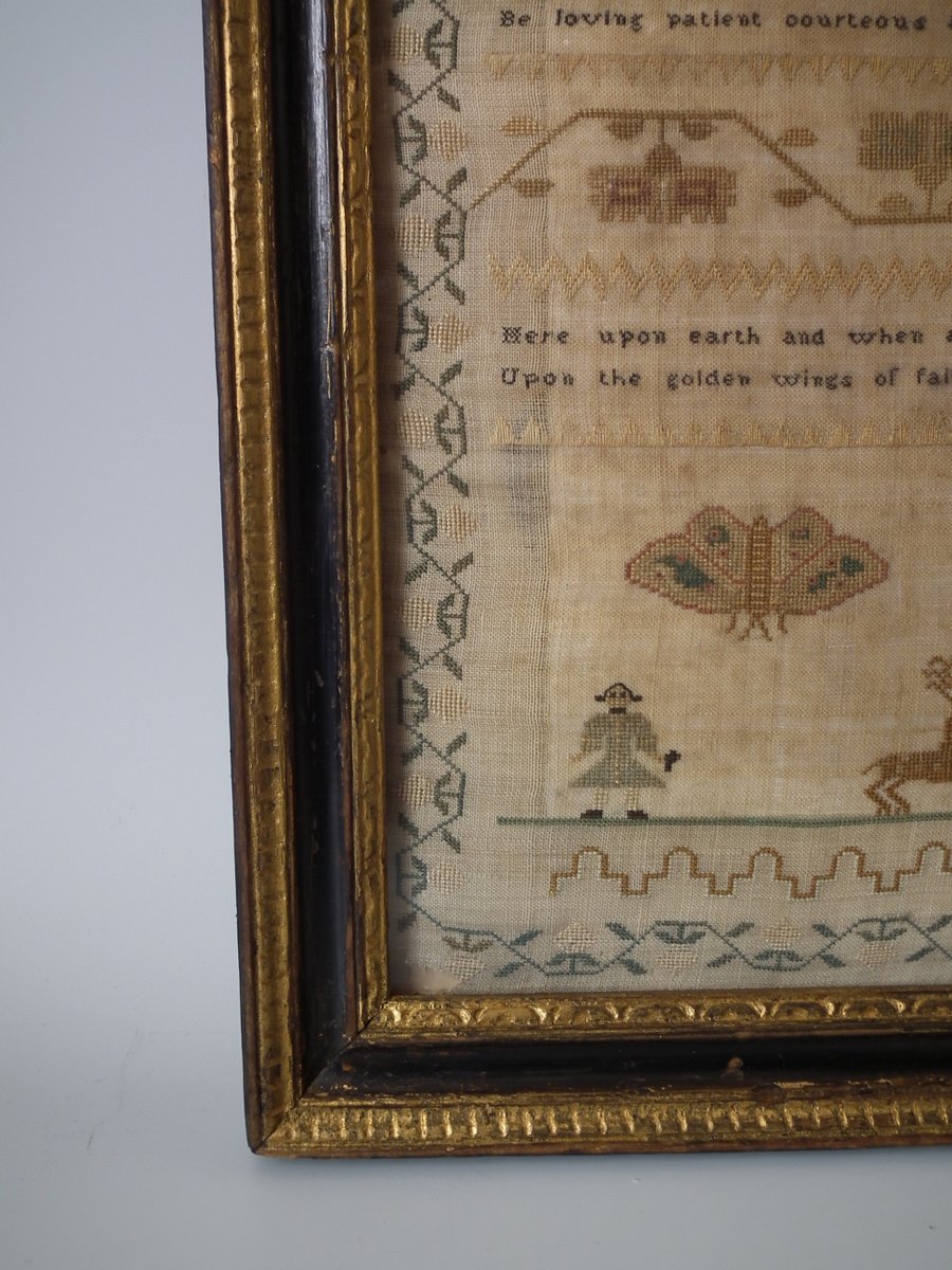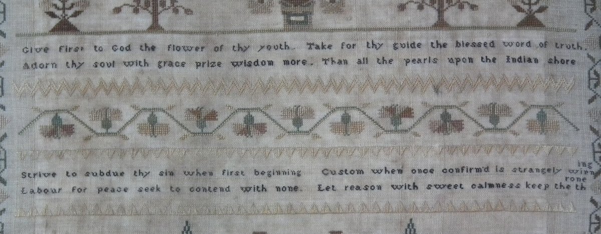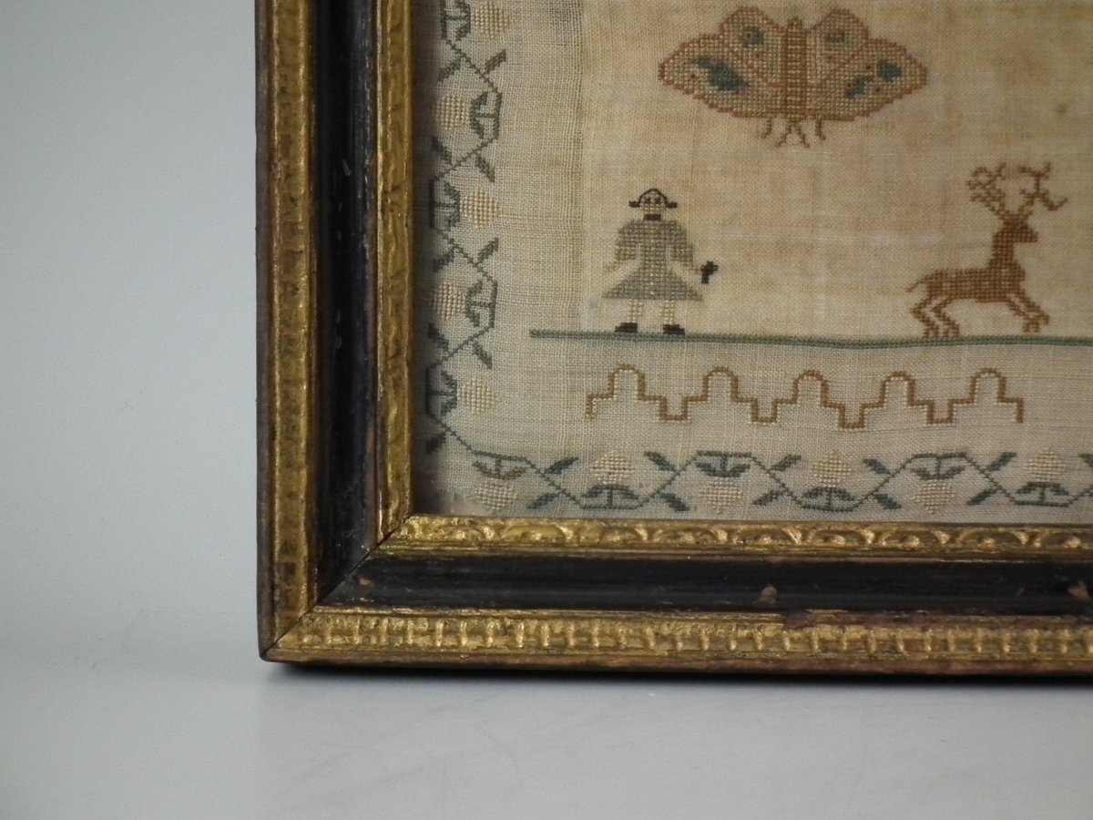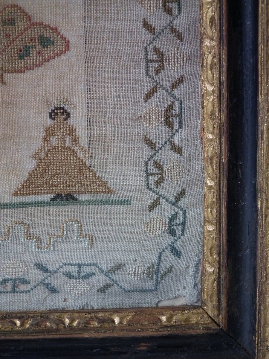 The sampler is worked in silk on linen ground, in a variety of stitches.